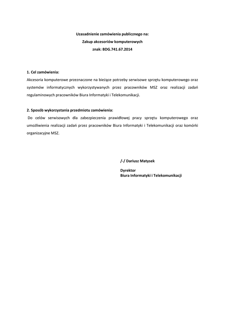 Uzasadnienie zamówienia publicznego na: Zakup akcesoriów komputerowych znak: BDG.741.67.2014 1. Cel zamówienia: Akcesoria komputerowe przeznaczone na bieżące potrzeby serwisowe sprzętu komputerowego oraz systemów informatycznych wykorzystywanych przez pracowników MSZ oraz realizacji zadań regulaminowych pracowników Biura Informatyki i Telekomunikacji. 2. Sposób wykorzystania przedmiotu zamówienia: Do celów serwisowych dla zabezpieczenia prawidłowej pracy sprzętu komputerowego oraz umożliwienia realizacji zadań przez pracowników Biura Informatyki i Telekomunikacji oraz komórki organizacyjne MSZ. /-/ Dariusz Matysek Dyrektor Biura Informatyki i Telekomunikacji