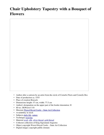 Chair Upholstery Tapestry with a Bouquet of Flowers • • • • • • • • • • • • • • Author after a cartoon by an artist from the circle of Cornelis Floris and Cornelis Bos Date of production ca. 1555 Place of creation Brussels Dimensions height: 57 cm, width: 77.5 cm Author's designation on the upper part of the border denotation: D ID no. ZKWawel 110 Museum Wawel Royal Castle – State Art Collection Availability in stock Subjects daily life, nature Technique weaving Material wool, silk, silver thread, gold thread Collector collection of King Sigismund Augustus Object copyright Wawel Royal Castle – State Art Collection Digital images copyright public domain • Digitalisation RDW MIC, Digitalisation of the most significant tapestries from the collection of Wawel Royal Castle project • Tags Wawel, dwór, renesans, tkanina, 3D plus, król, rośliny This small tapestry belongs to a group of textiles intended as chair upholstery. It shows a colourful bouquet of flowers in a vase decorated with animal masks and small golden garlands. The flowers in the vase are probably large twocoloured irises interwoven with blooms of clematis with dark green leaves. The composition is complemented with blue periwinkles. In the corners of the tapestry, lion masks are placed on the border of interwoven ribbons filled with a floral ornament. The border ornament is characteristic of the entire collection. Elaborated by Magdalena Ozga (Wawel Royal Castle), editorial team of Małopolska’s Virtual Museums, CCBY 3.0 PL Textile Decoration of Interiors. Groups of Small Tapestries from the Collection of Sigismund Augustus and Their Function Decorative textiles, such as tapestries, constituted a decoration for chambers of the Royal Residence, adding splendour and a stately nature thereto. All tapestries commissioned by King Sigismund Augustus, from largeformat to quite small ones, had specific functions in the residence interiors, aside from their artistic value. Forms and sizes of certain categories of textiles were adjusted directly to the place of their destination; therefore, they were closely related to architecture. These groups include small tapestries complementing the decor of the castle interiors, namely overwindow, underwindow, overdoor and upholstery tapestries. Textiles in a shape similar to a rectangle, ended with a segmental arch, could serve as overwindow tapestries, mounted over the upper straightended window frame (see: Tapestry with the Arms of Poland on a Landscape Background with Animals – a Dormouse and a doglike Predator ) and overdoor tapestries mounted above a doorway lintel (see: Tapestry with the Arms of Lithuania on a Landscape Background with Animals ‒ Spotted Hyena and Monkey ). It was different in the case of overwindow tapestries intended to hang “over arches.” These were the arcade tapestries (in formam arcus), which, being in the shape of a semicircularlyended window frame, were cut in the form of an arc at the bottom and were straight at the top. At present, in the Wawel Royal Castle – State Art Collection there are only fragments (e.g. arch areas) of such tapestries, since the straps joining them into a whole were cut out in the nineteenth century during their stay in Russia (see: Tapestry with Figures holding Cornuncopias). The only tapestry of this type preserved as a whole is now in the collection of the Rijksmuseum in Amsterdam. Its large spread (a width of 420 cm) lets one guess its function – it could have been a decoration of a span of an arcaded courtyard, a very wide portal or a pair of windows. However, researchers believe that among this group of textiles there were also smaller over window tapestries with the width of a single window frame. Narrow, elongated and rectangular textiles also constituted a window decoration, but they were a bottom adornment, hence their name – underwindow tapestries (see: Tapestry with MusicMaking Figures). There is evidence to suggest that they could function as a cover for the sides of deep window frames. According to inventories, underwindow tapestries were also used to cover benches or chests. The last group is made up of upholstery tapestries, eleven pieces of which have survived to this day. These tapestries were smallest in size and had a completely practical function, namely they formed coverings of seats or backs of chairs, as well as cushions (see: Chair Upholstery Tapestry with a Bouquet of Flowers). Currently, only part of the collection of this kind of small tapestry, once numbering seventeen sets of decorations of large windows alone, is in the Wawel collection. Main narratives of this group of textiles was focused primarily on grotesque (underwindow, over window and furniture tapestries), on a decorative function, as well as on heraldry (overwindow and over door tapestries), having representative significance associated with the political agenda of the ruler. With reference to the latter, among furniture tapestries there are also monogram textiles, with the initials of the king – SA (Sigismundus Augustus). Elaborated by Paulina Kluz (Editorial Team of Małopolska's Virtual Museums), CCBY 3.0 PL Bibliography: Magdalena Piwocka, Arrasy z groteskami (Tapestries with grotesques), [in:] Arrasy wawelskie (The Wawel Tapestries), edited by Jerzy Szablowski, Anna MisiągBocheńska, Maria HennelBernasikowa, Magdalena Piwocka, Warszawa 1994, pp. 271–348; Magdalena Piwocka, Arrasy Zygmunta Augusta (The Tapestries of Sigismund Augustus), Kraków 2007. Tags: furniture, Renaissance, manor house, everyday life, Wawel, ornament, authority, King Historia kolekcji arrasów Zygmunta Augusta Zygmunt August zamówił część tkanin prawdopodobnie około 1548 roku. Według Wychwalnika weselnego Stanisława Orzechowskiego (Panagyricus Nuptiarum Sigimundi Augusti Poloniae Regis, wyd. 1553) trzy serie tapiserii (Dzieje pierwszych rodziców, Dzieje Mojżesza i Dzieje Noego) już 30 lipca 1553 roku zdobił