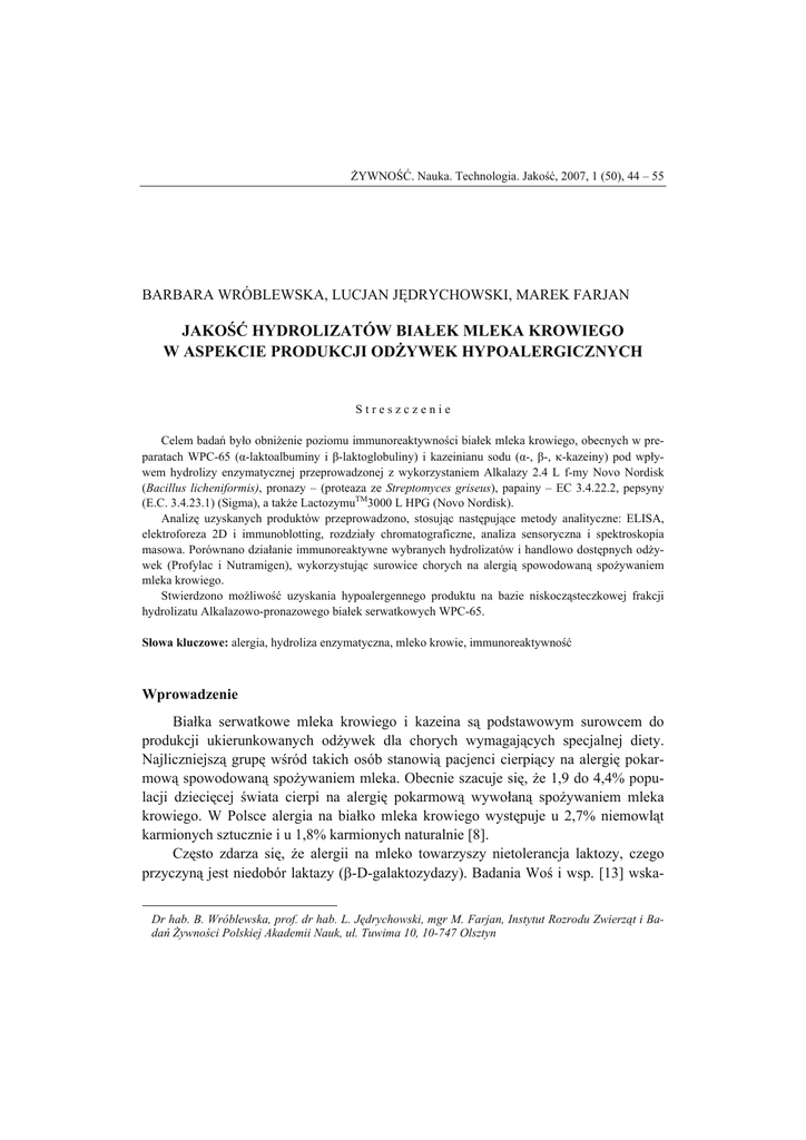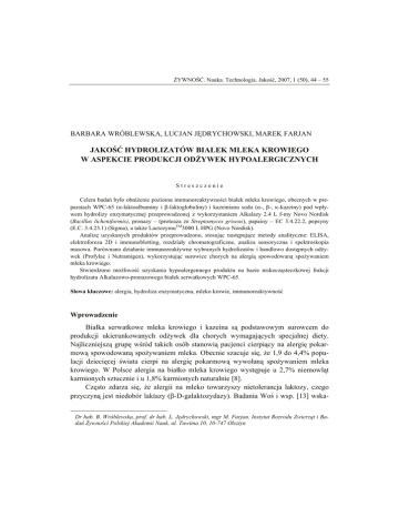 JAKOŚĆ HYDROLIZATÓW BIAŁEK MLEKA KROWIEGO W