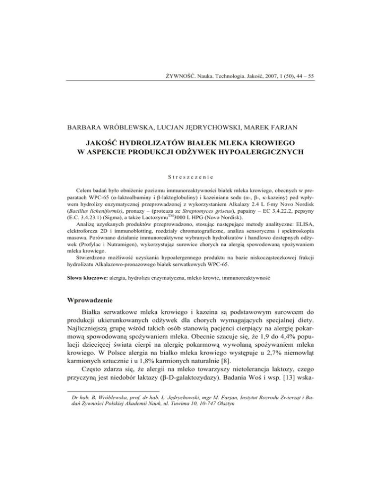 ĩYWNOĝû. Nauka. Technologia. JakoĞü, 2007, 1 (50), 44 – 55 BARBARA WRÓBLEWSKA, LUCJAN JĉDRYCHOWSKI, MAREK FARJAN JAKOĝû HYDROLIZATÓW BIAàEK MLEKA KROWIEGO W ASPEKCIE PRODUKCJI ODĩYWEK HYPOALERGICZNYCH Streszczenie Celem badaĔ byáo obniĪenie poziomu immunoreaktywnoĞci biaáek mleka krowiego, obecnych w preparatach WPC-65 (Į-laktoalbuminy i ȕ-laktoglobuliny) i kazeinianu sodu (Į-, ȕ-, N-kazeiny) pod wpáywem hydrolizy enzymatycznej przeprowadzonej z wykorzystaniem Alkalazy 2.4 L f-my Novo Nordisk (Bacillus licheniformis), pronazy – (proteaza ze Streptomyces griseus), papainy – EC 3.4.22.2, pepsyny (E.C. 3.4.23.1) (Sigma), a takĪe LactozymuTM3000 L HPG (Novo Nordisk). AnalizĊ uzyskanych produktów przeprowadzono, stosując nastĊpujące metody analityczne: ELISA, elektroforeza 2D i immunoblotting, rozdziaáy chromatograficzne, analiza sensoryczna i spektroskopia masowa. Porównano dziaáanie immunoreaktywne wybranych hydrolizatów i handlowo dostĊpnych odĪywek (Profylac i Nutramigen), wykorzystując surowice chorych na alergią spowodowaną spoĪywaniem mleka krowiego. Stwierdzono moĪliwoĞü uzyskania hypoalergennego produktu na bazie niskocząsteczkowej frakcji hydrolizatu Alkalazowo-pronazowego biaáek serwatkowych WPC-65. Sáowa kluczowe: alergia, hydroliza enzymatyczna, mleko krowie, immunoreaktywnoĞü Wprowadzenie Biaáka serwatkowe mleka krowiego i kazeina są podstawowym surowcem do produkcji ukierunkowanych odĪywek dla chorych wymagających specjalnej diety. Najliczniejszą grupĊ wĞród takich osób stanowią pacjenci cierpiący na alergiĊ pokarmową spowodowaną spoĪywaniem mleka. Obecnie szacuje siĊ, Īe 1,9 do 4,4% populacji dzieciĊcej Ğwiata cierpi na alergiĊ pokarmową wywoáaną spoĪywaniem mleka krowiego. W Polsce alergia na biaáko mleka krowiego wystĊpuje u 2,7% niemowląt karmionych sztucznie i u 1,8% karmionych naturalnie [8]. CzĊsto zdarza siĊ, Īe alergii na mleko towarzyszy nietolerancja laktozy, czego przyczyną jest niedobór laktazy (E-D-galaktozydazy). Badania WoĞ i wsp. [13] wskaDr hab. B. Wróblewska, prof. dr hab. L. JĊdrychowski, mgr M. Farjan, Instytut Rozrodu Zwierząt i BadaĔ ĩywnoĞci Polskiej Akademii Nauk, ul. Tuwima 10, 10-747 Olsztyn JAKOĝû HYDROLIZATÓW BIAàEK MLEKA KROWIEGO W ASPEKCIE PRODUKCJI ODĩYWEK… 45 zują, Īe nietolerancja laktozy wystĊpuje u 40% dzieci, u których wczeĞniej stwierdzono alergiĊ na biaáka mleka krowiego. Hydroliza enzymatyczna biaáek mleka to najczĊĞciej stosowana modyfikacja podczas produkcji odĪywek hypoalergicznych. Dochodzi wówczas do rozerwania niektórych wiązaĔ peptydowych w obrĊbie sekwencji epitopów konformacyjnych. MoĪliwoĞü Ğcisáej kontroli warunków procesu proteolizy pozwala na otrzymywanie produktów o okreĞlonym i przewidywalnym stopniu hydrolizy, poĪądanych masach cząsteczkowych poszczególnych frakcji oraz okreĞlonej zawartoĞci wolnych aminokwasów. Zasadniczą wadą metody jest powstawanie peptydów o gorzkim smaku, nadających specyficzne cechy sensoryczne, trudne do zaakceptowania. PodjĊte badania miaáy na celu uzyskanie hydrolizatu biaákowego o obniĪonym stopniu alergizacji, mogącego stanowiü skáadnik odĪywki hypoalergicznej dla dzieci atopowych. Materiaá i metody badaĔ Do badaĔ uĪyto preparatu biaáek serwatkowych WPC-65 oraz kazeinianu sodu, pochodzących z firmy Laktopol w Suwaákach. W celu przeprowadzenia hydrolizy biaáek mleka zastosowano: pronazĊ – EC 3.4.24.31 (proteaza ze Streptomyces griseus, Sigma P 8811), AlkalazĊ 2,4 L FG f-my Novo Nordisk (proteaza z Bacillus licheniformis), papainĊ – EC 3.4.22.2 (Sigma P 3375), pepsynĊ - E.C. 3.4.23.1, (Sigma P 7000) oraz LactozymTM3000 L HPG (Novo Nordisk) obniĪający zawartoĞü laktozy, cukru wywoáującego nietolerancjĊ pokarmową. Proces hydrolizy prowadzono wg metodyki przedstawionej we wczeĞniejszych pracach [14, 15, 16]. Rozdziaá hydrolizatów preparatów biaáek serwatkowych i kazeinianu sodu z uĪyciem Īelu Sephadex G-75 W chromatografii Īelowej zastosowano kolumnĊ chromatograficzną (85 cm x 3 cm) o objĊtoĞci 600 ml, firmy Pharmacia LKB (Uppsala, Szwecja), wypeánioną Īelem Sephadex G-75. Na szczyt kolumny nanoszono próbĊ o stĊĪeniu 70 mg/ml. Eluat zbierano po 5 ml do probówek umieszczonych w kolektorze frakcji (Pharmacie LKBFRAC-100, Uppsala, Szwecja). AbsorbancjĊ mierzono przy dáugoĞci fali 214 i 280 nm w aparacie Spectrophotometer Dn 7500 (Beckman). Chromatografia frakcji hydrolizatów o masach cząsteczkowych poniĪej 14,4·103Da w systemie FPLC z uĪyciem kolumny SuperdexTM Peptide HR 10/30 Rozdziaá wykonywano na kolumnie SuperdexTM Peptide HR 10/30 (firmy Amersham Pharmacia Biotech) z uĪyciem zestawu do FPLC (Pharmacia LKB Pump P500, Controller LCC-501 Plus). Próby przed naniesieniem na szczyt kolumny filtrowano przez filtry Millex® GV (firmy Millipor) o Ğrednicy porów 0,22 ȝm. Rozdziaá pro- 46 Barbara Wróblewska, Lucjan JĊdrychowski, Marek Farjan wadzono z szybkoĞcią 0,2 ml eluatu na min, a absorbancjĊ odczytywano przy dáugoĞci fali 214 nm. Dwukierunkowa elektroforeza (IEF oraz SDS-PAGE), KEKI, Budapeszt Pierwszy kierunek rozdziaáu biaáek (IEF) prowadzono w Īelu w gradiencie pH, na pasku IPG (nakáadano 0,7-0,9 mg próby na kaĪdy pasek). Próby byáy rozpuszczane w 250 ȝl buforu rehydratacyjnego (8 mol/L mocznik, 1% CHAPS, 20 mmol/l DTT), [4, 12]. Rozdziaá prowadzono w urządzeniu pHaser do izoelektrofokusingu (Bio-Rad PROTEAN IEF Cell). Po osiągniĊciu równowagi, pasek inkubowano w 1,5 ml roztworu 6 mol/l mocznik, 375 mmol/l Tris, 130 mmol/l DTT, 2% SDS, 20% glicerolu i delikatnie wytrząsana przez 10 min, w temp. pokojowej, a nastĊpnie wykonywano rozdziaá biaáek w drugim kierunku metodą SDS-PAGE w Īelu cienkowarstwowym (75 mm x 83 mm x 1,5 mm) w aparacie Mini-protean II-cell. StĊĪenie akrylamidu w Īelu rozdzielającym wynosiáo 15%. Po zakoĔczeniu rozdziaáu, Īele przemyto 20% roztworem TC