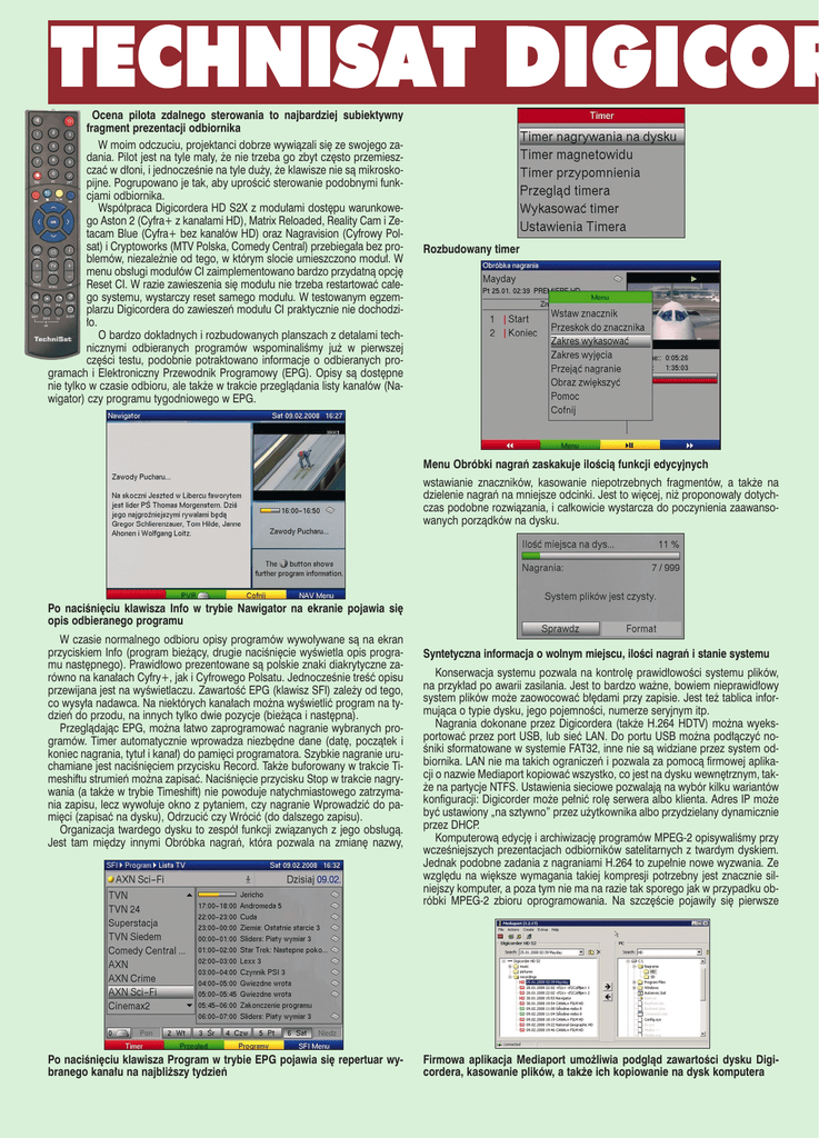 TECHNISAT DIGICOR Ocena pilota zdalnego sterowania to najbardziej subiektywny fragment prezentacji odbiornika W moim odczuciu, projektanci dobrze wywi¹zali siê ze swojego zadania. Pilot jest na tyle ma³y, ¿e nie trzeba go zbyt czêsto przemieszczaæ w d³oni, i jednoczeœnie na tyle du¿y, ¿e klawisze nie s¹ mikroskopijne. Pogrupowano je tak, aby uproœciæ sterowanie podobnymi funkcjami odbiornika. Wspó³praca Digicordera HD S2X z modu³ami dostêpu warunkowego Aston 2 (Cyfra+ z kana³ami HD), Matrix Reloaded, Reality Cam i Zetacam Blue (Cyfra+ bez kana³ów HD) oraz Nagravision (Cyfrowy Polsat) i Cryptoworks (MTV Polska, Comedy Central) przebiega³a bez problemów, niezale¿nie od tego, w którym slocie umieszczono modu³. W menu obs³ugi modu³ów CI zaimplementowano bardzo przydatn¹ opcjê Reset CI. W razie zawieszenia siê modu³u nie trzeba restartowaæ ca³ego systemu, wystarczy reset samego modu³u. W testowanym egzemplarzu Digicordera do zawieszeñ modu³u CI praktycznie nie dochodzi³o. O bardzo dok³adnych i rozbudowanych planszach z detalami technicznymi odbieranych programów wspominaliœmy ju¿ w pierwszej czêœci testu, podobnie potraktowano informacje o odbieranych programach i Elektroniczny Przewodnik Programowy (EPG). Opisy s¹ dostêpne nie tylko w czasie odbioru, ale tak¿e w trakcie przegl¹dania listy kana³ów (Nawigator) czy programu tygodniowego w EPG. Rozbudowany timer Menu Obróbki nagrañ zaskakuje iloœci¹ funkcji edycyjnych wstawianie znaczników, kasowanie niepotrzebnych fragmentów, a tak¿e na dzielenie nagrañ na mniejsze odcinki. Jest to wiêcej, ni¿ proponowa³y dotychczas podobne rozwi¹zania, i ca³kowicie wystarcza do poczynienia zaawansowanych porz¹dków na dysku. Po naciœniêciu klawisza Info w trybie Nawigator na ekranie pojawia siê opis odbieranego programu W czasie normalnego odbioru opisy programów wywo³ywane s¹ na ekran przyciskiem Info (program bie¿¹cy, drugie naciœniêcie wyœwietla opis programu nastêpnego). Prawid³owo prezentowane s¹ polskie znaki diakrytyczne zarówno na kana³ach Cyfry+, jak i Cyfrowego Polsatu. Jednoczeœnie treœæ opisu przewijana jest na wyœwietlaczu. Zawartoœæ EPG (klawisz SFI) zale¿y od tego, co wysy³a nadawca. Na niektórych kana³ach mo¿na wyœwietliæ program na tydzieñ do przodu, na innych tylko dwie pozycje (bie¿¹ca i nastêpna). Przegl¹daj¹c EPG, mo¿na ³atwo zaprogramowaæ nagranie wybranych programów. Timer automatycznie wprowadza niezbêdne dane (datê, pocz¹tek i koniec nagrania, tytu³ i kana³) do pamiêci programatora. Szybkie nagranie uruchamiane jest naciœniêciem przycisku Record. Tak¿e buforowany w trakcie Timeshiftu strumieñ mo¿na zapisaæ. Naciœniêcie przycisku Stop w trakcie nagrywania (a tak¿e w trybie Timeshift) nie powoduje natychmiastowego zatrzymania zapisu, lecz wywo³uje okno z pytaniem, czy nagranie Wprowadziæ do pamiêci (zapisaæ na dysku), Odrzuciæ czy Wróciæ (do dalszego zapisu). Organizacja twardego dysku to zespó³ funkcji zwi¹zanych z jego obs³ug¹. Jest tam miêdzy innymi Obróbka nagrañ, która pozwala na zmianê nazwy, Po naciœniêciu klawisza Program w trybie EPG pojawia siê repertuar wybranego kana³u na najbli¿szy tydzieñ Syntetyczna informacja o wolnym miejscu, iloœci nagrañ i stanie systemu Konserwacja systemu pozwala na kontrolê prawid³owoœci systemu plików, na przyk³ad po awarii zasilania. Jest to bardzo wa¿ne, bowiem nieprawid³owy system plików mo¿e zaowocowaæ b³êdami przy zapisie. Jest te¿ tablica informuj¹ca o typie dysku, jego pojemnoœci, numerze seryjnym itp. Nagrania dokonane przez Digicordera (tak¿e H.264 HDTV) mo¿na wyeksportowaæ przez port USB, lub sieæ LAN. Do portu USB mo¿na pod³¹czyæ noœniki sformatowane w systemie FAT32, inne nie s¹ widziane przez system odbiornika. LAN nie ma takich ograniczeñ i pozwala za pomoc¹ firmowej aplikacji o nazwie Mediaport kopiowaæ wszystko, co jest na dysku wewnêtrznym, tak¿e na partycje NTFS. Ustawienia sieciowe pozwalaj¹ na wybór kilku wariantów konfiguracji: Digicorder mo¿e pe³niæ rolê serwera albo klienta. Adres IP mo¿e byæ ustawiony „na sztywno” przez u¿ytkownika albo przydzielany dynamicznie przez DHCP. Komputerow¹ edycjê i archiwizacjê programów MPEG-2 opisywaliœmy przy wczeœniejszych prezentacjach odbiorników satelitarnych z twardym dyskiem. Jednak podobne zadania z nagraniami H.264 to zupe³nie nowe wyzwania. Ze wzglêdu na wiêksze wymagania takiej kompresji potrzebny jest znacznie silniejszy komputer, a poza tym nie ma na razie tak sporego jak w przypadku obróbki MPEG-2 zbioru oprogramowania. Na szczêœcie pojawi³y siê pierwsze Firmowa aplikacja Mediaport umo¿liwia podgl¹d zawartoœci dysku Digicordera, kasowanie plików, a tak¿e ich kopiowanie na dysk komputera RDER HD S2X (czêœæ II) Konfiguracja sieciowa Digicordera aplikacje. Podobnie jak to mia³o miejsce w pionierskim okresie cyfrowej telewizji MPEG-2, najbardziej interesuje nas oprogramowanie darmowe, czêsto bowiem programy komercyjne kosztuj¹ maj¹tek, a do amatorskiego u¿ytku nie zawsze potrzebne s¹ ich zaawansowane mo¿liwoœci. H.264 Cutter umo¿liwia podgl¹d ciêcia jeszcze przed jego wykonaniem. Przy wielkich plikach HDTV umo¿liwia to wczeœniejsze sprawdzenie edycji i w razie znalezienia b³êdu oszczêdza sporo czasu klawisz Find PIDs. Jeœli identyfikacja pidów video i audio przebiegnie prawid³owo, mo¿na przyst¹piæ do skanowania w poszukiwaniu b³êdów i próby naprawienia pliku, w wyniku czego otrzymujemy plik „Fixed” oraz log z informacjami o znalezionych b³êdach. Przy okazji program poprawia w nag³ówku informacje o œcie¿kach audio, w wyniku czego po „przepuszczeniu” nagrania przez MPEG2REPAIR nie powinno byæ problemów z odczytem fonii w wiêkszoœci playerów (przydaje siê w odtwarzaczach stacjonarnych typu Dvico Twix). TSRemux nie zosta³ wyposa¿ony w podgl¹d obrazu, dlatego czasy do edycji trzeba ust