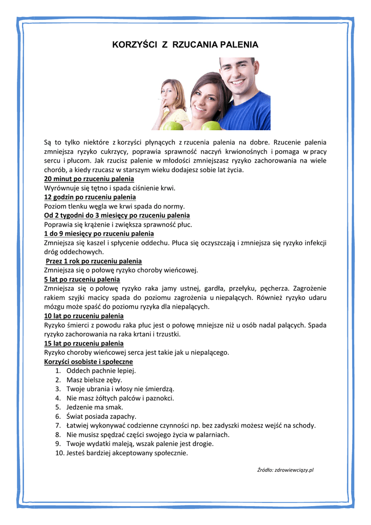 KORZYŚCI Z RZUCANIA PALENIA Są to tylko niektóre z korzyści płynących z rzucenia palenia na dobre. Rzucenie palenia zmniejsza ryzyko cukrzycy, poprawia sprawność naczyń krwionośnych i pomaga w pracy sercu i płucom. Jak rzucisz palenie w młodości zmniejszasz ryzyko zachorowania na wiele chorób, a kiedy rzucasz w starszym wieku dodajesz sobie lat życia. 20 minut po rzuceniu palenia Wyrównuje się tętno i spada ciśnienie krwi. 12 godzin po rzuceniu palenia Poziom tlenku węgla we krwi spada do normy. Od 2 tygodni do 3 miesięcy po rzuceniu palenia Poprawia się krążenie i zwiększa sprawność płuc. 1 do 9 miesięcy po rzuceniu palenia Zmniejsza się kaszel i spłycenie oddechu. Płuca się oczyszczają i zmniejsza się ryzyko infekcji dróg oddechowych. Przez 1 rok po rzuceniu palenia Zmniejsza się o połowę ryzyko choroby wieńcowej. 5 lat po rzuceniu palenia Zmniejsza się o połowę ryzyko raka jamy ustnej, gardła, przełyku, pęcherza. Zagrożenie rakiem szyjki macicy spada do poziomu zagrożenia u niepalących. Również ryzyko udaru mózgu może spaść do poziomu ryzyka dla niepalących. 10 lat po rzuceniu palenia Ryzyko śmierci z powodu raka płuc jest o połowę mniejsze niż u osób nadal palących. Spada ryzyko zachorowania na raka krtani i trzustki. 15 lat po rzuceniu palenia Ryzyko choroby wieńcowej serca jest takie jak u niepalącego. Korzyści osobiste i społeczne 1. Oddech pachnie lepiej. 2. Masz bielsze zęby. 3. Twoje ubrania i włosy nie śmierdzą. 4. Nie masz żółtych palców i paznokci. 5. Jedzenie ma smak. 6. Świat posiada zapachy. 7. Łatwiej wykonywać codzienne czynności np. bez zadyszki możesz wejść na schody. 8. Nie musisz spędzać części swojego życia w palarniach. 9. Twoje wydatki maleją, wszak palenie jest drogie. 10. Jesteś bardziej akceptowany społecznie. Źródło: zdrowiewciązy.pl