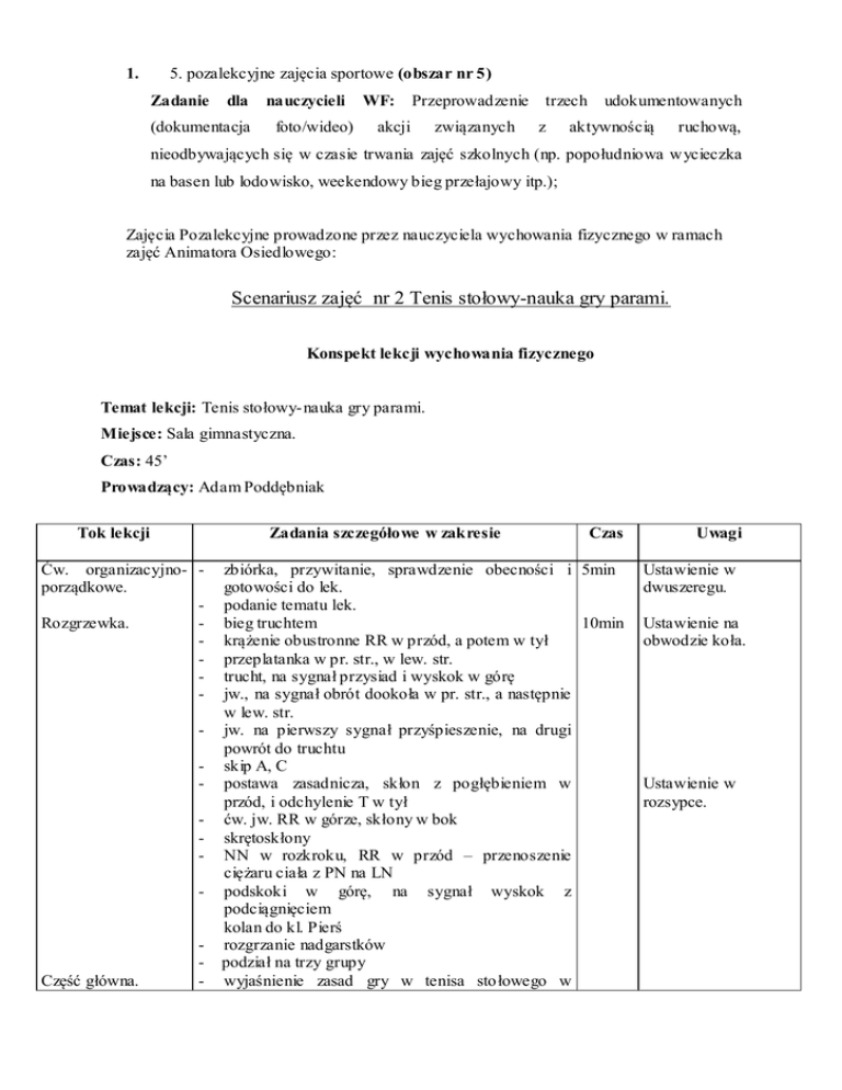 5. pozalekcyjne zajęcia sportowe (obszar nr 5) 1. Zadanie dla (dokumentacja nauczycieli foto/wideo) WF: Przeprowadzenie trzech akcji związanych z udokumentowanych aktywnością ruchową, nieodbywających się w czasie trwania zajęć szkolnych (np. popołudniowa wycieczka na basen lub lodowisko, weekendowy bieg przełajowy itp.); Zajęcia Pozalekcyjne prowadzone przez nauczyciela wychowania fizycznego w ramach zajęć Animatora Osiedlowego: Scenariusz zajęć nr 2 Tenis stołowy-nauka gry parami. Konspekt lekcji wychowania fizycznego Temat lekcji: Tenis stołowy- nauka gry parami. Miejsce: Sala gimnastyczna. Czas: 45’ Prowadzący: Adam Poddębniak Zadania szczegółowe w zakresie Tok lekcji Ćw. organizacyjno- porządkowe. Rozgrzewka. - Część główna. - Czas zbiórka, przywitanie, sprawdzenie obecności i 5min gotowości do lek. podanie tematu lek. bieg truchtem 10min krążenie obustronne RR w przód, a potem w tył przeplatanka w pr. str., w lew. str. trucht, na sygnał przysiad i wyskok w górę jw., na sygnał obrót dookoła w pr. str., a następnie w lew. str. jw. na pierwszy sygnał przyśpieszenie, na drugi powrót do truchtu skip A, C postawa zasadnicza, skłon z pogłębieniem w przód, i odchylenie T w tył ćw. jw. RR w górze, skłony w bok skrętoskłony NN w rozkroku, RR w przód – przenoszenie ciężaru ciała z PN na LN podskoki w górę, na sygnał wyskok z podciągnięciem kolan do kl. Pierś rozgrzanie nadgarstków podział na trzy grupy wyjaśnienie zasad gry w tenisa stołowego w Uwagi Ustawienie w dwuszeregu. Ustawienie na obwodzie koła. Ustawienie w rozsypce. Część końcowa. - parach ustawienie przy stole w parach 25min ćw. podstawowych elementów gry nauka serwisu gra uproszczona – w parach rozegrania krótkiego meczu do pięciu punktów ćw. zwinnościowo – rozciągające w parach kształtowanie siły mm RR poprzez ćw. z hantlami, sprężynami i ciężarkami złożenie przyborów 5min zbiórka, omówienie lek. pożegnanie Ustawienie w szeregu.