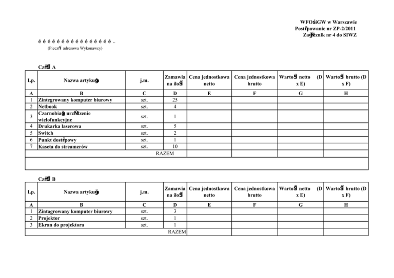 WFOŚiGW w Warszawie Postępowanie nr ZP-2/2011 Załącznik nr 4 do SIWZ ………………………………………….. (Pieczęć adresowa Wykonawcy) Część A Lp. Nazwa artykułu A B 1 Zintegrowany komputer biurowy 2 Netbook Czarnobiałe urządzenie 3 wielofunkcyjne 4 Drukarka laserowa 5 Switch 6 Punkt dostępowy 7 Kaseta do streamerów j.m. Zamawia Cena jednostkowa Cena jednostkowa Wartość netto na ilość netto brutto x E) C szt. szt. D 25 4 szt. 1 szt. szt. szt. szt. 5 2 1 10 RAZEM E F G (D Wartość brutto (D x F) H Część B Lp. Nazwa artykułu A B 1 Zintagrowany komputer biurowy 2 Projektor 3 Ekran do projektora j.m. C szt. szt. szt. Zamawia Cena jednostkowa Cena jednostkowa Wartość netto na ilość netto brutto x E) D 3 1 1 RAZEM E F G (D Wartość brutto (D x F) H WFOŚiGW w Warszawie Postępowanie nr ZP-2/2011 Załącznik nr 4 do SIWZ