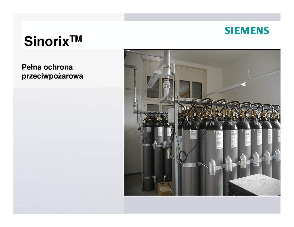 SinorixTM Pełna ochrona przeciwpo arowa Spis tre ci Ogólnie Strona 2 Sinorix Informacje N2 Ar CO2 O gaszeniu ogólnie 3 Sinorix – informacje podstawowe 9 Sinorix N2 14 Ar CO2 Sinorix HFC 227ea, Novec 1230 23 Wybór systemu gaszenia 29 Ochrona rodowiska 31 Konfiguracja systemu 34 Sinorix „H2O Gas Jet” 43 Sinorix al-deco STD 47 Centrala gaszeniowa XC10 55 HFC NOVEC Wybór systemu Ochrona rodowiska© Konfiguracja H2O Gas Jet al-deco STD XC10 Siemens systemu AG 2009. All rights reserved. Building Technologies Spis tre ci Ogólnie Strona 3 Sinorix Informacje N2 Ar CO2 O gaszeniu ogólnie 3 Sinorix – informacje podstawowe 9 Sinorix N2 14 Ar CO2 Sinorix HFC 227ea, Novec 1230 24 Wybór systemu gaszenia 29 Ochrona rodowiska 31 Konfiguracja systemu 34 Sinorix „H2O Gas Jet” 34 Sinorix al-deco STD 47 Centrala gaszeniowa XC10 55 HFC NOVEC Wybór systemu Ochrona rodowiska© Konfiguracja H2O Gas Jet al-deco STD XC10 Siemens systemu AG 2009. All rights reserved. Building Technologies Gaszenie to: detekcja i interwencja SinorixTM ASD Cerberus PRO Wykrycie Gaszenie do 120s 30s 10s - 60s (120s) EN54 EN12094 Ogólnie Ogólnie Strona 4 Sinorix Informacje N2 Ar CO2 HFC NOVEC Systemy gaszenia gazem przeznaczone do gaszenia na wczesnym etapie po aru w celu unikni cia kosztownych zniszcze →Wymagana wczesna aktywacja systemu gaszenia gazem! Wybór systemu Ochrona rodowiska© Konfiguracja H2O Gas Jet al-deco STD XC10 Siemens systemu AG 2009. All rights reserved. Building Technologies Zaawansowana ochrona p.po arowa Profesjonalna, aktywna ochrona ppo . wymaga zastosowania odpowiednich rodków pasywnych i organizacyjnych. Pasywna ochrona • Szczelne pomieszczenia chronione • Minimalizacja ilo ci materiału palnego • Redukcja obj to ci pomieszczenia i koncentracji ryzyka • Autonomiczna wentylacja i klimatyzacja; zastosowanie przepustnic • Eliminacja wzrostu ci nienia Czynniki organizacyjne • Ograniczenie dost pu do pomieszcze krytycznych • Ustalenie procedur alarmowych zewn trznych i wewn trznych Ogólnie Ogólnie Strona 5 Sinorix Informacje N2 Ar CO2 HFC NOVEC Wybór systemu Ochrona rodowiska© Konfiguracja H2O Gas Jet al-deco STD XC10 Siemens systemu AG 2009. All rights reserved. Building Technologies Sposoby gaszenia Eliminacja ciepła → rodki chemiczne / woda Eliminacja tlenu → Gaz oboj tny Eliminacja substancji palnej Ogólnie Ogólnie Strona 6 Sinorix Informacje N2 Ar CO2 HFC NOVEC Wybór systemu Ochrona rodowiska© Konfiguracja H2O Gas Jet al-deco STD XC10 Siemens systemu AG 2009. All rights reserved. Building Technologies Klasy po aru i sposoby gaszenia Zasada gaszenia Klasy po aru Po ar z arem (drewno, tekstylia, papier etc) A Efekt tłumienia Parowanie wody odbiera Je li zawarto ciepło z ognia. Czym mniejsze powietrzu spadnie poni ej krople wody tym szybszy efekt 2/3 jego normalnej zawarto chłodzenia po ar podlega tłumieniu. tlenu w Rozkład molekuł HFC 227 / Novec 1230 / proszku redukuje tlen w płomieniu (redukcja Temperatury) . Woda Płomie (ciecze lub materiały topliwe) B Po ary palnych gazów Chemiczny/ fizyczny efekt Efekt chłodzenia Piana CO2, N2, Ar HFC 227 C Novec 1230 Po ary palnych metali (magnez itp) Proszek D Po ary instalacji elektrycznych Ogólnie Ogólnie Strona 7 E Sinorix Informacje N2 Ar CO2 HFC NOVEC Wybór systemu Ochrona rodowiska© Konfiguracja H2O Gas Jet al-deco STD XC10 Siemens systemu AG 2009. All rights reserved. Building Technologies Spis tre ci Ogólnie Strona 8 Sinorix Informacje N2 Ar CO2 O gaszeniu ogólnie 3 Sinorix – informacje podstawowe 9 Sinorix N2 14 Ar CO2 Sinorix HFC 227ea, Novec 1230 23 Wybór systemu gaszenia 29 Ochrona rodowiska 31 Konfiguracja systemu 34 Sinorix „H2O Gas Jet” 43 Sinorix al-deco STD 47 Centrala gaszeniowa XC10 55 HFC NOVEC Wybór systemu Ochrona rodowiska© Konfiguracja H2O Gas Jet al-deco STD XC10 Siemens systemu AG 2009. All rights reserved. Building Technologies Sinorix - pełne zabezpieczenie przed po arem Sinorix – inteligentny system gaszenia Systemy gaszenia Siemens ze rodkami naturalnymi i chemicznymi, jak równie poł czenie gazu z wod oraz mgł wodn do ochrony obiektów i pomieszcze Sinorix najnowsz technologi bazuj c na dziesi tkach lat do wiadcze Siemens Indywidualnie dopasowywany do stopnia ryzyka, typu po aru i zastosowania Zgodne z wymaganymi norm Ogólnie Strona 9 Sinorix Sinorix Informacje informacje N2 Ar CO2 HFC NOVEC Wybór systemu Ochrona rodowiska© Konfiguracja H2O Gas Jet al-deco STD XC10 Siemens systemu AG 2009. All rights reserved. Building Technologies Siemens i Halske 1918: system gaszenia CO2 z zaworami sektorowymi Ogólnie Strona 10 Sinorix Sinorix Informacje informacje N2 Ar CO2 HFC NOVEC Wybór systemu Ochrona rodowiska© Konfiguracja H2O Gas Jet al-deco STD XC10 Siemens systemu AG 2009. All rights reserved. Building Technologies Stosowane rodki gasz ce Gazy naturalne: Azot Argon CO2 Gazy czyste a nie mieszanina gazów Gazowe zwi zki chemiczne o pomijalnym wpływie na rodowisko Sinorix H2O Gas Ogólnie Strona 11 Sinorix Sinorix Informacje informacje N2 Ar CO2 HFC NOVEC Wybór systemu Ochrona rodowiska© Konfiguracja H2O Gas Jet al-deco STD XC10 Siemens systemu AG 2009. All rights reserved. Building Technologies Gazy naturalne czy chemiczne Gazy naturalne Wyst puj w atmosferze ziemskiej. rodki naturalne rodki chemiczne Otrzymywane poprzez schłodzenie powietrza • szybkie działanie neutralne dzi ki szybkiemu wyładowaniu Chemicznie • wymagana du a koncentracja wynikaj • wymagana mała koncentracja dzi ki działaniu Po wyładowaniu wracaj tam sk d pochodz miejscowemu ca z zasady wypierania tlenu • optymalne stosunek ilo ci przechowywanego • wi ksza powierzchnia składowania wynikaj ca rodka niezb dnej powierzchni składowania Gazydochemiczne z postaci gazowej rodka • ciWytwarzane nienie składowania 25 – 45procesów bar podczas chemicznych. • ci nienie składowania 200 - 300 barów • mo stosowanie bez nara enia bezpiecze stwa Nieliwe wyst puj w stanie na