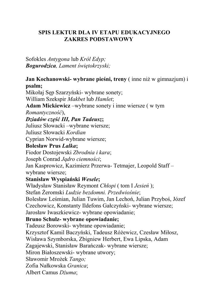 SPIS LEKTUR DLA IV ETAPU EDUKACYJNEGO ZAKRES PODSTAWOWY Sofokles Antygona lub Król Edyp; Bogurodzica, Lament świętokrzyski; Jan Kochanowski- wybrane pieśni, treny ( inne niż w gimnazjum) i psalm; Mikołaj Sęp Szarzyński- wybrane sonety; William Szekspir Makbet lub Hamlet; Adam Mickiewicz –wybrane sonety i inne wiersze ( w tym Romantyczność), Dziadów część III, Pan Tadeusz; Juliusz Słowacki –wybrane wiersze; Juliusz Słowacki Kordian Cyprian Norwid-wybrane wiersze; Bolesław Prus Lalka; Fiodor Dostojewski Zbrodnia i kara; Joseph Conrad Jądro ciemności; Jan Kasprowicz, Kazimierz Przerwa- Tetmajer, Leopold Staff – wybrane wiersze; Stanisław Wyspiański Wesele; Władysław Stanisław Reymont Chłopi ( tom I Jesień ); Stefan Żeromski Ludzie bezdomni. Przedwiośnie; Bolesław Leśmian, Julian Tuwim, Jan Lechoń, Julian Przyboś, Józef Czechowicz, Konstanty Ildefons Gałczyński- wybrane wiersze; Jarosław Iwaszkiewicz- wybrane opowiadanie; Bruno Schulz- wybrane opowiadanie; Tadeusz Borowski- wybrane opowiadanie; Krzysztof Kamil Baczyński, Tadeusz Różewicz, Czesław Miłosz, Wisława Szymborska, Zbigniew Herbert, Ewa Lipska, Adam Zagajewski, Stanisław Barańczak- wybrane wiersze; Miron Białoszewski- wybrane utwory; Sławomir Mrożek Tango; Zofia Nałkowska Granica; Albert Camus Dżuma; - wybór mitów; Dzieje Tristana i Izoldy; Jan Chryzostom Pasek Pamiętniki; Ignacy Krasicki- wybrana satyra lub Monachomachia; Adam Mickiewicz Dziady część IV; Witold Gombrowicz Ferdydurke; Hanna Krall Zdążyć przed Panem Bogiem; Gustaw Herling-Grudziński Inny świat; Ryszard Kapuściński Podróże z Herodotem; Gabriel Garcia Marquez Sto lat samotności; Biblia ( wybrane psalmy, fragmenty : Pieśni nad Pieśniami, Księgi Hioba, Apokalipsy św. Jana );