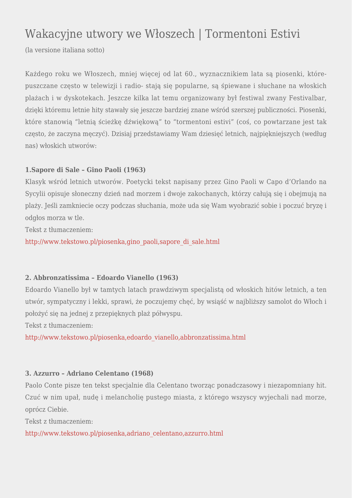 Wakacyjne utwory we Włoszech | Tormentoni Estivi (la versione italiana sotto) Każdego roku we Włoszech, mniej więcej od lat 60., wyznacznikiem lata są piosenki, którepuszczane często w telewizji i radio- stają się popularne, są śpiewane i słuchane na włoskich plażach i w dyskotekach. Jeszcze kilka lat temu organizowany był festiwal zwany Festivalbar, dzięki któremu letnie hity stawały się jeszcze bardziej znane wśród szerszej publiczności. Piosenki, które stanowią “letnią ścieżkę dźwiękową” to “tormentoni estivi” (coś, co powtarzane jest tak często, że zaczyna męczyć). Dzisiaj przedstawiamy Wam dziesięć letnich, najpiękniejszych (według nas) włoskich utworów: 1.Sapore di Sale – Gino Paoli (1963) Klasyk wśród letnich utworów. Poetycki tekst napisany przez Gino Paoli w Capo d’Orlando na Sycylii opisuje słoneczny dzień nad morzem i dwoje zakochanych, którzy całują się i obejmują na plaży. Jeśli zamkniecie oczy podczas słuchania, może uda się Wam wyobrazić sobie i poczuć bryzę i odgłos morza w tle. Tekst z tłumaczeniem: http://www.tekstowo.pl/piosenka,gino_paoli,sapore_di_sale.html 2. Abbronzatissima – Edoardo Vianello (1963) Edoardo Vianello był w tamtych latach prawdziwym specjalistą od włoskich hitów letnich, a ten utwór, sympatyczny i lekki, sprawi, że poczujemy chęć, by wsiąść w najbliższy samolot do Włoch i położyć się na jednej z przepięknych plaż półwyspu. Tekst z tłumaczeniem: http://www.tekstowo.pl/piosenka,edoardo_vianello,abbronzatissima.html 3. Azzurro – Adriano Celentano (1968) Paolo Conte pisze ten tekst specjalnie dla Celentano tworząc ponadczasowy i niezapomniany hit. Czuć w nim upał, nudę i melancholię pustego miasta, z którego wszyscy wyjechali nad morze, oprócz Ciebie. Tekst z tłumaczeniem: http://www.tekstowo.pl/piosenka,adriano_celentano,azzurro.html 4. Pazza idea – Patty Pravo (1973) Nie jest to być może typowa letnia piosenka, ale latem ‘73 roku była jednym z najmodniejszych hitów sezonu. Opowiada historię, skandaliczną jak na tamte czasy, kobiety uprawiającej miłość z mężczyzną i wyobrażającej sobie jednocześnie bycie z kimś innym. Tekst z tłumaczeniem: http://www.tekstowo.pl/piosenka,patty_pravo,pazza_idea.html 5. Gloria – Umberto Tozzi (1978) Utwór napisany i wykonany przez Umberto Tozzi stał się popularny na całym świecie. Ponadczasowy hit, do którego tańczy się także dzisiaj w przyplażowych dyskotekach. Tekst z tłumaczeniem: http://www.tekstowo.pl/piosenka,umberto_tozzi,gloria.html https://www.youtube.com/watch?v=KTM_qG_NPC8 6. Un’estate al mare – Giuni Russo (1981) Niesamowity głos Giuni Russo, o skali, która wielu artystkom wydaje się nie do pomyślenia. To najbardziej popularny jej utwór, z tekstem nie typowo wakacyjnym, za to z refrenem, który wpada w ucho. Tekst : http://www.tekstowo.pl/piosenka,giuni_russo,un_estate_al_mare.html 7. Tropicana – Gruppo italiano (1983) Wesoły, sympatyczny i rozrywkowy utwór, który w 1983 roku stał się bardzo popularny i na plażach i we włoskim radio. Ręka w górę, kto nie chciałby sączyć drinka w ciepły wieczór przy zachodzie słońca słuchając tego utworu? Tekst: http://testicanzoni.mtv.it/testi-Gruppo-Italiano_60426/testo-Tropicana-3171712 8. Un’estate italiana – Edoardo Bennato e Gianna Nannini (1990) Lato 1990 roku pozostaje w pamięci głównie z powodu nieudanych (dla Italii) mistrzostw świata w piłce nożnej, które odbywały się właśnie we Włoszech. Ten utwór był hymnem tamtych mistrzostw i nawet dzisiaj wywołuje okrzyk radości jak po golach Toto’ Schillaci, niezapomnianego króla strzelców tamtych rozgrywek. Tekst z tłumaczeniem: http://www.tekstowo.pl/piosenka,gianna_nannini,un_estate_italiana.html 9. Mare mare – Luca Carboni (1992) To jeden z tych utworów, których słuchanie nigdy Cię nie męczy, który wywołuje pewną nostalgię na myśl o tak wyczekiwanych wakacyjnych podróżach. Tak naprawdę “każdy ma w sercu swoje morze, które co jakiś czas pozwala poczuć falę”. Tekst: http://www.tekstowo.pl/piosenka,luca_carboni,mare_mare.html 10. Vento d’estate – Max Gazzè e Niccolò Fabi (1998) To utwór nieco dziwny i surrealistyczny, który opowiada o pięknie gubienia się w naturze. Nieco smutny, ale może, mimo wszystko, także lato przynosi ze sobą trochę melancholii. Tekst: http://www.tekstowo.pl/piosenka,max_gazz_,vento_d_estate.html Tormentoni Estivi Ogni estate in Italia, a partire più o meno dagli anni 60, le estati vengono scandite da canzoni che diventano molto popolari grazie alla loro grande diffusione da parte delle tv, delle radio e vengono cantate e ascoltate sulle spiaggie e nelle discoteche del bel Paese. Fino a qualche anno fa esisteva anche un famoso festival chiamato Festivalbar, grazie alle quali questo tipo di canzoni ricevevano la loro consacrazione definitiva. Queste canzoni che diventano la colonna sonora dell’estate vengono chiamate tormentoni estivi e noi oggi vogliamo presentarvi la lista dei 10 tormentoni estivi italiani più belli di sempre (secondo noi): 1.Sapore di Sale – Gino Paoli (1963) La canzone estiva per eccellenza, il classico dei classici. Il testo poetico di questa canzone, scritta da Gino Paoli a Capo D’Orlando, in Sicilia, descrive una giornata di mare e di sole dove i due innamorati si baciano e abbracciano sulla sabbia. Se chiudete gli occhi durante l’ascolto forse potete sentire anche l’odore della salsedine e il rumore del mare in sottofondo. 2.Abbronzatissima – Edoardo Vianello (1963) Edoardo Vianello era in quegli anni uno specialista di tormentoni estivi e questo suo brano molto simpatico e leggero ci fa subito venire voglia di prendere il primo aereo per l’Italia per andare a sdrairsi su una delle tante bellissime spiaggie della bella penisola. 3.Azzurro – Adriano Celentano (1968) Paolo Conte scrive su misura questo brano per Celentano e confenzio