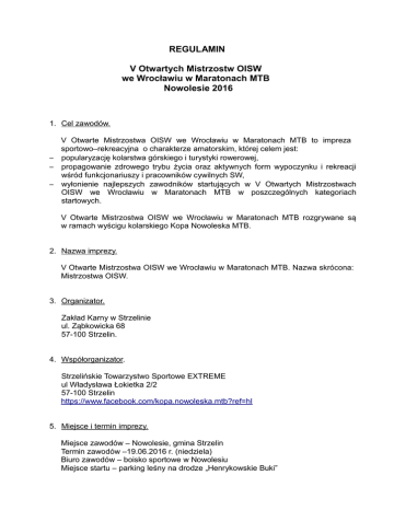 REGULAMIN V Otwartych Mistrzostw OISW we Wrocławiu w Maratonach MTB Nowolesie 2016 1. Cel zawodów. V Otwarte Mistrzostwa OISW we Wrocławiu w Maratonach MTB to impreza sportowo–rekreacyjna o charakterze amatorskim, której celem jest: – popularyzację kolarstwa górskiego i turystyki rowerowej, – propagowanie zdrowego trybu życia oraz aktywnych form wypoczynku i rekreacji wśród funkcjonariuszy i pracowników cywilnych SW, – wyłonienie najlepszych zawodników startujących w V Otwartych Mistrzostwach OISW we Wrocławiu w Maratonach MTB w poszczególnych kategoriach startowych. V Otwarte Mistrzostwa OISW we Wrocławiu w Maratonach MTB rozgrywane są w ramach wyścigu kolarskiego Kopa Nowoleska MTB. 2. Nazwa imprezy. V Otwarte Mistrzostwa OISW we Wrocławiu w Maratonach MTB. Nazwa skrócona: Mistrzostwa OISW. 3. Organizator. Zakład Karny w Strzelinie ul. Ząbkowicka 68 57-100 Strzelin. 4. Współorganizator. Strzelińskie Towarzystwo Sportowe EXTREME ul Władysława Łokietka 2/2 57-100 Strzelin https://www.facebook.com/kopa.nowoleska.mtb?ref=hl 5. Miejsce i termin imprezy. Miejsce zawodów – Nowolesie, gmina Strzelin Termin zawodów –19.06.2016 r. (niedziela) Biuro zawodów – boisko sportowe w Nowolesiu Miejsce startu – parking leśny na drodze „Henrykowskie Buki” Miejsce mety – boisko sportowe w Nowolesiu. 6. Pomiar czasu. Podczas Mistrzostw OISW będzie funkcjonował elektroniczny system identyfikacji i pomiaru czasu. Każdy z uczestników startujący w imprezie zobowiązany jest do posiadania numeru startowego wraz z chipem, który udostępniany będzie przez organizatora. Na trasie będą zlokalizowane elektroniczne punkty kontrolne. Ominięcie punktu kontrolnego będzie skutkowało dyskwalifikacją. 7. Sposób przeprowadzenia imprezy. Start Mistrzostw OISW odbędzie się ze startu wspólnego na trasach okrężnych wokół miejscowości Nowolesie. Trasa będzie oznakowana oraz na stałe zabezpieczona przez odpowiednie służby organizatora i służby ratownicze. Organizator zastrzega sobie prawo do innego sposobu przeprowadzenia startu oraz zmian w poprowadzeniu trasy o czym poinformuje uczestników na odprawie technicznej w dniu rozgrywania maratonu. 9. Dystanse. Mistrzostwa OISW rozegrane zostaną na dystansie Mega (45 km - 1,5 pętli). Zwycięzcami rozgrywanych w formule open zawodów zostaną zawodnicy, którzy pokonają trasę w najkrótszym czasie brutto. 10. Kategoria startowe – – – kategoria M1- mężczyźni urodzeni w 1981roku i młodsi, kategoria M2 - mężczyźni rok urodzeni w 1980 roku i starsi kategoria K – kobiety. 11. Warunki uczestnictwa. W V Otwartych Mistrzostwach OISW we Wrocławiu może uczestniczyć osoba która: – – – – jest czynnym lub emerytowanym funkcjonariuszem lub pracownikiem cywilnym Służby Więziennej, wystartuje w kasku rowerowym sztywnym na rowerze sprawnym technicznie, napędzanym wyłącznie siłą mięśni, wniesie opłatę startową w wysokości zgodnej z punktem 12 regulaminu. Opłata wpisowego może być dokonywana w formie przelewów z banków tradycyjnych, internetowych lub przekazów pocztowych na konto organizatora oraz wpłat gotówkowych w biurze zawodów (w dniu maratonu). Na przelewie bankowym lub pocztowym należy zaznaczyć tytuł opłaty, wpisując imię i nazwisko zawodnika wraz z dopiskiem Mistrzostwa OISW np.: „Andrzej Andrzejewski – Mistrzostwa OISW”. Oryginał dowodu opłaty startowej należy zachować do wglądu podczas rejestracji. Płatności dokonane na konto organizatora tytułem uczestnictwa nie podlegają zwrotowi. dokona rejestracji na stronie podmiotu współpracującego z organizatorem. Link do strony „zapisy” zostanie udostępniony na stronach organizatorów. 12. Opłaty startowe. 30 zł – do środy (włącznie) poprzedzającej dzień startu (liczy się data wpływu na konto organizatora), 40 zł -w dniu startu maratonu, opłata dokonywana wyłącznie w biurze zawodów . Numer kont - GBS Strzelin: 46 9588 0004 0000 3939 2000 0010 Organizator nie zwraca opłaty startowej w całości lub w części osobom, które nie ukończyły zawodów. 13. Program imprezy. Niedziela, dnia 19.06.2016r. – Nowolesie: godz. 9.00 –10.30. –zapisy w biurze zawodów, godz. 10.45 –10.55 – odprawa techniczna i otwarcie imprezy godz. 11.00 – start zawodników, godz. 16.00 – uroczysta dekoracja zwycięzców w poszczególnych kategoriach, godz. 17.00 - zamknięcie trasy, godz. 18.30 –zamknięcie imprezy. 14. Świadczenia dla uczestników w ramach opłaty startowej. – – – – – oznakowana trasa, elektroniczny pomiar czasu z wykorzystaniem chipów, transmisja on-line w internecie, wynik podawany sms-em, zabezpieczenie medyczne, prawo do korzystania z bufetu, ubezpieczenie NW, – – – możliwość umycia roweru po zakończeniu maratonu, doskonała kolarska atmosfera, puchary lub medale dla zwycięzców (I, II, III miejsce w poszczególnych, przewidzianych niniejszym regulaminem kategoriach). 15. Ruch drogowy. Maraton będzie się odbywać przy nieograniczonym ruchu drogowym. W miejscach szczególnie niebezpiecznych Policja oraz organizator umożliwią włączanie się do ruchu. Zawodnicy muszą zachować szczególną ostrożność mając na uwadze możliwość wyjechania pojazdów z pól, dróg leśnych czy pojedynczych zabudowań. Wszyscy zawodnicy na drogach gruntowych i publicznych powinni poruszać się prawą stroną jezdni i bezwzględnie przestrzegać przepisów ruchu drogowego. Organizator nie ponosi odpowiedzialności za ewentualne kolizje i wypadki na trasie. 16. Środowisko naturalne. Zawody odbywają się w warunkach terenowych. Na trasach przejazdu mogą występować strome zjazdy i podjazdy wymagające stosownych umiejętności jazdy na rowerze górskim. Niebezpieczne, zdaniem organizatora, miejsca na trasie zawodów, wymagające szczególnej uwagi i zachowania bezpieczeństwa zostaną oznaczone planszami z wykrzyknikami, gdzie ilość wykrzykników b