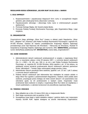 REGULAMIN BIEGU GÓRSKIEGO „SILVER RUN”19.03.2016 r. BARDO I. CELE IMPREZY 1. Rozpowszechnianie i popularyzacja biegowych form ruchu w szczególności biegów górskich, jako atrakcyjnej formy aktywności ruchowej. 2. Popularyzowanie zdrowego i aktywnego trybu życia w zróżnicowanych grupach społecznych. 3. Promocja Dolnego Śląska, Gór Sowich,miasta Bardo. 4. Promocja Polskiej Fundacji Wychowania Fizycznego, jako Organizatora Biegu i jego inicjatora. II. ORGANIZATOR Organizatorem biegu górskiego „Silver Run” (zwany w dalszej części Regulaminu „Silver Run”, „Biegiem” lub „Imprezą”) jest Polska Fundacja Wychowania Fizycznegoul. Legnicka 65, 54-206 Wrocław, wpisana do rejestru przedsiębiorców Krajowego Rejestru Sądowego prowadzonego przez Sąd Rejonowy dla Wrocławia – Fabrycznej we Wrocławiu, Wydział VI Gospodarczy Krajowego Rejestru Sądowego pod numerem, KRS: 0000470552, posiadająca numer identyfikacji podatkowej NIP: 8943047634, zwana dalej „Organizatorem”. III. DANE OSOBOWE 1. Administratorem danych osobowych przetwarzanych w związku z organizacją Silver Run, w rozumieniu ustawy z dnia 29 sierpnia 1997 r. o ochronie danych osobowych (Dz. U. z 2002 r. Nr 101, poz. 926 j.t. ze zm.), jest Polska Fundacja Wychowania Fizycznego, ul. Legnicka 65, 54-206 Wrocław, która zgodnie z art. 31 tej ustawy, na podstawie umowy powierza przetwarzanie danych osobowych jednemu partnerowi firmie: UltimaSport – Tomasz Zając wykonującej usługę pomiaru czasu. 2. Administrator danych pozyskuje dane osobowe, zgodnie z art. 23 ust. 1 pkt 3 ustawy o ochronie danych osobowych. 3. Podanie danych osobowych jest dobrowolne lecz niezbędne do wzięcia udziału w biegu Silver Run zgodnie z postanowieniami Regulaminu. Osobom, które podały dane osobowe, przysługuje prawo dostępu do treści swoich danych i ich poprawiania oraz odwołania zgody na ich przetwarzanie w każdym czasie. Organizator może przetwarzać dane osobowe w związku z organizacją Silver Run także we współpracy z innymi podmiotami, w zakresie koniecznym do prawidłowej organizacji Biegu. IV. TERMIN I MIEJSCE 1. Bieg odbędzie się w dniu 19 marca 2016 roku w miejscowości Bardo. 2. Start biegu wyznaczony jest na godzinę 12:00. 3. Szczegółowa trasa biegu a także dokładne miejsce i godzina startu oraz rozpoczęcia imprezy SILVER RUN będzie dostępna na stronie internetowej Organizatora: www.silver-run.pl, zwanej dalej „Stroną internetową” najpóźniej na 2 tygodnie przed datą imprezy. 4. Organizator zastrzega sobie prawo do zmiany daty i/lub miejsca wydarzenia, a zmiany w tym zakresie nie mogą stanowić podstawy do dodatkowych zobowiązań ze strony Organizatora wobec Uczestników biegu SILVER RUN. 5. W sytuacji opisanej w ust. 4 powyżej, każdy Uczestnik, który dopełnił wszelkich warunków udziału w Imprezie zostanie zawiadomiony o zmianie poprzez zamieszczenie odpowiedniej informacji na Stronie Internetowej nie później niż 7 dni przed rozpoczęciem Biegu. 6. W przypadku, o którym mowa w ust. 5, Uczestnikowi będzie przysługiwało prawo do odstąpienia od uczestnictwa w biegu. Z powyższego uprawnienia Uczestnik będzie mógł skorzystać w terminie 14 dni od dnia zawiadomienia, o którym mowa w ust. 5., jednakże nie później niż do dnia poprzedzającego Bieg. V. TRASA BIEGU 1. Dystans do pokonania wynosi ok. 12 km. 2. Trasabiegu zostanie zabezpieczona taśmami ostrzegawczymi na wszystkich skrzyżowaniach i rozwidleniach, które tego wymagają a oznaczenia przebiegu i kierunku zostaną umieszczone przez organizatora na całej długości trasy. 3. Weryfikację prawidłowo pokonanej trasy Organizator dokona na podstawie informacji od wolontariuszy znajdujących się w granicach poszczególnych odcinków trasy. 4. Start biegu odbędzie się w wydzielonej strefie startu. W zależności od liczby zgłoszeń uczestnicy będą startować w grupach od 50 do 100 osobowych z 5 minutowym odstępem między startem poszczególnych grup. 5. Oznaczenia wymuszają na Uczestnikach kierunek i sposób pokonania terenu. Uczestnik zobowiązany jest do przestrzegania oznaczeń, o których mowa powyżej w celu prawidłowego ustalenia miejsca w klasyfikacji, pomiaru czasu pokonania trasy i innych okoliczności, o których mowa w Regulaminie. Wszelkie omijanie wyznaczonej trasy lub jej skracanie powoduje dyskwalifikację zawodnika z rywalizacji ogólnej i nie powoduje u Organizatora obowiązku podania Uczestnikowi czasu pokonania trasy i jego miejsca w klasyfikacji ogólnej Biegu. 6. Organizator nie ponosi odpowiedzialności za jakikolwiek uszczerbek na zdrowiu Uczestników biegu doznany w wyniku pokonywania ustalonej trasy w ramach Silver Run. 7. Pomiar trasy został wykonany przez Organizatora przy wykorzystaniu wysokiej klasy sprzętu pomiarowego GarminCSX60 wykorzystującego technologię GPS, jednakże Organizator zastrzega, iż możliwe jest odstępstwo podanego dystansu od rzeczywistego w granicach +/- 1 km. 8. Zawody odbędą się bez względu na warunki pogodowe, jednakże, ze względów bezpieczeństwa Organizator może zmienić przebieg trasy lub przesunąć zawody na inny dzień, o czym poinformuje uczestników za pośrednictwem oficjalnej strony cyklu biegów górskich – www.silver-run.pl nie później niż 72 godz. przed dniem rozpoczęcia zawodów czyli 19.03.2016. VI. POMIAR CZASU I WYNIKI 1. Podczas biegu górskiego SILVER RUN wszyscy zawodnicy muszą posiadać odpowiednio przymocowany, według wzoru pokazowego, wypożyczony chip pomiaru czasu, otrzymany przy weryfikacji w biurze zawodów . 2. Nieprawidłowe przymocowanie otrzymanego przy weryfikacji uczestnika chip’u lub jego zgubienie grozi błędnym pomiarem i dyskwalifikacją Uczestnika bez możliwości wnoszenia roszczeń w stosunku do Organizatora. 3. Warunkiem kwalifikowanego zakończenia Biegu jest dotarcie do mety z zamocowanym chipem pomiarowym w maksymalnym przedziale czasu podanym przez organizatora w dniu bieg