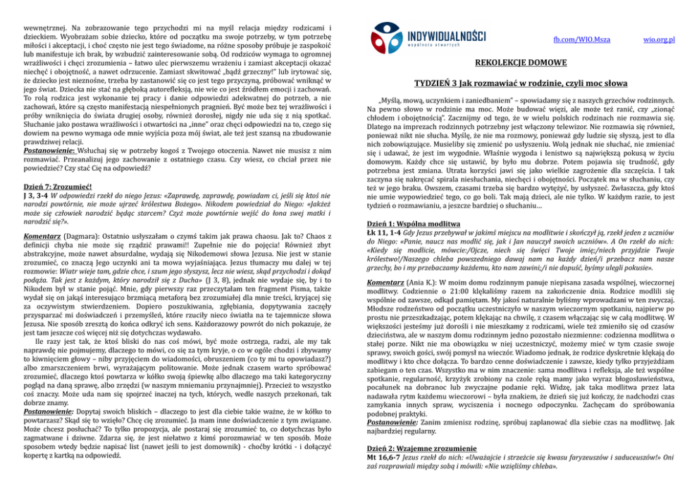 wewnętrznej. Na zobrazowanie tego przychodzi mi na myśl relacja między rodzicami i dzieckiem. Wyobrażam sobie dziecko, które od początku ma swoje potrzeby, w tym potrzebę miłości i akceptacji, i choć często nie jest tego świadome, na różne sposoby próbuje je zaspokoić lub manifestuje ich brak, by wzbudzić zainteresowanie sobą. Od rodziców wymaga to ogromnej wrażliwości i chęci zrozumienia – łatwo ulec pierwszemu wrażeniu i zamiast akceptacji okazać niechęć i obojętność, a nawet odrzucenie. Zamiast skwitować „bądź grzeczny!” lub irytować się, że dziecko jest nieznośne, trzeba by zastanowić się co jest tego przyczyną, próbować wniknąć w jego świat. Dziecka nie stać na głęboką autorefleksją, nie wie co jest źródłem emocji i zachowań. To rolą rodzica jest wykonanie tej pracy i danie odpowiedzi adekwatnej do potrzeb, a nie zachowań, które są często manifestacją niespełnionych pragnień. Być może bez tej wrażliwości i próby wniknięcia do świata drugiej osoby, również dorosłej, nigdy nie uda się z nią spotkać. Słuchanie jako postawa wrażliwości i otwartości na „inne” oraz chęci odpowiedzi na to, czego się dowiem na pewno wymaga ode mnie wyjścia poza mój świat, ale też jest szansą na zbudowanie prawdziwej relacji. Postanowienie: Wsłuchaj się w potrzeby kogoś z Twojego otoczenia. Nawet nie musisz z nim rozmawiać. Przeanalizuj jego zachowanie z ostatniego czasu. Czy wiesz, co chciał przez nie powiedzieć? Czy stać Cię na odpowiedź? Dzień 7: Zrozumieć! J 3, 3-4 W odpowiedzi rzekł do niego Jezus: «Zaprawdę, zaprawdę, powiadam ci, jeśli się ktoś nie narodzi powtórnie, nie może ujrzeć królestwa Bożego». Nikodem powiedział do Niego: «Jakżeż może się człowiek narodzić będąc starcem? Czyż może powtórnie wejść do łona swej matki i narodzić się?». Komentarz (Dagmara): Ostatnio usłyszałam o czymś takim jak prawa chaosu. Jak to? Chaos z definicji chyba nie może się rządzić prawami!! Zupełnie nie do pojęcia! Również zbyt abstrakcyjne, może nawet absurdalne, wydają się Nikodemowi słowa Jezusa. Nie jest w stanie zrozumieć, co znaczą Jego uczynki ani ta mowa wyjaśniająca. Jezus tłumaczy mu dalej w tej rozmowie: Wiatr wieje tam, gdzie chce, i szum jego słyszysz, lecz nie wiesz, skąd przychodzi i dokąd podąża. Tak jest z każdym, który narodził się z Ducha» (J 3, 8), jednak nie wydaje się, by i to Nikodem był w stanie pojąć. Mnie, gdy pierwszy raz przeczytałam ten fragment Pisma, także wydał się on jakąś interesująco brzmiącą metaforą bez zrozumiałej dla mnie treści, kryjącej się za oczywistym stwierdzeniem. Dopiero poszukiwania, zgłębiania, dopytywania zaczęły przysparzać mi doświadczeń i przemyśleń, które rzuciły nieco światła na te tajemnicze słowa Jezusa. Nie sposób zresztą do końca odkryć ich sens. Każdorazowy powrót do nich pokazuje, że jest tam jeszcze coś więcej niż się dotychczas wydawało. Ile razy jest tak, że ktoś bliski do nas coś mówi, być może ostrzega, radzi, ale my tak naprawdę nie pojmujemy, dlaczego to mówi, co się za tym kryje, o co w ogóle chodzi i zbywamy to kiwnięciem głowy – niby przyjęciem do wiadomości, obruszeniem (co ty mi tu opowiadasz?) albo zmarszczeniem brwi, wyrażającym politowanie. Może jednak czasem warto spróbować zrozumieć, dlaczego ktoś powtarza w kółko swoją śpiewkę albo dlaczego ma taki kategoryczny pogląd na daną sprawę, albo zrzędzi (w naszym mniemaniu przynajmniej). Przecież to wszystko coś znaczy. Może uda nam się spojrzeć inaczej na tych, których, wedle naszych przekonań, tak dobrze znamy. Postanowienie: Dopytaj swoich bliskich – dlaczego to jest dla ciebie takie ważne, że w kółko to powtarzasz? Skąd się to wzięło? Chcę cię zrozumieć. Ja mam inne doświadczenie z tym związane. Może chcesz posłuchać? To tylko propozycja, ale postaraj się zrozumieć to, co dotychczas było zagmatwane i dziwne. Zdarza się, że jest niełatwo z kimś porozmawiać w ten sposób. Może sposobem wtedy będzie napisać list (nawet jeśli to jest domownik) - choćby krótki - i dołączyć kopertę z kartką na odpowiedź. fb.com/WIO.Msza wio.org.pl REKOLEKCJE DOMOWE TYDZIEŃ 3 Jak rozmawiać w rodzinie, czyli moc słowa „Myślą, mową, uczynkiem i zaniedbaniem” – spowiadamy się z naszych grzechów rodzinnych. Na pewno słowo w rodzinie ma moc. Może budować więzi, ale może też ranić, czy „zionąć chłodem i obojętnością”. Zacznijmy od tego, że w wielu polskich rodzinach nie rozmawia się. Dlatego na imprezach rodzinnych potrzebny jest włączony telewizor. Nie rozmawia się również, ponieważ nikt nie słucha. Myślę, że nie ma rozmowy, ponieważ gdy ludzie się słyszą, jest to dla nich zobowiązujące. Musieliby się zmienić po usłyszeniu. Wolą jednak nie słuchać, nie zmieniać się i udawać, że jest im wygodnie. Właśnie wygoda i lenistwo są największą pokusą w życiu domowym. Każdy chce się ustawić, by było mu dobrze. Potem pojawia się trudność, gdy potrzebna jest zmiana. Utrata korzyści jawi się jako wielkie zagrożenie dla szczęścia. I tak zaczyna się nakręcać spirala niesłuchania, niechęci i obojętności. Początek ma w słuchaniu, czy też w jego braku. Owszem, czasami trzeba się bardzo wytężyć, by usłyszeć. Zwłaszcza, gdy ktoś nie umie wypowiedzieć tego, co go boli. Tak mają dzieci, ale nie tylko. W każdym razie, to jest tydzień o rozmawianiu, a jeszcze bardziej o słuchaniu… Dzień 1: Wspólna modlitwa Łk 11, 1-4 Gdy Jezus przebywał w jakimś miejscu na modlitwie i skończył ją, rzekł jeden z uczniów do Niego: «Panie, naucz nas modlić się, jak i Jan nauczył swoich uczniów». A On rzekł do nich: «Kiedy się modlicie, mówcie:/Ojcze, niech się święci Twoje imię;/niech przyjdzie Twoje królestwo!/Naszego chleba powszedniego dawaj nam na ka