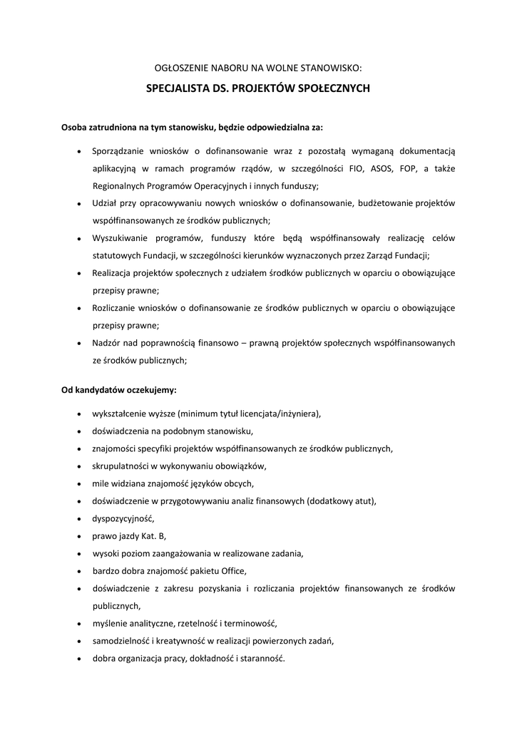 OGŁOSZENIE NABORU NA WOLNE STANOWISKO: SPECJALISTA DS. PROJEKTÓW SPOŁECZNYCH Osoba zatrudniona na tym stanowisku, będzie odpowiedzialna za: Sporządzanie wniosków o dofinansowanie wraz z pozostałą wymaganą dokumentacją aplikacyjną w ramach programów rządów, w szczególności FIO, ASOS, FOP, a także Regionalnych Programów Operacyjnych i innych funduszy; Udział przy opracowywaniu nowych wniosków o dofinansowanie, budżetowanie projektów współfinansowanych ze środków publicznych; Wyszukiwanie programów, funduszy które będą współfinansowały realizację celów statutowych Fundacji, w szczególności kierunków wyznaczonych przez Zarząd Fundacji; Realizacja projektów społecznych z udziałem środków publicznych w oparciu o obowiązujące przepisy prawne; Rozliczanie wniosków o dofinansowanie ze środków publicznych w oparciu o obowiązujące przepisy prawne; Nadzór nad poprawnością finansowo – prawną projektów społecznych współfinansowanych ze środków publicznych; Od kandydatów oczekujemy: wykształcenie wyższe (minimum tytuł licencjata/inżyniera), doświadczenia na podobnym stanowisku, znajomości specyfiki projektów współfinansowanych ze środków publicznych, skrupulatności w wykonywaniu obowiązków, mile widziana znajomość języków obcych, doświadczenie w przygotowywaniu analiz finansowych (dodatkowy atut), dyspozycyjność, prawo jazdy Kat. B, wysoki poziom zaangażowania w realizowane zadania, bardzo dobra znajomość pakietu Office, doświadczenie z zakresu pozyskania i rozliczania projektów finansowanych ze środków publicznych, myślenie analityczne, rzetelność i terminowość, samodzielność i kreatywność w realizacji powierzonych zadań, dobra organizacja pracy, dokładność i staranność. Oferujemy Stabilne zatrudnienie w oparciu o umowę o pracę w pełnym wymiarze czasu pracy w systemie jednozmianowym od poniedziałku do piątku w godzinach 7.30 – 15.30 Wynagrodzenie w wysokości 2500,00 zł brutto + dodatki i nagrody zgodnie z Regulaminem wynagradzania pracowników Fundacji, Szkolenia zawodowe, w tym możliwość dofinansowania do studiów pracownika 50% ulgi w czesnym dla dzieci pracowników Fundacji, których dzieci przebywają w żłobkach i przedszkolach, których organem prowadzącym jest Fundacją Pracę w młodym, niedużym zespole w bardzo pozytywnej atmosferze Wyposażone stanowisko pracy w biurko, laptop, telefon i inne niezbędne urządzenia wielofunkcyjne Brak sztywności korporacyjnej Elastyczne godziny pracy Oferta powinna zawierać: CV i list motywacyjny, Kopie dokumentów potwierdzających wykształcenie, Kopie dokumentów potwierdzających doświadczenie zawodowe, Kopie dokumentów poświadczających dodatkowe umiejętności i kwalifikacje, Oświadczenie kandydata o korzystaniu z pełni praw publicznych i o niekaralności za umyślne i nieumyślne przestępstwo karne i skarbowe zawierające własnoręczny podpis, Oświadczenie kandydata o wyrażeniu zgody na przetwarzanie danych osobowych do celów rekrutacji o następującym brzmieniu: „Wyrażam zgodę na przetwarzanie moich danych osobowych zawartych w ofercie pracy dla potrzeb niezbędnych do realizacji procesu rekrutacji, zgodnie z ustawą z dnia 29 sierpnia 1997 r. o ochronie danych osobowych (t.j.: Dz.U. nr 101 z 2002 r., poz. 926 z późn.zm.)” zawierające własnoręczny podpis, Osoby zainteresowane prosimy o przesyłanie do dnia 05.12.2016 r. godz. 14,00 (decyduje data wpływu) oferty spełniającej wymogi określone w powyższym ogłoszeniu do Sekretariatu Biura Fundacji Porozumienie Wzgórz Dalkowskich: 67-124 Nowe Miasteczko ul. Głogowska 10, osobiste składanie w sekretariacie w zamkniętych kopertach. Na kopertach należy umieścić dopisek: „Rekrutacja – specjalista ds. projektów społecznych”. Inne informacje: Kandydaci zakwalifikowani zostaną powiadomieni o terminie rozmowy wstępnej. Oferty otrzymane po terminie i nie spełniające wymagań nie będą rozpatrywane. Oferty odrzucone zostaną zniszczone komisyjnie. Fundacja „Porozumienie Wzgórz Dalkowskich” zastrzega sobie prawo odpowiedzi na wybrane oferty.