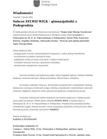 Wiadomości Czwartek, 7 stycznia 2016 Sukces SYLWII WILK - gimnazjalistki z Podegrodzia W Ogólnopolskim Konkursie Plastyczno-Literackim pt.”Magia świąt Bożego Narodzenia” organizowanym przez Szkołę Podstawową w Mordarce wzięły udział uczennice z Gimnazjum im. bł. O. St. Papczyńskiego w Podegrodziu: Sylwia Wilk, Katarzyna Koterla, Angelika Zielińska, Aleksandra Kwoka – Wyżycka pod opieką polonistki Agaty Nawojowskiej. Celem konkursu było: - propagowanie wartości chrześcijańskich związanych z cudem Bożego Narodzenia, - uwrażliwienie na piękno rodzinnych świąt, - pogłębienie wiedzy na temat zwyczajów i tradycji świątecznych, - rozwijanie inwencji twórczej i sprawności manualnej, - kształtowanie umiejętności wypowiedzi. Patronat medialny nad konkursem objęli: Dobry Tygodnik Sądecki, Szkolna Gablotka, Konkursy i festiwale dla dzieci, Bliżej przedszkola, Miasto Dzieci, Interklasa. Na konkurs wpłynęły 134 prace. Wyróżniała je pomysłowość i oryginalność. Komisja konkursowa oceniając je brała pod uwagę: estetykę, pomysłowość, samodzielność, obecność motywów religijnych, bogactwo treści, poprawność językową i ortograficzną życzeń. Uczniowie wykonywali ozdoby choinkowe oraz kartki świąteczne z redagowanymi przez siebie życzeniami. Wielki sukces odniosła SYLWIA WILK, uczennica klasy II Gimnazjum im. bł. O. St. Papczyńskiego w Podegrodziu. Przygotowała przepiękną kartkę – wyhaftowała szopkę i ułożyła życzenia. Swym oryginalnym pomysłem zachwyciła jury, które doceniło jej pracę i przyznało zaszczytne I MIEJSCE. Poniżej werdykt jury: KARTKA Z ŻYCZENIAMI KATEGORIA WIEKOWA IV I miejsce – Sylwia Wilk, 13 lat, Gimnazjum w Podegrodziu, opiekun Agata Nawojowska II miejsce Julia Nyszak, 13 lat, Zespół Szkół Specjalnych w Warcie, opiekun Anna Łukasik III miejsce Lena Dudra, 14 lat, Gimnazjum nr 9 w Lublinie, opiekun Ewa Kołodziejczyk