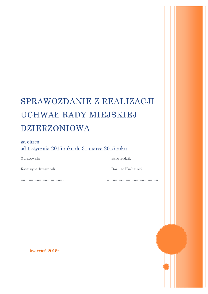 SPRAWOZDANIE Z REALIZACJI UCHWAŁ RADY MIEJSKIEJ DZIERŻONIOWA za okres od 1 stycznia 2015 roku do 31 marca 2015 roku Opracowała: Zatwierdził: Katarzyna Droszczak Dariusz Kucharski ……………………………….. kwiecień 2015r. …………………………………….. SPRAWOZDANIE Z REALIZACJI UCHWAŁ RADY MIEJSKIEJ DZIERŻONIOWA za okres od 1 stycznia 2015 roku do 31 marca 2015 roku SPIS TREŚCI : I. UCHWAŁY DOTYCZĄCE GOSPODAROWANIA MIENIEM KOMUNALNYM I ZAGOSPODAROWANIA PRZESTRZENNEGO ………………………………………….2 II. UCHWAŁY Z ZAKRESU PORZĄDKU PUBLICZNEGO MIASTA.. ………………….3 III. UCHWAŁY DOTYCZĄCE OCHRONY ŚRODOWISKA ………………………………5 IV. UCHWAŁY Z ZAKRESU STRATEGII …………………………………………………..8 V.UCHWAŁY DOTYCZĄCE INFRASTRUKTURY SPOŁECZNEJ .................................12 VI. UCHWAŁY DOTYCZĄCE INNYCH SPRAW………………………………………….18 1 I. UCHWAŁY DOTYCZĄCE GOSPODAROWANIA MIENIE KOMUNALNYM I ZAGOSPODAROWANIA PRZESTRZENNEGO Uchwały podjęte w I kwartale 2015r.: 1. Uchwała Nr LIV/375/14 Rady Miejskiej Dzierżoniowa z dnia 24 października 2014r. w sprawie wyrażenia zgody na dokonanie darowizny prawa własności nieruchomości stanowiących własność Gminy Miejskiej Dzierżoniów na rzecz Województwa Dolnośląskiego. Wyrażenie zgody na dokonanie darowizny działek wydzielonych pod skrzyżowanie typu rondo przy ul. Daszyńskiego/Piłsudskiego. Dokumenty zostały przekazane do DSDiK w celu podpisania umowy notarialnej. W trakcie realizacji uzgodnienie treści porozumienia. Uchwały realizowane w I kwartale 2015r.: 1. Uchwała Nr V/26/15 z 23 lutego 2015r. w sprawie przystąpienia do sporządzenia miejscowego planu zagospodarowania przestrzennego obszaru położonego po wschodniej stronie ulicy Złotej, przy granicy Dzierżoniowa z Włókami. Podano do publicznej wiadomości (obwieszczenie, prasa oraz BIP) informację o przystąpieniu do sporządzenia planu oraz o możliwości i terminie składania wniosków do planu. 2. Uchwała Nr XII/81/07 Rady Miejskiej Dzierżoniowa z dnia 25 kwietnia 2007r. w sprawie zasad gospodarowania mieniem Miasta, zmieniona -Uchwałą Nr VIII/49/11 Rady Miejskiej Dzierżoniowa z dnia 18 kwietnia 2011r. zmieniającą uchwałę w sprawie zasad gospodarowania mieniem Miasta, -Uchwałą Nr X/60/11 Rady Miejskiej Dzierżoniowa z dnia 27 czerwca 2011r. zmieniającą uchwałę w sprawie zasad gospodarowania mieniem Miasta, -Uchwałą Nr XXXVII/256/13 Rady Miejskiej Dzierżoniowa z dnia 24 czerwca 2013r. zmieniającą uchwałę w sprawie zasad gospodarowania mieniem Miasta, -Uchwałą Nr LIV/376/14 Rady Miejskiej Dzierżoniowa z dnia 24 października 2014r. zmieniającą uchwałę w sprawie zasad gospodarowania mieniem Miasta. Zgodnie z tą uchwałą zrealizowano: 2 a) bezprzetargowo sprzedano na rzecz dotychczasowych najemców 8 lokali mieszkalnych za kwotę 47.435,80 zł, b) bezprzetargowo sprzedano na rzecz dotychczasowych najemców 2 garaże na łączna kwotę 13.300,00 zł. Ogłoszono przetargi : a) 9 przetargów na sprzedaż lokali mieszkalnych, b) 4 przetargi na sprzedaż lokali użytkowych, c) 3 przetargi na sprzedaż działek niezabudowanych, d) 2 przetargi na sprzedaż nieruchomości zabudowanych. Umowy: a) przedłużono 15 umów dzierżawy ogródków przydomowych, b) zawarto 5 nowych umów dzierżawy ogródków przydomowych, c) zawarto 6 umów dzierżawy na grunty pod lokalizację pojemników na odpady komunalne, d) zawarto 7 umów na dzierżawę gruntów na cele handlowo- usługowe, e) zawarto 7 umów na dzierżawę gruntu w celu budowy infrastruktury technicznej, f) zawarto 1 umowę na dzierżawę obiektu (schron) z Muzeum Miejskim w Dzierżoniowie. II. UCHWAŁY Z ZAKRESU PORZĄDKU PUBLICZNEGO MIASTA Uchwały realizowane w I kwartale 2015r.: 1. Uchwała Nr XXXIX/263/00 Rady Miejskiej Dzierżoniowa z dnia 26 października 2000r. w sprawie wprowadzenia zakazu spożywania napojów alkoholowych w miejscach publicznych na terenie Miasta Dzierżoniowa. Realizacja uchwały polegała na systematycznym patrolowaniu rejonów miasta, w których zjawiska spożywania alkoholu występują najczęściej, a więc skwery, parki, tereny rekreacyjne, zaplecza sklepów monopolowych. W I kwartale zrealizowano łącznie 264 patrole pieszych, zmotoryzowanych i rowerowych oraz 48 patroli wspólnie z policją. W ramach czynności prewencyjnych dotyczących spożywania alkoholu w miejscu publicznym pouczono 79 osób, 3 a 25 ukarano mandatem karnym. W ramach działań profilaktycznych w trosce o ich bezpieczeństwo 7 osób nietrzeźwych przewieziono do miejsca zamieszkania. Realizacja uchwały polegała w głównej mierze na bieżącym monitorowaniu placówek handlowych. Wspólnie z Radą Miasta kontrolą objęto wszystkie placówki handlowe i lokale gastronomiczne sprzedające alkohol pod kątem przestrzegania przez nie obowiązujących przepisów dotyczących oznakowania placówek obowiązującymi tablicami dotyczącymi zakazu sprzedaży alkoholu nieletnim i osobom nietrzeźwym. Należy stwierdzić, że systematyczne działania i kontrole w znacznym stopniu poprawiły stan przestrzegania obowiązujących przepisów. 2. Uchwała Nr LXI/411/06 Rady Miejskiej Dzierżoniowa z dnia 28 sierpnia 2006r. w sprawie przyjęcia Regulaminu utrzymania czystości i porządku na terenie Dzierżoniowa. Działalność w tym zakresie opierała się na wykorzystywaniu informacji z następujących źródeł: a) własne będące wynikiem pracy patrolowej, b) sygnały mieszkańców, c) informacji z Urzędu Miasta. W ramach tych działań identyfikowano dzikie wysypiska śmieci, miejsca szczególnie zaniedbane z określeniem ich właścicieli. W przypadku identyfikacji właścicieli lub zarządcy nieruchomości egzekwowano obowiązek uporządkowania nieruchomości. Szczególną uwagę poświęcono nieruchomościom położonym przy głównych ciągach komunikacy