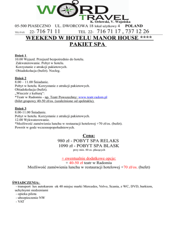 05-500 PIASECZNO TEL/FAX K. Orłowski, V. Wojeńska UL. DWORCOWA 18 lokal użytkowy 4 POLAND 22- 716 71 11 TEL 22- 716 71 17 , 737 12 26 WEEKEND W HOTELU MANOR HOUSE **** PAKIET SPA Dzień 1 10.00 Wyjazd. Przejazd bezpośrednio do hotelu. Zakwaterowanie. Pobyt w hotelu. Korzystanie z atrakcji pakietowych. Obiadokolacja (bufet). Nocleg. Dzień 2 8.00 – 11.00 Śniadanie. Pobyt w hotelu. Korzystanie z atrakcji pakietowych. Obiadokolacja (bufet). „Wieczór z kulturą”: *Teatr w Radomiu - np. Teatr Powszechny: www.teatr.radom.pl (bilet grupowy 40-50 zł/os. (uzależnione od spektaklu). Dzień 3 8.00-11.00 Śniadanie. Pobyt w hotelu. Korzystanie z atrakcji pakietowych. 12.00 Wykwaterowanie. *Możliwość zamówienia lunchu w restauracji hotelowej +70 zł/os. (bufet). Powrót w godz wczesnopopołudniowych. Cena: 980 zł - POBYT SPA RELAKS 1090 zł - POBYT SPA BLASK przy min. 40 os. płacących + ewentualnie dodatkowe opcje: + 40-50 zł teatr w Radomiu Możliwość zamówienia lunchu w restauracji hotelowej +70 zł/os. (bufet) ŚWIADCZENIA: - transport lux autokarem ok 48 miejsc marki Mercedes, Volvo, Scania, z WC, DVD, barkiem, uchylnymi siedzeniami - opieka pilota - ubezpieczenie NW - VAT POBYT SPA RELAKS W RAMACH 2 DOBOWEGO POBYTU W CENIE ZAPEWNIAMY PAŃSTWU: • 2 noclegi w klimatyzowanych, stylowo urządzonych pokojach z TV-SAT oraz internetem bezprzewodowym, • 2 śniadania z elementami kuchni wellness, • 2 obiadokolacje, • powitalny poczęstunek napitkami i ciastem dworskim, • barek herbaciany w pokoju • odnowę biologiczną według specjalnie opracowanego ,,Programu Wellness" w pokoju Gościa zgodnie, z którym korzysta się z masażera stóp, głowy, masażera dłoni i palców, leczniczej soli kamiennej lub olejków, balsamu do ciała, jonizującej lampy solnej, muzykoterapii i zdrowego snu na poduszce z łuską gryczaną • korzystanie z krytego Basenu Ery Wodnika 24 x 9m z rwącą rzeką o długości 25 m oraz z licznymi atrakcjami wodnymi: gejzerami, masującymi leżankami i siedziskami, masażerami karku i kręgosłupa, jacuzzi itp. Jest to pierwszy w Polsce basen, w którym zastosowana jest innowacyjna, bezchlorowa, bardzo zdrowa dla człowieka, metoda uzdatniania wody oparta na ożywionej wodzie Grandera i jonach srebra. • dwukrotne korzystanie z dwugodzinnego relaksu w Łaźniach Rzymskich w jedynym w swoim rodzaju kompleksie 18-tu parowych, wodnych i masujących kąpieli oraz saun, wanien zdrowotnych i relaksujących procedur, • seans 40 minutowy w terapeutycznej chacie solnej, w czasie którego uczestnicy wdychają mikroskopijne cząsteczki soli rozpylane przez drugi w Polsce tego typu generator suchego aerozolu solnego. Terapia wzmacnia i oczyszcza układ oddechowy, rewitalizuje układ odpornościowy organizmu, wygładza skórę i nadaje skórze zdrowy wygląd. Jeden taki seans ma takie same właściwości terapeutyczne jak 3 dni spędzone nad morzem • możliwość bezpłatnego wykonania sesji zdjęciowej na terenie przypałacowego parku z własnym fotografem • korzystanie z sali fitness z fototerapią ( naturalne promienie światła słonecznego), oraz ze sprzętu Nordic Walking • obcowanie z naturą w Ogrodzie Medytacji - ścieżka edukacyjna • czerpanie mocy w Kamiennym Kręgu i piramidzie Horusa, • bezpłatne konsultacje kosmetologiczne w Studiu Odnowy przed zabiegami, • przy zakwaterowaniu w pokoju ofuro SPA, w którym znajduje się beczka o pojemności 300 l lub kamienny brodzik do kąpieli nóg, korzystanie z dwóch zabiegów Wellness: rytualnej kąpieli w sianie oraz z rytualnej kąpieli w solach. • Wybrane dla Państwa zabiegi SPA w cenie pobytu: - masaż klasyczny karku - masaż pleców do wyboru chińską bańką lub olejkiem wytapianym ze świecy - do wyboru zabieg w pokoju gościa: na stopy ,,Termalny Dotyk" lub na dłonie ,,Perłowa Maska" - magnetostymulacja - fizykoterapia zmiennym polem magnetycznym - napoje SPA w trakcie zabiegów • korzystanie z bilardu, rowerów, outdoor fitness, minigolfa, wędkowania w przypałacowych stawach • bezpłatny parking • w każdą sobotę wstęp wolny na ,,Koncert na gongi tybetańskie i śpiewające misy" - muzykoterapia. W RAMACH 2 DOBOWEGO POBYTU W CENIE ZAPEWNIAMY PAŃSTWU: POBYT SPA BLASK Upominki: • możliwość bezpłatnego wykonania sesji zdjęciowej na terenie przypałacowego parku z własnym fotografem (wartość cennikowa 200zł) • zabieg w pokoju Gościa do wyboru: na stopy ,,Termalny Dotyk" lub na dłonie ,,Perłowa Maska" Zakwaterowanie: • 2 noclegi w klimatyzowanych, stylowo urządzonych pokojach z TV-SAT oraz internetem bezprzewodowym, • bezpłatny parking Konsumpcja: • 2 śniadania z elementami kuchni wellness, • 2 obiadokolacje, • powitalny poczęstunek napitkami i ciastem dworskim, • barek herbaciany w pokoju Odnowa Biologiczna i Relaks • odnowę biologiczną według specjalnie opracowanego ,,Programu Wellness" w pokoju Gościa zgodnie, z którym korzysta się z masażera stóp, głowy, masażera dłoni i palców, leczniczej soli kamiennej lub olejków, balsamu do ciała, jonizującej lampy solnej, muzykoterapii i zdrowego snu na poduszce z łuską gryczaną • korzystanie z krytego Basenu Ery Wodnika 24 x 9m z rwącą rzeką o długości 25 m oraz z licznymi atrakcjami wodnymi: gejzerami, masującymi leżankami i siedziskami, masażerami karku i kręgosłupa, jacuzzi itp. Jest to pierwszy w Polsce basen, w którym zastosowana jest innowacyjna, bezchlorowa, bardzo zdrowa dla człowieka, metoda uzdatniania wody oparta na ożywionej wodzie Grandera i jonach srebra. • dwukrotne korzystanie z dwugodzinnego relaksu w Łaźniach Rzymskich w jedynym w swoim rodzaju kompleksie 18-tu • parowych, wodnych i masujących kąpieli oraz saun, wanien zdrowotnych i relaksujących procedur, • seans 40 minutowy w terapeutycznej chacie solnej, w czasie którego uczestnicy wdychają mikroskopijne cząsteczki soli rozpylane przez drugi w Polsce tego typu generator su