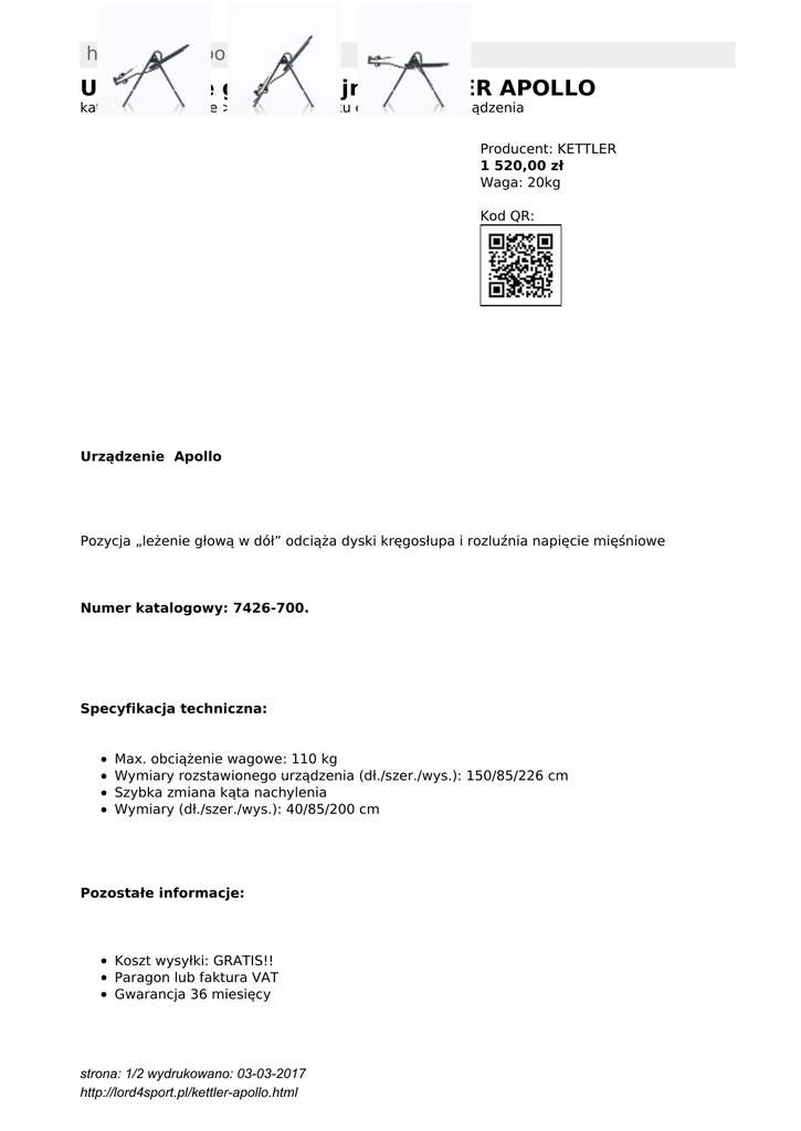 http://lord4sport.pl Urządzenie grawitacyjne KETTLER APOLLO kategoria: Kategorie > Sprzęt do użytku domowego > Urządzenia Producent: KETTLER 1 520,00 zł Waga: 20kg Kod QR: Urządzenie Apollo Pozycja „leżenie głową w dół” odciąża dyski kręgosłupa i rozluźnia napięcie mięśniowe Numer katalogowy: 7426-700. Specyfikacja techniczna: Max. obciążenie wagowe: 110 kg Wymiary rozstawionego urządzenia (dł./szer./wys.): 150/85/226 cm Szybka zmiana kąta nachylenia Wymiary (dł./szer./wys.): 40/85/200 cm Pozostałe informacje: Koszt wysyłki: GRATIS!! Paragon lub faktura VAT Gwarancja 36 miesięcy strona: 1/2 wydrukowano: 03-03-2017 http://lord4sport.pl/kettler-apollo.html UWAGA!!! Klienci, którzy zamierzają odwiedzić nasze salony w celu przetestowania prosimy o to,żeby przed przyjazdem sprawdzić telefonicznie czy dany model znajduje się aktualnie na ekspozycji danego salonu. strona: 2/2 wydrukowano: 03-03-2017 http://lord4sport.pl/kettler-apollo.html