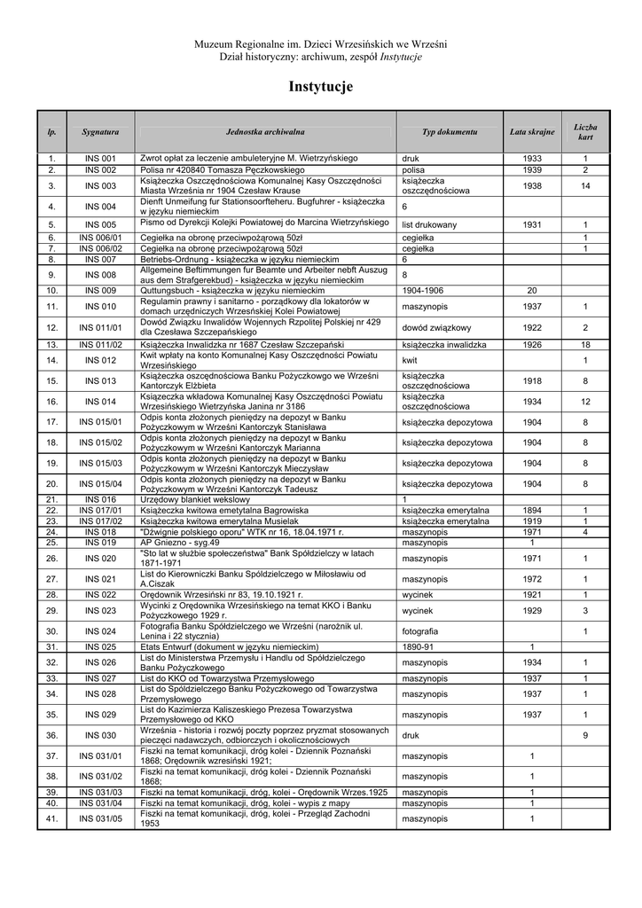 Muzeum Regionalne im. Dzieci Wrzesińskich we Wrześni Dział historyczny: archiwum, zespół Instytucje Instytucje lp. Sygnatura Jednostka archiwalna 1. 2. INS 001 INS 002 3. INS 003 druk polisa książeczka oszczędnościowa 4. INS 004 Zwrot opłat za leczenie ambuleteryjne M. Wietrzyńskiego Polisa nr 420840 Tomasza Pęczkowskiego Książeczka Oszczędnościowa Komunalnej Kasy Oszczędności Miasta Września nr 1904 Czesław Krause Dienft Unmeifung fur Stationsoorfteheru. Bugfuhrer - książeczka w języku niemieckim Pismo od Dyrekcji Kolejki Powiatowej do Marcina Wietrzyńskiego Cegiełka na obronę przeciwpożąrową 50zł Cegiełka na obronę przeciwpożąrową 50zł Betriebs-Ordnung - książeczka w języku niemieckim Allgemeine Beftimmungen fur Beamte und Arbeiter nebft Auszug aus dem Strafgerekbud) - książeczka w języku niemieckim Quttungsbuch - książeczka w języku niemieckim Regulamin prawny i sanitarno - porządkowy dla lokatorów w domach urzędniczych Wrzesńskiej Kolei Powiatowej Dowód Związku Inwalidów Wojennych Rzpolitej Polskiej nr 429 dla Czesława Szczepańskiego Książeczka Inwalidzka nr 1687 Czesław Szczepański Kwit wpłaty na konto Komunalnej Kasy Oszczędności Powiatu Wrzesińskiego Książeczka oszcędnościowa Banku Pożyczkowgo we Wrześni Kantorczyk Elżbieta Ksiązeczka wkładowa Komunalnej Kasy Oszczędności Powiatu Wrzesińskiego Wietrzyńska Janina nr 3186 Odpis konta złożonych pieniędzy na depozyt w Banku Pożyczkowym w Wrześni Kantorczyk Stanisława Odpis konta złożonych pieniędzy na depozyt w Banku Pożyczkowym w Wrześni Kantorczyk Marianna Odpis konta złożonych pieniędzy na depozyt w Banku Pożyczkowym w Wrześni Kantorczyk Mieczysław Odpis konta złożonych pieniędzy na depozyt w Banku Pożyczkowym w Wrześni Kantorczyk Tadeusz Urzędowy blankiet wekslowy Książeczka kwitowa emetytalna Bagrowiska Książeczka kwitowa emerytalna Musielak "Dźwignie polskiego oporu" WTK nr 16, 18.04.1971 r. AP Gniezno - syg.49 "Sto lat w służbie społeczeństwa" Bank Spółdzielczy w latach 1871-1971 List do Kierowniczki Banku Spóldzielczego w Miłosławiu od A.Ciszak Orędownik Wrzesiński nr 83, 19.10.1921 r. Wycinki z Orędownika Wrzesińskiego na temat KKO i Banku Pożyczkowego 1929 r. Fotografia Banku Spółdzielczego we Wrześni (narożnik ul. Lenina i 22 stycznia) Etats Entwurf (dokument w języku niemieckim) List do Ministerstwa Przemysłu i Handlu od Spółdzielczego Banku Pożyczkowego List do KKO od Towarzystwa Przemysłowego List do Spóldzielczego Banku Pożyczkowego od Towarzystwa Przemysłowego List do Kazimierza Kaliszeskiego Prezesa Towarzystwa Przemysłowego od KKO Września - historia i rozwój poczty poprzez pryzmat stosowanych pieczęci nadawczych, odbiorczych i okolicznościowych Fiszki na temat komunikacji, dróg kolei - Dziennik Poznański 1868; Orędownik wzresiński 1921; Fiszki na temat komunikacji, dróg kolei - Dziennik Poznański 1868; Fiszki na temat komunikacji, dróg, kolei - Orędownik Wrzes.1925 Fiszki na temat komunikacji, dróg, kolei - wypis z mapy Fiszki na temat komunikacji, dróg, kolei - Przegląd Zachodni 1953 cegiełka cegiełka 6 5. INS 005 6. 7. 8. INS 006/01 INS 006/02 INS 007 9. INS 008 10. INS 009 11. INS 010 12. INS 011/01 13. INS 011/02 14. INS 012 15. INS 013 16. INS 014 17. INS 015/01 18. INS 015/02 19. INS 015/03 20. INS 015/04 21. 22. 23. 24. 25. INS 016 INS 017/01 INS 017/02 INS 018 INS 019 26. INS 020 27. INS 021 28. INS 022 29. INS 023 30. INS 024 31. INS 025 32. INS 026 33. INS 027 34. INS 028 35. INS 029 36. INS 030 37. INS 031/01 38. INS 031/02 39. 40. INS 031/03 INS 031/04 41. INS 031/05 Typ dokumentu Lata skrajne Liczba kart 1933 1939 1 2 1938 14 1931 1 6 list drukowany 1 1 8 1904-1906 20 maszynopis 1937 1 dowód związkowy 1922 2 książeczka inwalidzka 1926 18 kwit książeczka oszczędnościowa książeczka oszczędnościowa 1 1918 8 1934 12 książeczka depozytowa 1904 8 książeczka depozytowa 1904 8 książeczka depozytowa 1904 8 książeczka depozytowa 1904 8 1 książeczka emerytalna książeczka emerytalna maszynopis maszynopis 1894 1919 1971 1 1 1 4 maszynopis 1971 1 maszynopis 1972 1 wycinek 1921 1 wycinek 1929 3 fotografia 1890-91 maszynopis 1 1 1934 1 maszynopis 1937 1 maszynopis 1937 1 maszynopis 1937 1 druk 9 maszynopis 1 maszynopis 1 maszynopis maszynopis 1 1 maszynopis 1 Muzeum Regionalne im. Dzieci Wrzesińskich we Wrześni Dział historyczny: archiwum, zespół Instytucje 42. INS 031/06 43. INS 031/07 44. INS 032 45. INS 033 46. INS 034/01 47. INS 034/02 48. INS 035/01 49. INS 035/02 50. INS 035/03 51. 52. INS 036 INS 037 53. INS 038/01 54. INS 038/02 55. INS 039 Fiszki na temat komunikacji, dróg, kolei - Dziennik Poznański 1868 Fiszki na temat komunikacji, dróg, kolei List z Wydziału Powiatowego Zarząd Drogowy do K. Kaliszewskiego Regularna komunikacja pocztowa w Wielkopolsce na przestrzeni XVIII-XIX w. List od Wrzesińskiego Koła Polskiego Towarzystwa Historycznego do Dyrekcji Okręgowej Kolei Państwowych List od Dyrekcji Okręgowej Kolei Pań. W Poznaniu do Wrzesińskiego Koła Polskiego Towarzystwa Historycznego Fotografia : Dworzec wrzesiński z lat okupacji Fotografia: Załoga Dworca z okazji 50 - lecia funkcjonowania linii Poznań – Września Fotografia: Zarząd Powiatowy Kolejowego Przysposobienia Wojskowego Referat na 40 rocznicę powstania ZWG Tonsil Wydruk fotografii przedstawiających m. Września List do Zarządu Miejskiego od Zjed.Przemysłu Rad.- Tech. Fabryka Głosników List z Zarządu Mijeskiego - wydział Nadzoru Budowlanego do Fabryki Głośników w sprawie pozwolenia na budowę baraków, portiernii, stołówki i magazynu Bank Ludowy w Miłosławiu od 1869 do 1894. Sprawozdanie jubileuszowe - Filip Skoraczewski maszynopis 1 rękopis - notatka 1 maszynopis 1937 2 maszynopis 3 maszynopis 1959 1 maszynopis 1960 1 fotografia 1 fotografia 1 fotografia ksero maszynopisu druk maszynopis 1 12 1 1946 1946 1 maszynopis 4 1