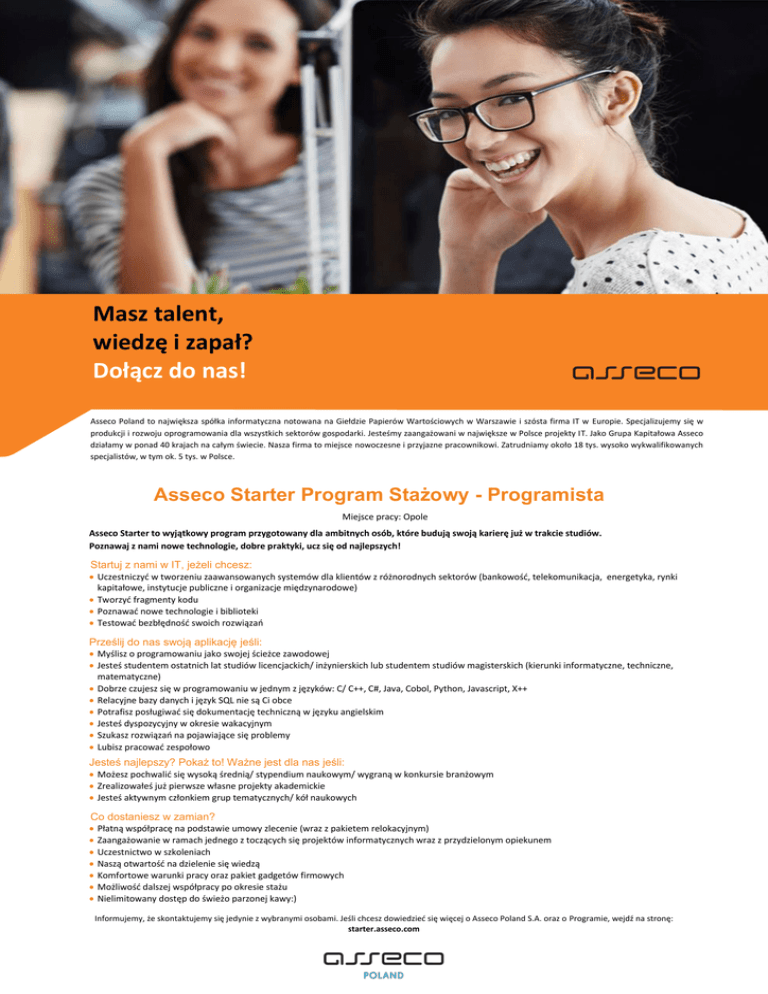 Masz talent, wiedzę i zapał? Dołącz do nas! Asseco Poland to największa spółka informatyczna notowana na Giełdzie Papierów Wartościowych w Warszawie i szósta firma IT w Europie. Specjalizujemy się w produkcji i rozwoju oprogramowania dla wszystkich sektorów gospodarki. Jesteśmy zaangażowani w największe w Polsce projekty IT. Jako Grupa Kapitałowa Asseco działamy w ponad 40 krajach na całym świecie. Nasza firma to miejsce nowoczesne i przyjazne pracownikowi. Zatrudniamy około 18 tys. wysoko wykwalifikowanych specjalistów, w tym ok. 5 tys. w Polsce. Asseco Starter Program Stażowy - Programista Miejsce pracy: Opole Asseco Starter to wyjątkowy program przygotowany dla ambitnych osób, które budują swoją karierę już w trakcie studiów. Poznawaj z nami nowe technologie, dobre praktyki, ucz się od najlepszych! Startuj z nami w IT, jeżeli chcesz: Uczestniczyć w tworzeniu zaawansowanych systemów dla klientów z różnorodnych sektorów (bankowość, telekomunikacja, energetyka, rynki kapitałowe, instytucje publiczne i organizacje międzynarodowe) Tworzyć fragmenty kodu Poznawać nowe technologie i biblioteki Testować bezbłędność swoich rozwiązań Prześlij do nas swoją aplikację jeśli: Myślisz o programowaniu jako swojej ścieżce zawodowej Jesteś studentem ostatnich lat studiów licencjackich/ inżynierskich lub studentem studiów magisterskich (kierunki informatyczne, techniczne, matematyczne) Dobrze czujesz się w programowaniu w jednym z języków: C/ C++, C#, Java, Cobol, Python, Javascript, X++ Relacyjne bazy danych i język SQL nie są Ci obce Potrafisz posługiwać się dokumentację techniczną w języku angielskim Jesteś dyspozycyjny w okresie wakacyjnym Szukasz rozwiązań na pojawiające się problemy Lubisz pracować zespołowo Jesteś najlepszy? Pokaż to! Ważne jest dla nas jeśli: Możesz pochwalić się wysoką średnią/ stypendium naukowym/ wygraną w konkursie branżowym Zrealizowałeś już pierwsze własne projekty akademickie Jesteś aktywnym członkiem grup tematycznych/ kół naukowych Co dostaniesz w zamian? Płatną współpracę na podstawie umowy zlecenie (wraz z pakietem relokacyjnym) Zaangażowanie w ramach jednego z toczących się projektów informatycznych wraz z przydzielonym opiekunem Uczestnictwo w szkoleniach Naszą otwartość na dzielenie się wiedzą Komfortowe warunki pracy oraz pakiet gadgetów firmowych Możliwość dalszej współpracy po okresie stażu Nielimitowany dostęp do świeżo parzonej kawy:) Informujemy, że skontaktujemy się jedynie z wybranymi osobami. Jeśli chcesz dowiedzieć się więcej o Asseco Poland S.A. oraz o Programie, wejdź na stronę: starter.asseco.com