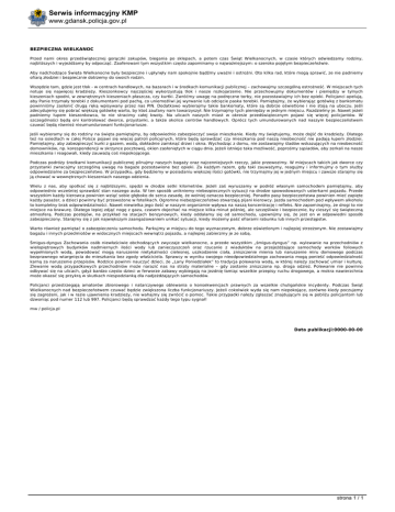 Serwis informacyjny KMP www.gdansk.policja.gov.pl BEZPIECZNA WIELKANOC Przed nami okres przedświątecznej gorączki zakupów, biegania po sklepach, a potem czas Świąt Wielkanocnych, w czasie których odwiedzamy rodziny, najbliższych i wyjeżdżamy by odpocząć. Zaaferowani tym wszystkim często zapominamy o najważniejszym: o szeroko pojętym bezpieczeństwie. Aby nadchodzące Święta Wielkanocne były bezpieczne i upłynęły nam spokojnie bądźmy uważni i ostrożni. Oto kilka rad, które mogą sprawić, ze nie padniemy ofiarą złodziei i bezpiecznie dotrzemy do swoich rodzin. Wszędzie tam, gdzie jest tłok - w centrach handlowych, na bazarach i w środkach komunikacji publicznej – zachowajmy szczególną ostrożność. W miejscach tych notuje się najwięcej kradzieży. Kieszonkowcy najczęściej wykorzystują tłok i nasze rozkojarzenie. Nie przechowujmy dokumentów i pieniędzy w tylnych kieszeniach spodni, w zewnętrznych kieszeniach płaszcza, czy kurtki. Zwróćmy uwagę na podręczne torby, nie pozostawiajmy ich bez opieki. Policjanci apelują, aby Panie trzymały torebki z dokumentami pod pachą, co uniemożliwi jej wyrwanie lub odcięcie paska torebki. Pamiętajmy, że wybierając gotówkę z bankomatu powinniśmy zasłonić drugą ręką wpisywany przez nas PIN. Dodatkowo wybierajmy takie bankomaty, które są dobrze oświetlone i nie stoją na uboczu. Jeśli zdecydujemy się pobrać większą gotówkę warto, by ktoś zaufany nam towarzyszył. Nie trzymajmy tych pieniędzy w jednym miejscu. Rozdzielmy je. Nawet jeżeli padniemy łupem kieszonkowca, to nie stracimy całej kwoty. Na ulicach naszych miast w okresie przedświątecznym pojawi się więcej policjantów. W szczególności będą oni kontrolować dworce, przystanki, a także okolice centrów handlowych. Oprócz tych umundurowanych nad naszym bezpieczeństwem czuwać będą również nieumundurowani funkcjonariusze. Jeśli wybieramy się do rodziny na święta pamiętajmy, by odpowiednio zabezpieczyć swoje mieszkanie. Kiedy my świętujemy, może dojść do kradzieży. Dlatego też na osiedlach w całej Polsce pojawi się więcej patroli policyjnych, które będą sprawdzać czy mieszkania pod naszą nieobecność nie padają łupem złodziei. Pamiętajmy, aby zabezpieczyć kurki z gazem, wodą, dokładnie zamknąć drzwi i okna. Wychodząc z domu, nie zostawiajmy śladów wskazujących na nieobecność domowników, np. korespondencji w skrzynce pocztowej, okien zasłoniętych w ciągu dnia. Jeżeli istnieje taka możliwość, poprośmy sąsiadów, aby zerkali na nasze mieszkania i reagowali, kiedy zauważą coś niepokojącego. Podczas podróży środkami komunikacji publicznej pilnujmy naszych bagaży oraz najcenniejszych rzeczy, jakie przewozimy. W miejscach takich jak dworce czy przystanki zwracajmy szczególną uwagę na bagaże pozostawione bez opieki. Za każdym razem, gdy taki zauważymy, reagujmy i informujmy o tym służby odpowiedzialne za bezpieczeństwo. W przypadku, gdy będziemy w posiadaniu większej ilości gotówki, nie trzymajmy jej w jednym miejscu i zawsze starajmy się ją chować w wewnętrznych kieszeniach naszego odzienia. Wielu z nas, aby spotkać się z najbliższymi, spędzi w drodze setki kilometrów. Jeżeli zaś wyruszamy w podróż własnym samochodem pamiętajmy, aby odpowiednio wcześniej sprawdzić stan naszego auta. W ten sposób unikniemy niebezpiecznych sytuacji na drodze spowodowanych usterkami pojazdu. Przede wszystkim każdy kierowca powinien wziąć sobie głęboko do serca zasadę, że wolniej oznacza bezpieczniej. Ponadto pasy bezpieczeństwa powinien mieć zapięte każdy pasażer, a dzieci powinny być przewożone w fotelikach. Ogromne niebezpieczeństwo stwarzają pijani kierowcy. Jazda samochodem pod wpływem alkoholu to kompletny brak odpowiedzialności. Nawet niewielka jego ilość w naszym organizmie wpływa na naszą koncentrację i refleks. Nie zapominajmy, że drogi to nie miejsce na brawurę. Dlatego lepiej zdjąć nogę z gazu, czasem dojechać na miejsce kilka minut później, ale szczęśliwie i bezpiecznie, by cieszyć się świąteczną atmosferą. Podczas postojów, na przykład na stacjach benzynowych, kiedy oddalamy się od samochodu, upewnijmy się, że jest on w odpowiedni sposób zabezpieczony. Starajmy się z jak największym zaangażowaniem unikać sytuacji, kiedy możemy paść ofiarami rabunku lub innych przestępstw. Warto również pamiętać o zabezpieczeniu samochodu. Parkujmy w miejscu do tego wyznaczonym, dobrze oświetlonym i najlepiej strzeżonym. Nie zostawiajmy bagażu i innych przedmiotów w widocznych miejscach wewnątrz pojazdu, a najlepiej zabierzmy je ze sobą. Śmigus-dyngus Zachowania osób niewłaściwie obchodzących zwyczaje wielkanocne, a przede wszystkim „śmigus-dyngus” np. wylewanie na przechodniów z wielopiętrowych budynków nadmiernych ilości wody lub zanieczyszczeń oraz rzucanie z wiaduktów na przejeżdżające samochody worków foliowych wypełnionych wodą, powodować mogą naruszenie nietykalności cielesnej, uszkodzenie ciała, zniszczenie mienia lub naruszenie miru domowego podczas bezprawnego wtargnięcia do mieszkania bez zgody właściciela. Sprawcy w wyniku swojego nieodpowiedzialnego zachowania mogą ponieść odpowiedzialność karną za naruszenie przepisów. Rodzice powinni nauczyć dzieci, że „Lany Poniedziałek” to tradycja polewania wodą, w której należy zachować umiar i kulturę. Zlewanie wodą przypadkowych przechodniów może narazić nas na straty materialne – gdy zostanie zniszczona np. droga odzież. Polewanie nie powinno odbywać się na ulicach, gdyż bardzo często dzieci w ferworze zabawy wybiegają na jezdnię łamiąc wszelkie przepisy ruchu drogowego, a mokra nawierzchnia może okazać się przykrą w skutkach niespodzianką dla nadjeżdżających samochodów. Policjanci przestrzegają amatorów zbiorowego i natarczywego oblewania o konsekwencjach prawnych za ws