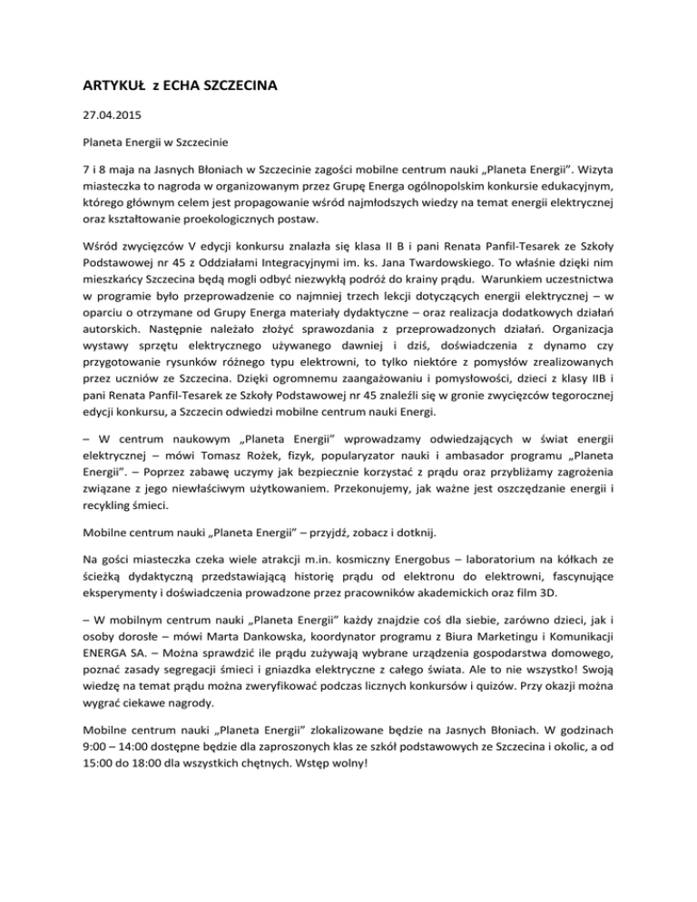 ARTYKUŁ z ECHA SZCZECINA 27.04.2015 Planeta Energii w Szczecinie 7 i 8 maja na Jasnych Błoniach w Szczecinie zagości mobilne centrum nauki „Planeta Energii”. Wizyta miasteczka to nagroda w organizowanym przez Grupę Energa ogólnopolskim konkursie edukacyjnym, którego głównym celem jest propagowanie wśród najmłodszych wiedzy na temat energii elektrycznej oraz kształtowanie proekologicznych postaw. Wśród zwycięzców V edycji konkursu znalazła się klasa II B i pani Renata Panfil-Tesarek ze Szkoły Podstawowej nr 45 z Oddziałami Integracyjnymi im. ks. Jana Twardowskiego. To właśnie dzięki nim mieszkańcy Szczecina będą mogli odbyć niezwykłą podróż do krainy prądu. Warunkiem uczestnictwa w programie było przeprowadzenie co najmniej trzech lekcji dotyczących energii elektrycznej – w oparciu o otrzymane od Grupy Energa materiały dydaktyczne – oraz realizacja dodatkowych działań autorskich. Następnie należało złożyć sprawozdania z przeprowadzonych działań. Organizacja wystawy sprzętu elektrycznego używanego dawniej i dziś, doświadczenia z dynamo czy przygotowanie rysunków różnego typu elektrowni, to tylko niektóre z pomysłów zrealizowanych przez uczniów ze Szczecina. Dzięki ogromnemu zaangażowaniu i pomysłowości, dzieci z klasy IIB i pani Renata Panfil-Tesarek ze Szkoły Podstawowej nr 45 znaleźli się w gronie zwycięzców tegorocznej edycji konkursu, a Szczecin odwiedzi mobilne centrum nauki Energi. – W centrum naukowym „Planeta Energii” wprowadzamy odwiedzających w świat energii elektrycznej – mówi Tomasz Rożek, fizyk, popularyzator nauki i ambasador programu „Planeta Energii”. – Poprzez zabawę uczymy jak bezpiecznie korzystać z prądu oraz przybliżamy zagrożenia związane z jego niewłaściwym użytkowaniem. Przekonujemy, jak ważne jest oszczędzanie energii i recykling śmieci. Mobilne centrum nauki „Planeta Energii” – przyjdź, zobacz i dotknij. Na gości miasteczka czeka wiele atrakcji m.in. kosmiczny Energobus – laboratorium na kółkach ze ścieżką dydaktyczną przedstawiającą historię prądu od elektronu do elektrowni, fascynujące eksperymenty i doświadczenia prowadzone przez pracowników akademickich oraz film 3D. – W mobilnym centrum nauki „Planeta Energii” każdy znajdzie coś dla siebie, zarówno dzieci, jak i osoby dorosłe – mówi Marta Dankowska, koordynator programu z Biura Marketingu i Komunikacji ENERGA SA. – Można sprawdzić ile prądu zużywają wybrane urządzenia gospodarstwa domowego, poznać zasady segregacji śmieci i gniazdka elektryczne z całego świata. Ale to nie wszystko! Swoją wiedzę na temat prądu można zweryfikować podczas licznych konkursów i quizów. Przy okazji można wygrać ciekawe nagrody. Mobilne centrum nauki „Planeta Energii” zlokalizowane będzie na Jasnych Błoniach. W godzinach 9:00 – 14:00 dostępne będzie dla zaproszonych klas ze szkół podstawowych ze Szczecina i okolic, a od 15:00 do 18:00 dla wszystkich chętnych. Wstęp wolny! Dotychczas progi mobilnego centrum nauki „Planeta Energii” przekroczyło ponad 102 tys. dzieci i 31,6 tys. dorosłych. Jak będzie w Szczecinie? Okaże się już wkrótce! Energetyczny Turniej Miast – konkurs dla mieszkańców Szczecina! Po godzinie 15:00 w miasteczku pojawi się sztafeta złożona z ośmiu rowerków. Urządzenie zostanie podpięte do baterii, w której gromadzona będzie energia elektryczna wytworzona za pomocą siły mięśni uczestników sztafety. Mieszkańcy miasta, którzy zgromadzą najwięcej prądu zdobędą dodatkową nagrodę dla swojej zwycięskiej klasy. Dlatego zachęcamy mieszkańców Szczecina do włączenia się w akcję i walkę o dodatkową nagrodę dla dzieci ze Szkoły Podstawowej nr 45. Ogłoszenie wyników nastąpi w czerwcu. Honorowy patronat nad wizytą mobilnego centrum nauki „Planeta Energii” w Szczecinie sprawuje Piotr Krzystek, Prezydent Miasta Szczecina. Honorowy patronat nad programem „Planeta Energii” sprawują Minister Edukacji Narodowej oraz Rzecznik Praw Dziecka. Patronem merytorycznym jest Uniwersytet Warmińsko-Mazurski. Patronat medialny nad programem objęła „Gazeta Wyborcza”. Patronat medialny nad wizytami mobilnego centrum nauki objął magazyn „Fun Club”. Więcej na stronie PlanetaEnergii.pl Źródło: szczecin.eu