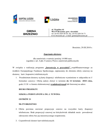 ul. Wspólna 44 98-275 Brzeźnio; pow. sieradzki tel. (0-43) 820-30-26, fax. (0-43) 820-36-71 www.brzeznio.pl ; e-mail: [email protected] GMINA BRZEŹNIO Brzeźnio, 29.III.2010 r. Zapytanie ofertowe dla zamówień o wartości poniŜej 14 000 euro (zgodnie z art. 4 pkt. 8 ustawy Prawo zamówień publicznych) W związku z realizacją programu „Inwestycja w przyszłość” współfinansowanego ze środków Europejskiego Funduszu Społecznego, zapraszamy do złoŜenia oferty cenowej na dostawę kart ( kuponów) telefonicznych. 1. Przedmiotem dostawy są karty (kupony) telefoniczne wymienione w załączniku nr.1/ formularz cenowy/. Ofertę naleŜy złoŜyć w terminie do 12 kwietnia 2010 roku, godz.15.30 w formie elektronicznej/ [email protected] lub listownej na adres: BIURO PROJEKTU SZKOŁA PODSTAWOWA IM. J. TUWIMA OSTRÓW 21 98-275 BRZEŹNIO 2. Oferta powinna zawierać propozycje cenowe na wszystkie karty (kupony) telefoniczne. Brak propozycji cenowej na którykolwiek składnik moŜe powodować odrzucenie oferty bez jej merytorycznego rozpatrzenia. 3. Częstotliwość dostaw kart telefonicznych: Karty będą dostarczane w ilościach przedstawionych w tabeli, co trzy miesiące. W sumie 6 dostaw kart. 4. Kryterium wyboru ofert :-cena 100% Sposób oceny ofert: C(cena oferty) = najniŜsza cena łączna spośród złoŜonych ofert: cena łączna oferty badanej x 100 pkt. Zamawiający wybierze ofertę cenową dostawcy odpowiadającą wszystkim wymogom postawionym przez niego dla prawidłowej realizacji zamówienia. Zamawiający wybierze ofertę Dostawcy, który zaoferuje najkorzystniejszą wartość ogółem oferty. 5. Miejsce dostawy: BIURO PROJEKTU SZKOŁA PODSTAWOWA IM. JULIANA TUWIMA OSTRÓW 21 98-275 BRZEŹNIO Kod ze słownika CPV: 31 71 21 11 - 1 karty telefoniczne 6. Warunki płatności: Przelew na rachunek bankowy Wykonawcy wskazany w fakturze w terminie do 15 dni od daty otrzymania prawidłowo wystawionej faktury. - jeśli jest Pani w stanie określić 7. Termin związania ofertą cenową wynosi 30 dni od dnia otwarcia ofert przez Zamawiającego. 8. O wynikach postępowania jego uczestnicy zostaną poinformowani drogą faxową lub e-mailową w ciągu dwóch dni od dnia rozstrzygnięcia. Przed podpisaniem umowy do podmiotu wybranego w wyniku rozstrzygnięcia postępowania zostanie skierowane zlecenie realizacji zamówienia. 9. Dostawa odbędzie się transportem Wykonawcy na jego koszt i odpowiedzialność do biura projektu. 10. Umowa z wybranym wykonawca zostanie podpisana bezpośrednio po zakończeniu oceny i wyborze najkorzystniejszej oferty. 11. Wszystkie pomoce muszą posiadać atesty i instrukcję w języku polskim. 12. Czas realizacji zamówienia nie dłuŜszy niŜ 14 dni. O terminach kolejnych dostaw Wykonawca zostanie poinformowany telefonicznie na 3 dni przed dostawą. 13. Wszelkie informacje moŜna uzyskać u Pani Ewy Dobruchowskiej nr. telefon 043/820 30 23 Wójt Gminy /-/ mgr Dorota Kubiak ZAŁACZNIK NR 1 Formularz cenowy w postępowaniu na dostawę pomocy dydaktycznych L.p. Nazwa artykułu 1 Ilość kart Ilość dostaw Telekarta 100 ( 6 Orange, 4 Plus) 10 6 Telekarta 50 ( 3 Orange, 4 Plus) 7 6 Cena Wartość jednostkowa brutto brutto 2 wartość ogółem Wartość brutto = cena jednostkowa brutto x ilość kart x ilość dostaw NaleŜy przedłoŜyć formularz oferty.