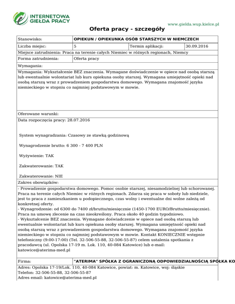 Oferta pracy - szczegóły www.gielda.wup.kielce.pl Stanowisko: OPIEKUN / OPIEKUNKA OSÓB STARSZYCH W NIEMCZECH Liczba miejsc: 5 Termin aplikacji: 30.09.2016 Miejsce zatrudnienia: Praca na terenie całych Niemiec w różnych regionach, Niemcy Forma zatrudnienia: Oferta pracy Wymagania: Wymagania: Wykształcenie BEZ znaczenia. Wymagane doświadczenie w opiece nad osobą starszą lub ewentualnie wolontariat lub kurs opiekuna osoby starszej. Wymagana umiejętność opieki nad osobą starszą wraz z prowadzeniem gospodarstwa domowego. Wymagana znajomość języka niemieckiego w stopniu co najmniej podstawowym w mowie. Oferowane warunki: Data rozpoczęcia pracy: 28.07.2016 System wynagradzania: Czasowy ze stawką godzinową Wynagrodzenie brutto: 6 300 - 7 400 PLN Wyżywienie: TAK Zakwaterowanie: TAK Zakwaterowanie: NIE Zakres obowiązków: - Prowadzenie gospodarstwa domowego. Pomoc osobie starszej, niesamodzielnej lub schorowanej. Praca na terenie całych Niemiec w różnych regionach. Zdarza się praca w soboty lub niedziele, jest to praca z zamieszkaniem u podopiecznego, czas wolny i ewentualne dni wolne zależą od konkretnej oferty. - Wynagrodzenie: od 6300 do 7400 zł/brutto/miesięcznie (1450-1700 EURO/Brutto/miesięcznie). Praca na umowę zlecenie na czas nieokreślony. Praca około 40 godzin tygodniowo. - Wykształcenie BEZ znaczenia. Wymagane doświadczenie w opiece nad osobą starszą lub ewentualnie wolontariat lub kurs opiekuna osoby starszej. Wymagana umiejętność opieki nad osobą starszą wraz z prowadzeniem gospodarstwa domowego. Wymagana znajomość języka niemieckiego w stopniu co najmniej podstawowym w mowie. Kontakt KONIECZNIE wstępnie telefoniczny (9:00-17:00) (Tel. 32-506-55-88, 32-506-55-87) celem ustalenia spotkania z pracodawcą (ul. Opolska 17-19 m. Lok. 110, 40-084 Katowice) lub e-mail: [email protected] Firma: "ATERIMA" SPÓŁKA Z OGRANICZONĄ ODPOWIEDZIALNOŚCIĄ SPÓŁKA KO Adres: Opolska 17-19/Lok. 110, 40-084 Katowice, powiat: m. Katowice, woj: śląskie Telefon: 32-506-55-88, 32-506-55-87 Adres email: [email protected] Adres www: www.aterima-med.pl Adres www: Język aplikacji: polski Sposób aplikowania: bezpośrednio do pracodawcy Sposób przekazania dokumentów: Preferowane formy kontaktu: osobiście, telefon, e-mail, Termin: Kontakt KONIECZNIE wstępnie telefoniczny celem ustalenia spotkania z pracodawcą lub e-mail, Godziny : 9:00-17:00 - KONIECZNIE ZABRAĆ CV !!! Wymagane dokumenty: CV - Kontakt KONIECZNIE wstępnie telefoniczny (9:00-17:00) (Tel. 32-506-55-88, 32-506-55-87) celem ustalenia spotkania z pracodawcą (ul. Opolska 17-19 m. Lok. 110, 40-084 Katowice) lub e-mail: [email protected] Uwagi: Identyfikator oferty: StPr/16/3248 Instytucja koordynująca ofertę: Powiatowy Urząd Pracy w Katowicach Urząd Pracy dokłada wszelkich starań, aby oferty pracy będące w zasobach urzędu, były rzetelne i wiarygodne. Ponieważ wszystkie oferty pracy pochodzą od osób trzecich Urząd Pracy zastrzega, że odpowiedzialność za ewentualne rozbieżności pomiędzy warunkami pracy zaprezentowanymi w niniejszej ofercie a warunkami zaproponowanymi przez potencjalnego pracodawcę ponosi pracodawca.