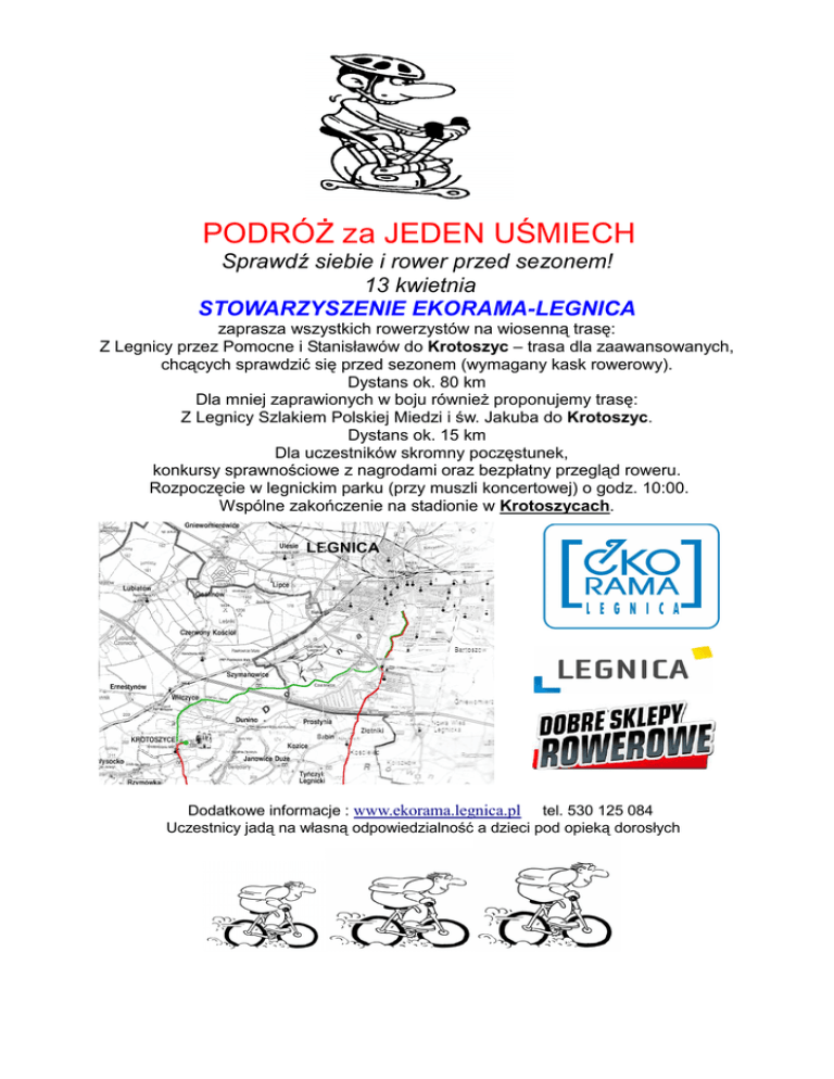 PODRÓŻ za JEDEN UŚMIECH Sprawdź siebie i rower przed sezonem! 13 kwietnia STOWARZYSZENIE EKORAMA-LEGNICA zaprasza wszystkich rowerzystów na wiosenną trasę: Z Legnicy przez Pomocne i Stanisławów do Krotoszyc – trasa dla zaawansowanych, chcących sprawdzić się przed sezonem (wymagany kask rowerowy). Dystans ok. 80 km Dla mniej zaprawionych w boju również proponujemy trasę: Z Legnicy Szlakiem Polskiej Miedzi i św. Jakuba do Krotoszyc. Dystans ok. 15 km Dla uczestników skromny poczęstunek, konkursy sprawnościowe z nagrodami oraz bezpłatny przegląd roweru. Rozpoczęcie w legnickim parku (przy muszli koncertowej) o godz. 10:00. Wspólne zakończenie na stadionie w Krotoszycach. Dodatkowe informacje : www.ekorama.legnica.pl tel. 530 125 084 Uczestnicy jadą na własną odpowiedzialność a dzieci pod opieką dorosłych