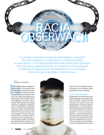 Racja Obserwacji Czy istnieje uniwersalne narzędzie rozstrzygające o prawdzie? Nie, jeśli przyjmiemy, że otaczający nas świat jest zależny od obserwatora – że istnieją zjawiska odczuwane tylko przez wybranych ludzi. My, fizycy, zakładamy jednak, że narzędziem rozstrzygającym o prawdzie jest zawsze wynik doświadczenia. To on przesądza, która teoria jest prawdziwa, a która fałszywa. tekst TO M A S Z SO WI Ń SK I Nauki przyrodnicze działają według schematu, który praktycznie nie zmienił się od czasów Arystotelesa. Schemat ten nazywamy często zasadą naukowego myślenia. Składa się on z kilku następujących po sobie kroków. Na początku zawsze jest podglądanie przyrody. Obserwujemy różne zjawiska zachodzące wokół nas, próbujemy je dokładnie opisać i sklasyfikować. Następnie tworzymy pewien wyidealizowany model matematyczny, który wydaje nam się pasować do zaobserwowanych faktów i szukamy matematycznego sposobu wyjaśnienia, co jest istotą tego modelu. Poszukujemy fundamentalnych założeń, bez których stworzony model nie może 76 maj 2009 działać. Po ich wyselekcjonowaniu tworzymy teorię naukową, której postulatami są owe założenia. Teorie falsyfikowalne Każda dobrze sformułowana teoria naukowa opisuje szerszy zakres zjawisk niż model, z którego została stworzona. To sprawia, że jest ona falsyfikowalna, czyli daje możliwość sprawdzenia, czy jest prawidłowa. Teoria falsyfikowalna prowadzi do wniosków, których wcześniej nie znaliśmy – ma ona pewien potencjał przewidywania zjawisk i efektów, których się nie spodziewamy. Zatem aby sfalsyfikować teorię wystarczy sprawdzić, czy przewidywane przez nią zjawiska rzeczywiście fot. Corbis ...i inne nauki zachodzą w przyrodzie. Jeśli tak jest w istocie, to teorię uznajemy za prawdziwą. Jeśli przewidywanych zjawisk nie uda nam się dostrzec – nasza teoria, choćby nie wiem jak była piękna i ciekawa, ląduje na śmietniku. My, przyrodnicy, uznajemy, że rozstrzygającym o prawdzie elementem jest eksperyment. To on – starannie wykonany i powtórzony w różnych doświadczeniach – jest jedynym obiektywnym kryterium, któremu bezgranicznie ufamy. Dopuszczamy przy tym tylko takie rozstrzygnięcia eksperymentalne, które są obiektywne. To znaczy, że teoretycznie każdy może o słuszności danego rozstrzygnięcia przekonać się samodzielnie, jeśli tylko przeprowadzi odpowiednie doświad czenie. Jeśli jeden z naukowców sfalsyfikuje jakąś teorię w wyra finowanym eksperymencie, to powtórzenie tego samego eksperymentu w różnych laboratoriach (przy zachowaniu tych samych warunków zewnętrznych) przez różnych naukowców zawsze pozwoli sfalsyfikować daną teorię. Nauki przyrodnicze bezwzględnie odrzucają podejście indywidualistyczne. Jeśli jakiś naukowiec powie, że udało mu się w swoim eksperymencie sfalsyfikować np. teorię względności Einsteina, ale jednocześnie zastrzeże, że tak się dzieje tylko w jego laboratorium i tylko wtedy, gdy on dokonuje pomiarów, to nikt nie potraktuje jego rewelacji poważnie. Jeśli ktoś mówi, że potrafi czytać w czyichś myślach, ale nie potrafi prawidłowo wyartykułować tego, co wyczytał – uważamy go za szarlatana. Jeśli ktoś stwierdzi, że potrafi lewitować, ale tylko wtedy, gdy nikt tego nie widzi – uznajemy go za oszusta. Dylematy racjonalnych obserwatorów Osoba, która z naukami przyrodniczymi ma mało wspólnego, początkowo może sądzić, że nałożenie na siebie obowiązku odrzucania wszystkiego, co nie jest potwier- w w w.charakter y.eu dzalne w obiektywnych eksperymentach, prowadzi do radykalnego zubożenia. Wydaje się przecież dość naturalne, że mogą istnieć zjawiska, których doświadczalne potwierdzenie (w sensie opisanym powyżej) jest niemożliwe. Dlaczego zatem naukowcy tak bardzo przy tym potwierdzaniu obstają? Otóż, z naukowego punktu widzenia takie podejście jest jedynym dopuszczalnym. Wypływa ono wprost z szacunku, Z asada naukowego myślenia opiera się na dwóch elementach: prawach logicznego wnioskowania i założeniu o obiektywnym eksperymencie. To kanoniczna metoda dochodzenia do prawdy. jaki każdy z nas ma do przyrody i rządzących nią praw. To przyroda jest centralnym punktem naszych zainteresowań, a człowiek jest tylko obserwatorem, którego równie dobrze mogłoby nie być – jest niczym innym, jak tylko pewną, choć bardzo skomplikowaną, konfiguracją materii. Materii zbudowanej z tych samych cząstek, z których zbudowane są inne obiekty we wszechświecie. I choć nie do końca rozumiemy, jak to się dzieje, że ten materialny zbiór ma w sobie potencjał twórczy i analityczny, to uznajemy, że jest to gdzieś zapisane w prawach przyrody, które są całkowicie niezależne od tego, czy ktoś je odkrywa, czy nie. Takie racjonalne podejście do faktów wypływa nie tylko z naszego stosunku do przyrody, ale również z historii naszej cywilizacji, potwierdzającej, że jest ono jedynym podejściem, które się sprawdziło. W XXI wieku już wiemy, że inne punkty widzenia nie prowadzą do żadnych konstruktywnych wniosków, a przy okazji mogą prowadzić do wielu konfliktów międzyludzkich i społecznych. Tylko racjonalne myślenie, oparte na obiektywnych faktach, jest dla każdego społeczeństwa jedynym sposobem uniknięcia nierozstrzygalnych sporów. To m.in. dzięki zasadzie naukowego myślenia sąd, zasięgając opinii odpowiednich biegłych, może rozstrzygnąć, jaki jest stan faktyczny zaistniałych zdarzeń. Biegli sądowi, opierając się na obiektywnej i popartej dowodami eksperymentalnymi teorii, potrafią z bardzo dużym prawdopodobieństwem ocenić, czy w chwili wypadku samochód był sprawny, czy osoba A jest rodzicem osoby B, czy pocisk został wystrzelony z pistoletu znalezionego na miejscu zbrodni, co było przyczyną zgonu. To rozstrzygające przekonanie biegłych sądowych nie wypływa z ich wewnętrznego przeczucia, ale