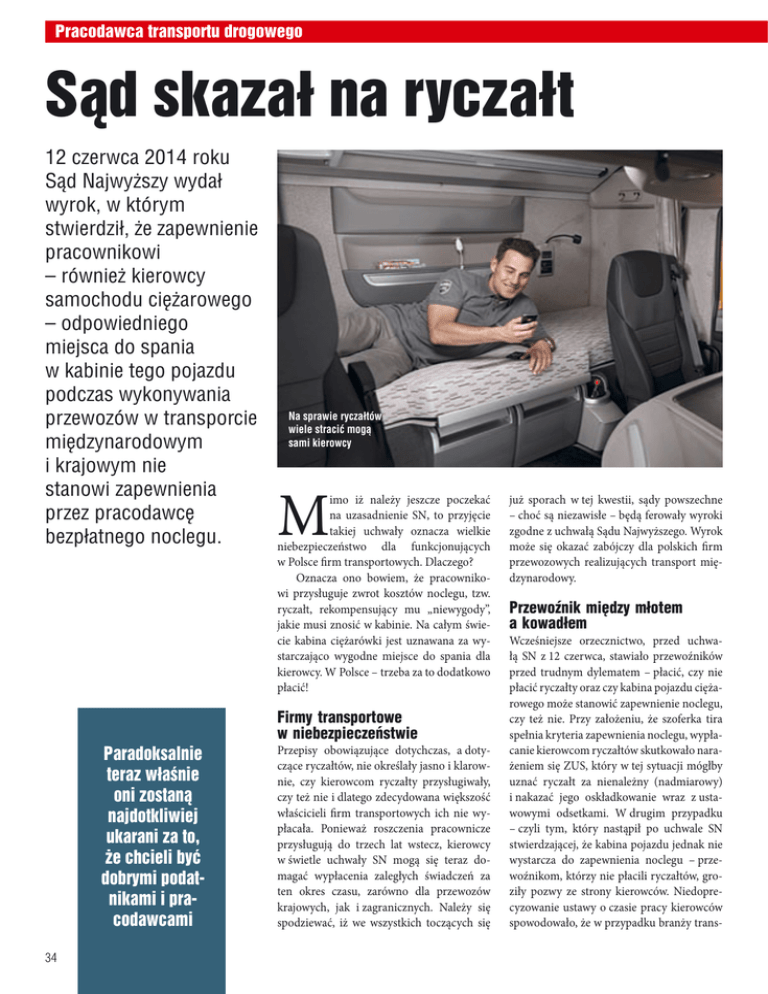 Pracodawca transportu drogowego Sąd skazał na ryczałt 12 czerwca 2014 roku Sąd Najwyższy wydał wyrok, w którym stwierdził, że zapewnienie pracownikowi – również kierowcy samochodu ciężarowego – odpowiedniego miejsca do spania w kabinie tego pojazdu podczas wykonywania przewozów w transporcie międzynarodowym i krajowym nie stanowi zapewnienia przez pracodawcę bezpłatnego noclegu. Na sprawie ryczałtów wiele stracić mogą sami kierowcy M imo iż należy jeszcze poczekać na uzasadnienie SN, to przyjęcie takiej uchwały oznacza wielkie niebezpieczeństwo dla funkcjonujących w Polsce firm transportowych. Dlaczego? Oznacza ono bowiem, że pracownikowi przysługuje zwrot kosztów noclegu, tzw. ryczałt, rekompensujący mu „niewygody”, jakie musi znosić w kabinie. Na całym świecie kabina ciężarówki jest uznawana za wystarczająco wygodne miejsce do spania dla kierowcy. W Polsce – trzeba za to dodatkowo płacić! Firmy transportowe w niebezpieczeństwie Paradoksalnie teraz właśnie oni zostaną najdotkliwiej ukarani za to, że chcieli być dobrymi podatnikami i pracodawcami 34 Przepisy obowiązujące dotychczas, a dotyczące ryczałtów, nie określały jasno i klarownie, czy kierowcom ryczałty przysługiwały, czy też nie i dlatego zdecydowana większość właścicieli firm transportowych ich nie wypłacała. Ponieważ roszczenia pracownicze przysługują do trzech lat wstecz, kierowcy w świetle uchwały SN mogą się teraz domagać wypłacenia zaległych świadczeń za ten okres czasu, zarówno dla przewozów krajowych, jak i zagranicznych. Należy się spodziewać, iż we wszystkich toczących się już sporach w tej kwestii, sądy powszechne – choć są niezawisłe – będą ferowały wyroki zgodne z uchwałą Sądu Najwyższego. Wyrok może się okazać zabójczy dla polskich firm przewozowych realizujących transport międzynarodowy. Przewoźnik między młotem a kowadłem Wcześniejsze orzecznictwo, przed uchwałą SN z 12 czerwca, stawiało przewoźników przed trudnym dylematem – płacić, czy nie płacić ryczałty oraz czy kabina pojazdu ciężarowego może stanowić zapewnienie noclegu, czy też nie. Przy założeniu, że szoferka tira spełnia kryteria zapewnienia noclegu, wypłacanie kierowcom ryczałtów skutkowało narażeniem się ZUS, który w tej sytuacji mógłby uznać ryczałt za nienależny (nadmiarowy) i nakazać jego oskładkowanie wraz z ustawowymi odsetkami. W drugim przypadku – czyli tym, który nastąpił po uchwale SN stwierdzającej, że kabina pojazdu jednak nie wystarcza do zapewnienia noclegu – przewoźnikom, którzy nie płacili ryczałtów, groziły pozwy ze strony kierowców. Niedoprecyzowanie ustawy o czasie pracy kierowców spowodowało, że w przypadku branży trans- portowej żadne z rozwiązań nie było dobre. Najbardziej stracą jednak Ci, którzy chcieli płacić kierowcom więcej, podnosili podstawową pensję, aby nie narazić się ZUS i nie korzystać z „opcji ryczałtu” jako wątpliwej, gdyż zakupili nowe luksusowe ciągniki, żeby zapewnić komfortowy i bezpłatny nocleg załodze. Paradoksalnie teraz właśnie oni zostaną najdotkliwiej ukarani za to, że chcieli być dobrymi podatnikami i pracodawcami. O jakie pieniądze chodzi? SN w uchwale stwierdził, że kwota ryczałtu musi mieć co najmniej wysokość wynikającą z przepisów o podróżach służbowych dla budżetówki albo może być wyższa na podstawie przepisów wewnętrznych. Zakładając jednak minimalną wysokość, jest to 25 proc. limitu noclegowego, określonego dla danego państwa w załączniku do rozporządzenia. Jakie to kwoty? Przykładowo dla Niemiec 37,50 euro, dla Hiszpanii 40 euro, dla Włoch 43,5 euro, dla Francji 45 euro, a dla Rosji aż 50 euro. Jeśli więc kierowca jeździ ciągle w podróże zagraniczne i spędza 15 noclegów miesięcznie za granicą, to koszt z tego tytułu wyniesie od 562,50 euro w przypadku spędzenia wszystkich noclegów w Niemczech do 750 euro w przypadku noclegów na terenie Rosji. Zakładając kurs euro tylko po 4 zł, będzie to kwota od 2250 zł do 3000 zł w skali miesiąca, czyli ogromna. Właściciele firm transportowych szacują, że jeżeli kierowca ciężarówki pozwie np. swojego byłego pracodawcę za pełen okres 3 lat, średnio może mu przysługiwać 80 tys. zł. Jak donoszą sami przewoźnicy, rzeczywiste kwoty, o które skarżą ich kierowcy, oscylują pomiędzy 40 i 150 tys. zł, w zależności od liczby nocy spędzonych w trasie i kraju noclegu. Dla wielu dużych firm oznacza to kilkunastomilionowe odszkodowania, jeżeli kierowcy zbiorowo pozwą swojego byłego lub aktualnego pracodawcę. Efekt nietrudno sobie wyobrazić – masowe upadłości funkcjonujących w Polsce firm transportowych – nie tylko polskich. ryczałtów, tak od teraz kierowcy będą prawdopodobnie otrzymywali najniższą możliwą stawkę diety i zasądzony ostatnio ryczałt za nocleg. Czyli grubość ich portfela i tak się nie zmieni. Urząd Skarbowy ani ZUS też się na tej sytuacji nie wzbogacą, bo zarówno diety, jak i ryczałty nie podlegają opodatkowaniu. Mimo iż dla wielu kierowców pokusa skorzystania z „premii”, jaką sprezentował im Sąd Najwyższy, może się wydawać kusząca, to lawinowe pozywanie swoich pracodawców będzie podcinaniem gałęzi, na której wspólnie siedzą. Paradoksalnie, na sprawie ryczałtów wiele stracić mogą sami kierowcy, bo już obecnie pracodawcy myślą intensywnie o wyprowadzaniu swoich firm poza granice RP lub o zatrudnianiu kierowców z innych krajów. Jakie mogą być skutki? Jeśli kierowane przez kierowców pozwy w sprawie ryczałtów nabiorą lawinowego charakteru, grozi nam fala upadłości firm transportowych na znaczną skalę. Już teraz niektóre z firm rozważają przeprowadzenie planowanych upadłości, a zgodnie z obowiązującą literą prawa, wszystkie firmy działające jako spółki z ograniczoną odpowiedzialnością, które ni