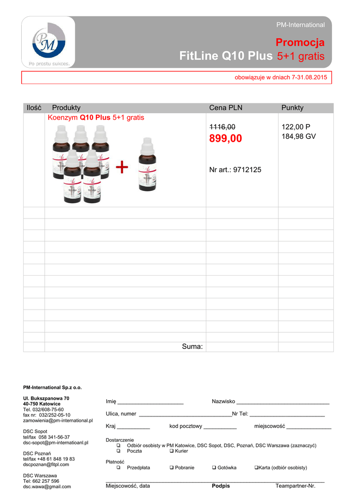 PM-International Promocja FitLine Q10 Plus 5+1 gratis obowiązuje w dniach 7-31.08.2015 P Ilość Produkty Koenzym Q10 Plus 5+1 gratis Cena PLN Punkty 1116,00 122,00 P 184,98 GV 899,00 Nr art.: 9712125 Suma: PM-International Sp.z o.o. Ul. Bukszpanowa 70 40-750 Katowice Tel. 032/608-75-60 fax nr: 032/252-05-10 [email protected] Imię ______________________ Ulica, numer _______________________________Nr Tel: _________________________ Kraj ___________ DSC Sopot tel/fax 058 341-56-37 [email protected] DSC Poznań tel/fax +48 61 848 19 83 [email protected] DSC Warszawa Tel: 662 257 596 [email protected] Nazwisko _______________________________ kod pocztowy ___________ miejscowość _______________ Dostarczenie Odbiór osobisty w PM Katowice, DSC Sopot, DSC, Poznań, DSC Warszawa (zaznaczyć) Poczta Kurier Płatność Przedpłata Pobranie Gotówka Karta (odbiór osobisty) _________________________________________________________________________ Miejscowość, data Podpis Teampartner-Nr.