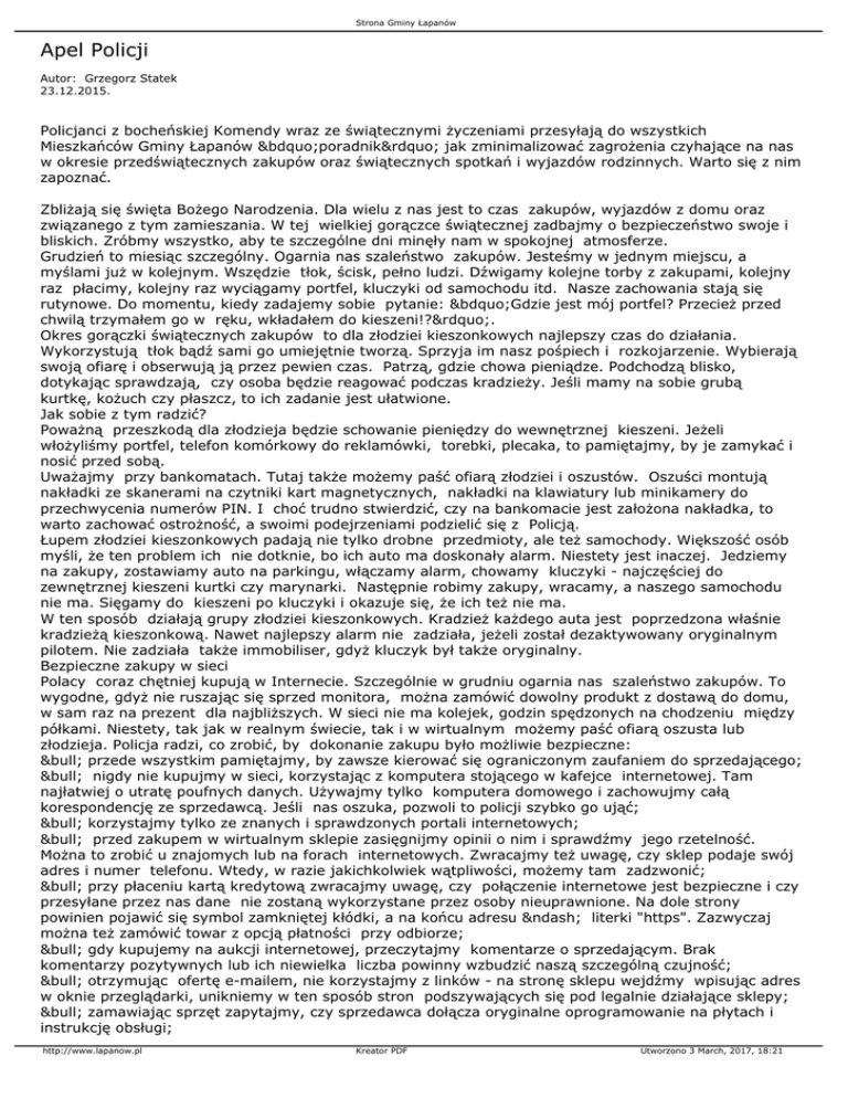 Strona Gminy Łapanów Apel Policji Autor: Grzegorz Statek 23.12.2015. Policjanci z bocheńskiej Komendy wraz ze świątecznymi życzeniami przesyłają do wszystkich Mieszkańców Gminy Łapanów „poradnik” jak zminimalizować zagrożenia czyhające na nas w okresie przedświątecznych zakupów oraz świątecznych spotkań i wyjazdów rodzinnych. Warto się z nim zapoznać. Zbliżają się święta Bożego Narodzenia. Dla wielu z nas jest to czas zakupów, wyjazdów z domu oraz związanego z tym zamieszania. W tej wielkiej gorączce świątecznej zadbajmy o bezpieczeństwo swoje i bliskich. Zróbmy wszystko, aby te szczególne dni minęły nam w spokojnej atmosferze. Grudzień to miesiąc szczególny. Ogarnia nas szaleństwo zakupów. Jesteśmy w jednym miejscu, a myślami już w kolejnym. Wszędzie tłok, ścisk, pełno ludzi. Dźwigamy kolejne torby z zakupami, kolejny raz płacimy, kolejny raz wyciągamy portfel, kluczyki od samochodu itd. Nasze zachowania stają się rutynowe. Do momentu, kiedy zadajemy sobie pytanie: „Gdzie jest mój portfel? Przecież przed chwilą trzymałem go w ręku, wkładałem do kieszeni!?”. Okres gorączki świątecznych zakupów to dla złodziei kieszonkowych najlepszy czas do działania. Wykorzystują tłok bądź sami go umiejętnie tworzą. Sprzyja im nasz pośpiech i rozkojarzenie. Wybierają swoją ofiarę i obserwują ją przez pewien czas. Patrzą, gdzie chowa pieniądze. Podchodzą blisko, dotykając sprawdzają, czy osoba będzie reagować podczas kradzieży. Jeśli mamy na sobie grubą kurtkę, kożuch czy płaszcz, to ich zadanie jest ułatwione. Jak sobie z tym radzić? Poważną przeszkodą dla złodzieja będzie schowanie pieniędzy do wewnętrznej kieszeni. Jeżeli włożyliśmy portfel, telefon komórkowy do reklamówki, torebki, plecaka, to pamiętajmy, by je zamykać i nosić przed sobą. Uważajmy przy bankomatach. Tutaj także możemy paść ofiarą złodziei i oszustów. Oszuści montują nakładki ze skanerami na czytniki kart magnetycznych, nakładki na klawiatury lub minikamery do przechwycenia numerów PIN. I choć trudno stwierdzić, czy na bankomacie jest założona nakładka, to warto zachować ostrożność, a swoimi podejrzeniami podzielić się z Policją. Łupem złodziei kieszonkowych padają nie tylko drobne przedmioty, ale też samochody. Większość osób myśli, że ten problem ich nie dotknie, bo ich auto ma doskonały alarm. Niestety jest inaczej. Jedziemy na zakupy, zostawiamy auto na parkingu, włączamy alarm, chowamy kluczyki - najczęściej do zewnętrznej kieszeni kurtki czy marynarki. Następnie robimy zakupy, wracamy, a naszego samochodu nie ma. Sięgamy do kieszeni po kluczyki i okazuje się, że ich też nie ma. W ten sposób działają grupy złodziei kieszonkowych. Kradzież każdego auta jest poprzedzona właśnie kradzieżą kieszonkową. Nawet najlepszy alarm nie zadziała, jeżeli został dezaktywowany oryginalnym pilotem. Nie zadziała także immobiliser, gdyż kluczyk był także oryginalny. Bezpieczne zakupy w sieci Polacy coraz chętniej kupują w Internecie. Szczególnie w grudniu ogarnia nas szaleństwo zakupów. To wygodne, gdyż nie ruszając się sprzed monitora, można zamówić dowolny produkt z dostawą do domu, w sam raz na prezent dla najbliższych. W sieci nie ma kolejek, godzin spędzonych na chodzeniu między półkami. Niestety, tak jak w realnym świecie, tak i w wirtualnym możemy paść ofiarą oszusta lub złodzieja. Policja radzi, co zrobić, by dokonanie zakupu było możliwie bezpieczne: • przede wszystkim pamiętajmy, by zawsze kierować się ograniczonym zaufaniem do sprzedającego; • nigdy nie kupujmy w sieci, korzystając z komputera stojącego w kafejce internetowej. Tam najłatwiej o utratę poufnych danych. Używajmy tylko komputera domowego i zachowujmy całą korespondencję ze sprzedawcą. Jeśli nas oszuka, pozwoli to policji szybko go ująć; • korzystajmy tylko ze znanych i sprawdzonych portali internetowych; • przed zakupem w wirtualnym sklepie zasięgnijmy opinii o nim i sprawdźmy jego rzetelność. Można to zrobić u znajomych lub na forach internetowych. Zwracajmy też uwagę, czy sklep podaje swój adres i numer telefonu. Wtedy, w razie jakichkolwiek wątpliwości, możemy tam zadzwonić; • przy płaceniu kartą kredytową zwracajmy uwagę, czy połączenie internetowe jest bezpieczne i czy przesyłane przez nas dane nie zostaną wykorzystane przez osoby nieuprawnione. Na dole strony powinien pojawić się symbol zamkniętej kłódki, a na końcu adresu – literki "https". Zazwyczaj można też zamówić towar z opcją płatności przy odbiorze; • gdy kupujemy na aukcji internetowej, przeczytajmy komentarze o sprzedającym. Brak komentarzy pozytywnych lub ich niewielka liczba powinny wzbudzić naszą szczególną czujność; • otrzymując ofertę e-mailem, nie korzystajmy z linków - na stronę sklepu wejdźmy wpisując adres w oknie przeglądarki, unikniemy w ten sposób stron podszywających się pod legalnie działające sklepy; • zamawiając sprzęt zapytajmy, czy sprzedawca dołącza oryginalne oprogramowanie na płytach i instrukcję obsługi; http://www.lapanow.pl Kreator PDF Utworzono 3 March, 2017, 18:21 Strona Gminy Łapanów • kupując telefon komórkowy zapytajmy o ładowarkę i dowód zakupu, telefony kradzione sprzedawane są często bez ładowarki i dokumentacji; • jeśli, mimo zachowania zasad ostrożności, dostaniemy zamiast zamówionego produktu puste pudełko, natychmiast zadzwońmy na policję. Wtedy zapisana korespondencja i przesłana przez oszusta paczka będą stanowiły dowód przestępstwa. Włamywacze nie świętują Wiele osób ograniczy szaleństwo świątecznych zakupów jedynie do kupna prezentów. Wyjadą na święta do rodziny. Pamiętajmy wówczas o właściwym zabezpieczeniu mieszkania lub domu. Włamywacze nie świętują, wykorzystując kilkudniową nieobecność domowników. Idealnego zabe