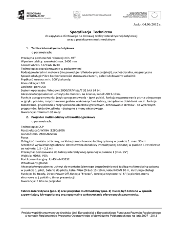 WOJEWÓDZTWO PODKARPACKIE UNIA EUROPEJSKA EUROPEJSKI FUNDUSZ ROZWOJU REGIONALNEGO Jasło, 04.06.2012 r. Specyfikacja Techniczna do zapytania ofertowego na dostawę tablicy interaktywnej dotykowej wraz z projektorem multimedialnym 1. Tablica interaktywna dotykowa o parametrach: Przekątna powierzchni roboczej: min. 95" Wymiary tablicy: szerokość max. 2400 mm Format obrazu 16:9 lub 16:10 Technologia: pozycjonowanie w podczerwieni Rodzaj powierzchni: matowa (nie powoduje refleksów przy projekcji), suchościeralna, magnetyczna Sposób obsługi: Pióro bez konieczności stosowania baterii, palec lub dowolny wskaźnik Prędkość kursora: min. 100"/sekundę Komunikacja: USB Zasilanie: port USB System operacyjny: Windows 2000/XP/Vista/7 32 bit i 64 bit Akcesoria/wyposażenie: uchwyty do montażu na ścianie, kabel USB 5-10 m, Funkcje oprogramowania: język oprogramowania - język polski , funkcja rozpoznawania pisma odręcznego w języku polskim, rozpoznawanie gestów wykonanych na tablicy, zarządzanie obiektami - m.in. funkcja blokowania, grupowania i rozgrupowania obiektów graficznych, definiowanie skrótów - do wybranych programów, folderów, plików - dostępne z menu ekranowego. Gwarancja: minimum 36 m-cy 2. Projektor multimedialny ultrakrótkoogniskowy o parametrach: Technologia: DLP Rozdzielczość: WXGA (1280x800) Jasność: min. 2500 ANSI lm Focus Odległość montażu od ściany, na której zamontowano tablicę opisaną w punkcie 1: max. 30 cm Szerokość wyświetlanego obrazu: dostosowana do tablicy interaktywnej opisanej w punkcie 1 (w zakresie co najmniej 1,5 – 2,2 m) Przekątna: dostosowana do tablicy interaktywnej opisanej w punkcie 1 (min. 95") Wejścia: HDMI, VGA Port komunikacyjny: RJ-45 lub RS232 Wbudowany głośnik Akcesoria/wyposażenie: uchwyt do montażu ściennego bezpośrednio nad tablicą multimedialną opisaną w punkcie 1, pilot, baterie do pilota, kabel VGA (D-Sub 15) 10 m, kabel HDMI 10 m, instrukcja obsługi Funkcje: 3D Ready, Direct Power Off, funkcja "Freeze", korekcja Keystone +/- 5° (w pionie), menu ekranowe w j. polskim, timer prezentacji. Gwarancja: 3 lata na projektor Tablica interaktywna (poz. 1) oraz projektor multimedialny (poz. 2) muszą być dobrane w sposób zapewniający ich współpracę oraz optymalne wykorzystanie oferowanych parametrów. Projekt współfinansowany ze środków Unii Europejskiej z Europejskiego Funduszu Rozwoju Regionalnego w ramach Regionalnego Programu Operacyjnego Województwa Podkarpackiego na lata 2007 – 2013