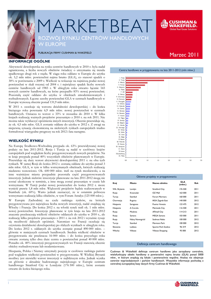 ROZWÓJ RYNKU CENTRÓW HANDLOWYCH W EUROPIE PUBLIKACJA FIRMY CUSHMAN & WAKEFIELD Marzec 2011 INFORMACJE OGÓLNE Aktywność deweloperska na rynku centrów handlowych w 2010 r. była nadal ograniczona, a liczba nowych obiektów świadczy o utrzymaniu się trendu spadkowego drugi rok z rzędu. W ciągu roku oddano w Europie do użytku ok. 5,2 mln mkw. powierzchni najmu brutto (GLA), co stanowi spadek o 30% w porównaniu z 2009 r. Wielkość ta wskazuje na najniższą podaż nowej powierzchni w skali rocznej od 2004 r. i największy spadek liczby nowych centrów handlowych od 1983 r. W ubiegłym roku otwarto łącznie 165 nowych centrów handlowych, na które przypadło 83% nowej powierzchni. Pozostałą część oddano do użytku w obiektach zmodernizowanych i rozbudowanych. Łączne zasoby powierzchni GLA w centrach handlowych w Europie wynoszą obecnie ponad 131,9 mln mkw. W 2011 r. oczekuje się wzrostu działalności deweloperskiej – do końca bieżącego roku powstanie 6,9 mln mkw. nowej powierzchni w centrach handlowych. Oznacza to wzrost o 33% w stosunku do 2010 r. W kilku krajach realizację ważnych projektów przesunięto z 2010 r. na rok 2011. Nie można także wykluczyć opóźnienia innych inwestycji. Obecnie przewiduje się, że ok. 4,5 mln mkw. GLA zostanie oddane do użytku w 2012 r. Z uwagi na niepewną sytuację ekonomiczną na niektórych rynkach europejskich trudno formułować wiarygodne prognozy na rok 2012 i lata następne. WIELKOŚĆ RYNKU Na Europę Środkowo-Wschodnią przypada ok. 63% przewidywanej nowej podaży na lata 2011-2012. Rosja i Turcja są nadal w czołówce krajów europejskich pod względem liczby przygotowywanych nowych projektów. Na te kraje przypada ponad 40% wszystkich obiektów planowanych w Europie. Przewiduje się duży wzrost aktywności deweloperskiej 2011 r. na obu tych rynkach. W samej Rosji do końca 2012 r. zostaną oddane do użytku ponad 3 mln mkw. GLA, w tym w kilku wstrzymanych obiektach, których realizację niedawno wznowiono. Ok. 600 000 mkw. trafi na rynek moskiewski, a na inne ważniejsze miasta przypadnie pozostała część przygotowywanych inwestycji. Jednak niektóre inwestycje planowane na lata 2011-2012 mogą nie zostać ukończone w terminie, a inne mogą zostać przesunięte w czasie lub wstrzymane. W Turcji podaż nowej powierzchni do końca 2012 r. może wynieść prawie 1,8 mln mkw. Większość projektów będzie realizowanych w Stambule (ok. 60%). Warto jednak zaznaczyć, że w ostatnim półroczu wstrzymano realizację kilku obiektów, w tym Forum Antalya (125 000 mkw.). W Europie Zachodniej na czele rankingu rynków, na których przygotowywana jest największa liczba nowych inwestycji, nadal znajdują się Włochy i Francja. Do końca 2012 r. na włoski rynek trafi ok. 1 mln mkw. nowej powierzchni. Inwestycje planowane w tym kraju na lata 2011-2012 znacznie przekraczają wielkość obiektów oddanych do użytku w 2010 r., ale realizację kilku projektów przesunięto z 2011 r. na rok 2012 i wyraźnie rysuje się możliwość dalszych opóźnień. Natomiast we Francji oczekuje się ożywienia działalności deweloperskiej po słabych wynikach w ubiegłym roku. Do końca 2012 r. oddanych do użytku zostanie ponad 890 000 mkw. – głównie w mniejszych centrach handlowych. Średnia wielkość obiektów w przygotowaniu nie przekracza 16 000 mkw. i do końca przyszłego roku otwarte zostaną tylko dwa duże centra o powierzchni ponad 40 000 mkw. Ponadto ok. 40% inwestycji przygotowywanych we Francji stanowią obecnie obiekty rozbudowywane lub modernizowane. Hiszpania, Polska i Niemcy utrzymały pozycje w czołówce rankingu państw pod względem wielkości powierzchni w przygotowaniu. W Wielkiej Brytanii możliwy jest niewielki wzrost inwestycji w najbliższym roku. Jednak wynika on głównie z aktualnie budowanego największego w Europie centrum handlowego Stratford City w Londynie (176 500 mkw.), które zostanie otwarte do końca bieżącego roku. 1 Centra handlowe w przygotowaniu na lata 2011-2012 (mln mkw.) 1. Rosja 2. Turcja 3. Włochy 4. Francja 5. Hiszpania 6. Polska 7. UK 8. Niemcy 9. Chorwacja 10. Rumunia 11. Portugalia 12. Ukraina 13. Holandia 14. Czechy. 15. Słowacja 16. Słowenia 17. Austria 18. Węgry 19. Szwecja 20. Bułgaria 21. Irlandia 22. Norwegia 23. Grecja 24. Serbia 25. Litwa 26. Belgia 27. Bośnia 28. Finlandia 29. Estonia 30. Szwajcaria 31. Dania 32. Łotwa 32Luksemburg 33. Malta 0,0 0,5 1,0 1,5 2,0 2,5 3,0 3,5 Główne projekty w przygotowaniu Kraj Miasto Nazwa obiektu GLA (mkw.) Rok Wlk. Brytania Londyn Stratford City 176 500 2011 Rosja Krasnodar OZ Mall 163 000 2011 Turcja Stambuł Forum Marmara 160 000 2011 Chorwacja Rugvica IKEA Zagreb East 140 000 2012 Hiszpania Saragossa Puerto Venezia 123 475 2012 Hiszpania A Coruña Marineda City 116 500 2011 Rosja Moskwa AFImall City 114 213 2011 Rosja Samara MEGA Samara 103 000 2011 Rosja Niżny Nowogród Sedmoe Nebo 100 000 2012 Turcja Stambuł Marmara Park 100 000 2012 Słowenia Lublana Sportni Park Stožice 96 319 2012 Włochy Villesse Villesse Shopping 95 000 2012 Definicja centrum handlowego Cushman & Wakefield definiuje centrum handlowe jako zarządzany centralnie, wielofunkcyjny obiekt handlowy o powierzchni najmu brutto (GLA) ponad 5000 mkw., w którym znajdują się lokale i powierzchnie wspólne. Analiza nie obejmuje centrów wyprzedażowych i parków handlowych. Wszystkie informacje pochodzą z centralnej europejskiej bazy danych firmy Cushman & Wakefield. ROZWÓJ RYNKU CENTRÓW HANDLOWYCH W EUROPIE MARZEC 2011 AKTYWNOŚĆ DEWELOPERSKA W 2010 r. W drugim półroczu 2010 r. wzrosła aktywność deweloperska na rynku centrów handlowych – oddano do użytku ok. 3 mln mkw. nowej powierzchni. Łączna podaż powierzchni w nowych obiektach za cały ubiegły rok wyniosła 5,2 mln mkw. W porównaniu z 2009 r. podaż obniżyła się o 30% w wielu krajach europejskich, w tym także na większości rynków Europy Środkowo-Wschodniej, gdzie odnot