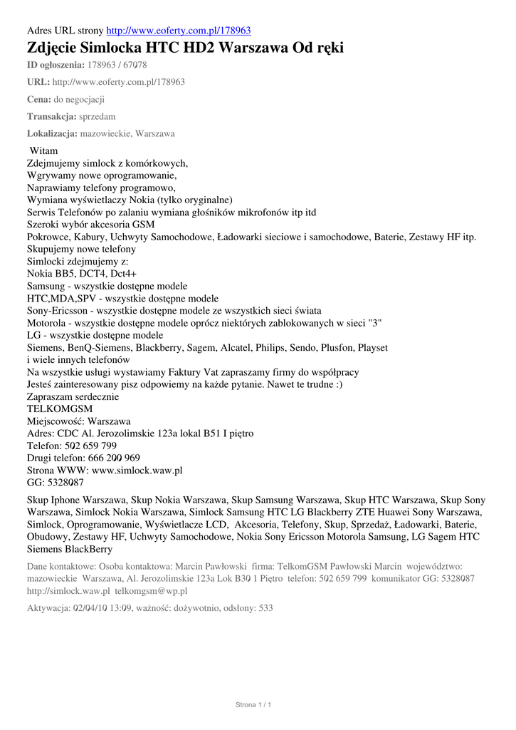 Adres URL strony http://www.eoferty.com.pl/178963 Zdjęcie Simlocka HTC HD2 Warszawa Od ręki ID ogłoszenia: 178963 / 67078 URL: http://www.eoferty.com.pl/178963 Cena: do negocjacji Transakcja: sprzedam Lokalizacja: mazowieckie, Warszawa Witam Zdejmujemy simlock z komórkowych, Wgrywamy nowe oprogramowanie, Naprawiamy telefony programowo, Wymiana wyświetlaczy Nokia (tylko oryginalne) Serwis Telefonów po zalaniu wymiana głośników mikrofonów itp itd Szeroki wybór akcesoria GSM Pokrowce, Kabury, Uchwyty Samochodowe, Ładowarki sieciowe i samochodowe, Baterie, Zestawy HF itp. Skupujemy nowe telefony Simlocki zdejmujemy z: Nokia BB5, DCT4, Dct4+ Samsung - wszystkie dostępne modele HTC,MDA,SPV - wszystkie dostępne modele Sony-Ericsson - wszystkie dostępne modele ze wszystkich sieci świata Motorola - wszystkie dostępne modele oprócz niektórych zablokowanych w sieci "3" LG - wszystkie dostępne modele Siemens, BenQ-Siemens, Blackberry, Sagem, Alcatel, Philips, Sendo, Plusfon, Playset i wiele innych telefonów Na wszystkie usługi wystawiamy Faktury Vat zapraszamy firmy do współpracy Jesteś zainteresowany pisz odpowiemy na każde pytanie. Nawet te trudne :) Zapraszam serdecznie TELKOMGSM Miejscowość: Warszawa Adres: CDC Al. Jerozolimskie 123a lokal B51 I piętro Telefon: 502 659 799 Drugi telefon: 666 200 969 Strona WWW: www.simlock.waw.pl GG: 5328087 Skup Iphone Warszawa, Skup Nokia Warszawa, Skup Samsung Warszawa, Skup HTC Warszawa, Skup Sony Warszawa, Simlock Nokia Warszawa, Simlock Samsung HTC LG Blackberry ZTE Huawei Sony Warszawa, Simlock, Oprogramowanie, Wyświetlacze LCD, Akcesoria, Telefony, Skup, Sprzedaż, Ładowarki, Baterie, Obudowy, Zestawy HF, Uchwyty Samochodowe, Nokia Sony Ericsson Motorola Samsung, LG Sagem HTC Siemens BlackBerry Dane kontaktowe: Osoba kontaktowa: Marcin Pawłowski firma: TelkomGSM Pawłowski Marcin województwo: mazowieckie Warszawa, Al. Jerozolimskie 123a Lok B30 1 Piętro telefon: 502 659 799 komunikator GG: 5328087 http://simlock.waw.pl [email protected] Aktywacja: 02/04/10 13:09, ważność: dożywotnio, odsłony: 533 Strona 1 / 1