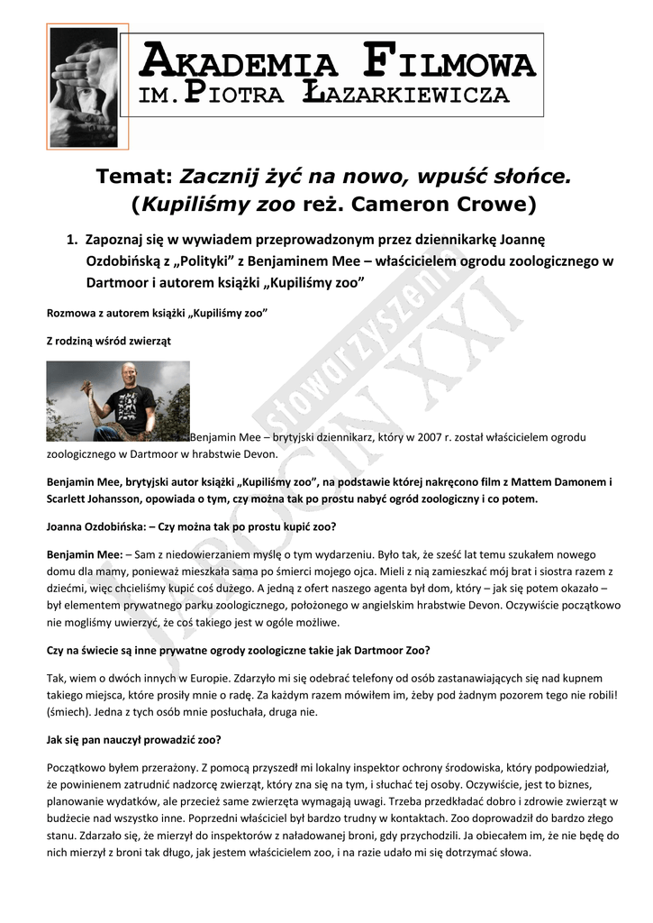 Temat: Zacznij żyć na nowo, wpuść słońce. (Kupiliśmy zoo reż. Cameron Crowe) 1. Zapoznaj się w wywiadem przeprowadzonym przez dziennikarkę Joannę Ozdobińską z „Polityki” z Benjaminem Mee – właścicielem ogrodu zoologicznego w Dartmoor i autorem książki „Kupiliśmy zoo” Rozmowa z autorem książki „Kupiliśmy zoo” Z rodziną wśród zwierząt Benjamin Mee – brytyjski dziennikarz, który w 2007 r. został właścicielem ogrodu zoologicznego w Dartmoor w hrabstwie Devon. Benjamin Mee, brytyjski autor książki „Kupiliśmy zoo”, na podstawie której nakręcono film z Mattem Damonem i Scarlett Johansson, opowiada o tym, czy można tak po prostu nabyć ogród zoologiczny i co potem. Joanna Ozdobińska: – Czy można tak po prostu kupić zoo? Benjamin Mee: – Sam z niedowierzaniem myślę o tym wydarzeniu. Było tak, że sześć lat temu szukałem nowego domu dla mamy, ponieważ mieszkała sama po śmierci mojego ojca. Mieli z nią zamieszkać mój brat i siostra razem z dziećmi, więc chcieliśmy kupić coś dużego. A jedną z ofert naszego agenta był dom, który – jak się potem okazało – był elementem prywatnego parku zoologicznego, położonego w angielskim hrabstwie Devon. Oczywiście początkowo nie mogliśmy uwierzyć, że coś takiego jest w ogóle możliwe. Czy na świecie są inne prywatne ogrody zoologiczne takie jak Dartmoor Zoo? Tak, wiem o dwóch innych w Europie. Zdarzyło mi się odebrać telefony od osób zastanawiających się nad kupnem takiego miejsca, które prosiły mnie o radę. Za każdym razem mówiłem im, żeby pod żadnym pozorem tego nie robili! (śmiech). Jedna z tych osób mnie posłuchała, druga nie. Jak się pan nauczył prowadzić zoo? Początkowo byłem przerażony. Z pomocą przyszedł mi lokalny inspektor ochrony środowiska, który podpowiedział, że powinienem zatrudnić nadzorcę zwierząt, który zna się na tym, i słuchać tej osoby. Oczywiście, jest to biznes, planowanie wydatków, ale przecież same zwierzęta wymagają uwagi. Trzeba przedkładać dobro i zdrowie zwierząt w budżecie nad wszystko inne. Poprzedni właściciel był bardzo trudny w kontaktach. Zoo doprowadził do bardzo złego stanu. Zdarzało się, że mierzył do inspektorów z naładowanej broni, gdy przychodzili. Ja obiecałem im, że nie będę do nich mierzył z broni tak długo, jak jestem właścicielem zoo, i na razie udało mi się dotrzymać słowa. Kiedy zdecydował się pan napisać książkę „Kupiliśmy zoo”? Ponieważ nie miałem pojęcia o prowadzeniu zoo, od początku zacząłem spisywać wszystko, co dotyczyło kierowania nim, uczenia się go krok po kroku. Wydawało mi się, że wiem trochę o psychologii zwierząt, ale nie znałem się kompletnie na interesach. Za to miałem doświadczenie z pisaniem – przez dłuższy czas publikowałem felietony w brytyjskim dzienniku „The Guardian”. Długo nie wspominałem w redakcji, że kupuję zoo, ale w końcu postanowiłem to ujawnić. Skończyło się na tym, że zacząłem pisać o naszym zoo do gazety, a potem powstała książka, która ukazała się na całym świecie, a teraz została sfilmowana. Jaki wpływ na całą rodzinę miało zamieszkanie w zoo? Moja żona zmarła na raka tuż po tym, gdy kupiliśmy ogród. Przeżyliśmy jako rodzina tragedię, ale dzięki zoo nasze życie się nie zatrzymało. Zwierzęta nadal trzeba było nakarmić, sprzątnąć wybiegi i klatki, zrobić zakupy i opłacić pracowników. W trakcie negocjacji przy zakupie zoo pomyślałem sobie, że jesteśmy tacy sami jak zwierzęta – po prostu kolejna rodzina ssaków, które są w stanie zająć się innymi ssakami, zapewnić im godne życie. Córka i syn aktywnie uczestniczą w życiu zoo, a w weekendy, gdy nie chodzą do szkoły, zajmują się zwierzętami i sami robią prezentacje na ich temat przed odwiedzającymi. Wiem, że są w zoo całkowicie bezpieczni. Jakie jest pana zdanie na temat krytykowania ogrodów zoologicznych przez organizacje walczące o prawa zwierząt? Interesuje mnie dyskusja na ten temat. Gdy kupiliśmy zoo, byłem właśnie w trakcie pisania książki o zwierzęcej inteligencji, której zresztą później przez natłok zajęć nie udało mi się skończyć. Pomyślałem wtedy, że mógłbym połączyć przyjemne z pożytecznym i dalej pracować, obserwując zwierzęta. Początkowo mieliśmy problemy z organizacją walczącą o prawa zwierząt. Jej członkowie przecięli ogrodzenie wybiegu dla jeleni, zanim jeszcze przejęliśmy zoo, ale żadne ze zwierząt nie uciekło – wcale nie chciały wychodzić poza teren wybiegu. Zawsze chciałem zadać im pytanie: skoro uważają trzymanie zwierząt w zoo za nieodpowiednie, to co mogą zaproponować w zamian? Na przykład w przypadku jaguarów, których naturalne środowisko życia w puszczy amazońskiej jest praktycznie całkowicie zniszczone. Niedługo niektóre gatunki zwierząt w zoo będą w ogóle jedynymi egzemplarzami na świecie. Więc jestem jak najbardziej otwarty na dyskusje i propozycje tego, jak podtrzymać przy życiu ostatnie żyjące sztuki. Czy wyobrażał sobie pan, że historia pana rodziny trafi do Hollywood? Gdy pisałem książkę „Kupiliśmy zoo”, miałem nadzieję, że mogę zwrócić uwagę czytelników na nasze małe Dartmoor Zoo. Ale nigdy w taki sposób, stając się materiałem na scenariusz filmowy. Scenariusz „Kupiliśmy zoo” przeniósł placówkę z Anglii do Kalifornii. Nie sprzeciwiał się pan temu? Na samym początku miałem wątpliwości i nalegałem, żeby film był kręcony u nas. Niestety, zdjęcia wypadały w europejską zimę, a filmowcy potrzebowali ładnych widoków i słonecznej pogody. Poza tym bardzo cierpliwie wytłumaczono mi tajniki powstawania filmów z żywymi zwierzętami, które muszą być wytresowane i odpowiadać na komendy opiekunów. W rzeczywistości jest tak, że jeśli chcemy zwrócić uwagę kilku lwów na jakąś rzecz, to będziemy mieli og