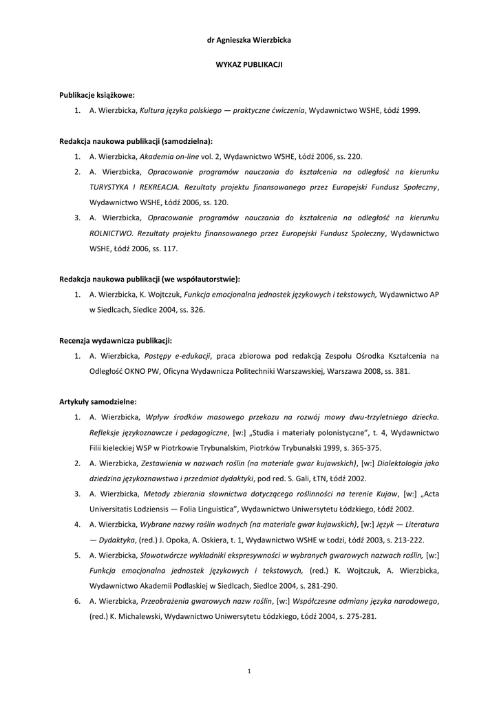 dr Agnieszka Wierzbicka WYKAZ PUBLIKACJI Publikacje książkowe: 1. A. Wierzbicka, Kultura języka polskiego — praktyczne ćwiczenia, Wydawnictwo WSHE, Łódź 1999. Redakcja naukowa publikacji (samodzielna): 1. A. Wierzbicka, Akademia on-line vol. 2, Wydawnictwo WSHE, Łódź 2006, ss. 220. 2. A. Wierzbicka, Opracowanie programów nauczania do kształcenia na odległość na kierunku TURYSTYKA I REKREACJA. Rezultaty projektu finansowanego przez Europejski Fundusz Społeczny, Wydawnictwo WSHE, Łódź 2006, ss. 120. 3. A. Wierzbicka, Opracowanie programów nauczania do kształcenia na odległość na kierunku ROLNICTWO. Rezultaty projektu finansowanego przez Europejski Fundusz Społeczny, Wydawnictwo WSHE, Łódź 2006, ss. 117. Redakcja naukowa publikacji (we współautorstwie): 1. A. Wierzbicka, K. Wojtczuk, Funkcja emocjonalna jednostek językowych i tekstowych, Wydawnictwo AP w Siedlcach, Siedlce 2004, ss. 326. Recenzja wydawnicza publikacji: 1. A. Wierzbicka, Postępy e-edukacji, praca zbiorowa pod redakcją Zespołu Ośrodka Kształcenia na Odległość OKNO PW, Oficyna Wydawnicza Politechniki Warszawskiej, Warszawa 2008, ss. 381. Artykuły samodzielne: 1. A. Wierzbicka, Wpływ środków masowego przekazu na rozwój mowy dwu-trzyletniego dziecka. Refleksje językoznawcze i pedagogiczne, [w:] „Studia i materiały polonistyczne”, t. 4, Wydawnictwo Filii kieleckiej WSP w Piotrkowie Trybunalskim, Piotrków Trybunalski 1999, s. 365-375. 2. A. Wierzbicka, Zestawienia w nazwach roślin (na materiale gwar kujawskich), [w:] Dialektologia jako dziedzina językoznawstwa i przedmiot dydaktyki, pod red. S. Gali, ŁTN, Łódź 2002. 3. A. Wierzbicka, Metody zbierania słownictwa dotyczącego roślinności na terenie Kujaw, [w:] „Acta Universitatis Lodziensis — Folia Linguistica”, Wydawnictwo Uniwersytetu Łódzkiego, Łódź 2002. 4. A. Wierzbicka, Wybrane nazwy roślin wodnych (na materiale gwar kujawskich), [w:] Język — Literatura — Dydaktyka, (red.) J. Opoka, A. Oskiera, t. 1, Wydawnictwo WSHE w Łodzi, Łódź 2003, s. 213-222. 5. A. Wierzbicka, Słowotwórcze wykładniki ekspresywności w wybranych gwarowych nazwach roślin, [w:] Funkcja emocjonalna jednostek językowych i tekstowych, (red.) K. Wojtczuk, A. Wierzbicka, Wydawnictwo Akademii Podlaskiej w Siedlcach, Siedlce 2004, s. 281-290. 6. A. Wierzbicka, Przeobrażenia gwarowych nazw roślin, [w:] Współczesne odmiany języka narodowego, (red.) K. Michalewski, Wydawnictwo Uniwersytetu Łódzkiego, Łódź 2004, s. 275-281. 1 dr Agnieszka Wierzbicka 7. A. Wierzbicka, Od czego zależy jakość kształcenia zdalnego? Doświadczenia Polskiego Uniwersytetu Wirtualnego, „Firma i rynek”, kwiecień 2005, nr specjalny Wirtualne campusy — nowy wymiar edukacji, s. 100-103. 8. A. Wierzbicka, Jakość kształcenia w e-nauczaniu, [w:] Media i metody wspomagające jakość kształcenia, (red.) K. Jankowski, B. Sitarska, C. Tkaczuk, Wydawnictwo Akademii Podlaskiej, Siedlce 2005, s. 317-326. 9. A. Wierzbicka, Świat zwierząt odzwierciedlony w gwarowych nazwach roślin, [w:] Nazewnictwo na pograniczach, (red.) J. Ignatowicz-Skowrońska, „Rozprawy i studia” t. (DCLX) 386, Wydawnictwo Uniwersytetu Szczecińskiego, Szczecin 2005, s. 439-449. 10. A. Wierzbicka, Koncepcja dydaktyczna nauczania hybrydowego na kierunku rolnictwo, [w:] Opracowanie programów nauczania do kształcenia na odległość na kierunku ROLNICTWO. Rezultaty projektu finansowanego przez Europejski Fundusz Społeczny, (red.) A. Wierzbicka, Wydawnictwo WSHE w Łodzi, Łódź 2006, s. 33-42. 11. A. Wierzbicka, Koncepcja prowadzenia zajęć zdalnych (metodyka e-learningu) oraz system zapewnienia jakości, [w:] Opracowanie programów nauczania do kształcenia na odległość na kierunku ROLNICTWO. Rezultaty projektu finansowanego przez Europejski Fundusz Społeczny, (red.) A. Wierzbicka, Wydawnictwo WSHE w Łodzi, Łódź 2006, s. 43-76. 12. A. Wierzbicka, Koncepcja dydaktyczna nauczania hybrydowego na kierunku turystyka i rekreacja, [w:] Opracowanie programów nauczania do kształcenia na odległość na kierunku TURYSTYKA I REKREACJA. Rezultaty projektu finansowanego przez Europejski Fundusz Społeczny, (red.) A. Wierzbicka, Wydawnictwo WSHE w Łodzi, Łódź 2006, s. 33-42. 13. A. Wierzbicka, Koncepcja prowadzenia zajęć zdalnych (metodyka e-learningu) oraz system zapewnienia jakości, [w:] Opracowanie programów nauczania do kształcenia na odległość na kierunku TURYSTYKA I REKREACJA. Rezultaty projektu finansowanego przez Europejski Fundusz Społeczny, (red.) A. Wierzbicka, Wydawnictwo WSHE w Łodzi, Łódź 2006, s. 43-66. 14. A. Wierzbicka, Relacja z II Konferencji Naukowej Akademia on-line, „E-mentor”, nr 4 (16) październik 2006, Wydawnictwo Szkoły Głównej Handlowej w Warszawie, Warszawa, s. 33-34. 15. A. Wierzbicka, Emocje odzwierciedlone w określeniach kobiet, czyli: jak młodzież nazywa dziś ‘dziewczynę’ i ‘kobietę’? [w:] Wokół Językowej funkcji emocjonalnej. Fakty dawne i współczesne, red. K. Wojtczuk, V. Machnickiej, Wydawnictwo Akademii Podlaskiej w Siedlcach, Siedlce 2006, s. 337-346. 16. A. Wierzbicka, Czy podanie może wyrażać emocje?, [w:] Wyrażanie emocji, (red.) K. Michalewski, Wydawnictwo Uniwersytetu Łódzkiego, Łódź 2006, s. 438–444. 17. A. Wierzbicka, Komunikowanie się w procesie e-nauczania. Student i wykładowca w Internecie, [w:] Kultura i język mediów, (red.) M. Tanaś, Oficyna Wydawnicza „Impuls”, Kraków 2007, s. 261–270. 18. A. Wierzbicka, Metodyczne i technologiczne opracowanie materiałów dydaktycznych przygotowanych w projekcie realizowanym przez Uniwersytet Łódzkim E-Ekonomia studia bez barier, [w:] E-edukacja.net, (red.) M. Dąbrowski, M. Zając, Fundacja Promocji i Akredytacji Kierunków Ekonomicznych, Warszawa 2007, s. 107–112. 2 dr Agnieszka Wierzbicka 19. A. Wierzbicka, Przygotowanie materiałów wspierających e-nauczanie, [w:] Wykorzystanie technologii informatycznych w aka