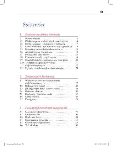 XI Spis treści 1 Podstawy oraz istotne informacje 1.1 1.2 1.3 1.4 1.5 1.6 1.7 1.8 1.9 1.10 Wprowadzenie . . . . . . . . . . . . . . . . . . . . . . . . . . . . . Olejki eteryczne – ich działanie na człowieka . . . Olejki eteryczne – ich funkcja w roślinach . . . . . . Olejki eteryczne – ich wpływ na naszą psychikę Feromony – niewidzialna komunikacja . . . . . . . . Aromaterapia a homeopatia . . . . . . . . . . . . . . . . . . Pochodzenie oraz zbiory . . . . . . . . . . . . . . . . . . . . . Rozmaite metody pozyskiwania . . . . . . . . . . . . . . Czystość olejków – rzeczywistość oraz fikcja. . . . Trwałość oraz przechowywanie olejków eterycznych . . . . . . . . . . . . . . . . . . . . . . . . . 1.11 Etykieta – źródło wiedzy o jakości olejku . . . . . . . 2 Zastosowanie i dawkowanie 2.1 2.2 2.3 2.4 2.5 2.6 2.7 Właściwe dozowanie i zastosowanie olejków eterycznych . . . . . . . . . . . . . . . . . . . . . . . . Dobroczynny masaż . . . . . . . . . . . . . . . . . . . . . . . . Jak często i jak długo stosować olejki . . . . . . . . . . Działania uboczne . . . . . . . . . . . . . . . . . . . . . . . . . . Hydrolaty – lecznicze wody . . . . . . . . . . . . . . . . . . Olejki roślinne . . . . . . . . . . . . . . . . . . . . . . . . . . . . . . Emulgatory . . . . . . . . . . . . . . . . . . . . . . . . . . . . . . . . 3 Dolegliwości oraz obszary zastosowania 3.1 3.2 3.3 3.4 3.5 3.6 Ciąża i okres karmienia . . . . . . . . . . . . . . . . . . . . . . Leczenie dzieci . . . . . . . . . . . . . . . . . . . . . . . . . . . . . Duch oraz dusza . . . . . . . . . . . . . . . . . . . . . . . . . . . . Oczyszczanie powietrza . . . . . . . . . . . . . . . . . . . . . Choroby przeziębieniowe . . . . . . . . . . . . . . . . . . . . Skóra i włosy . . . . . . . . . . . . . . . . . . . . . . . . . . . . . . . Aromaterapia-Famillie.indd XI 1 4 7 8 13 14 15 18 21 22 24 27 42 48 50 58 60 74 79 94 104 116 118 130 2009-06-23 10:38:55 XII Spis treści 3.7 3.8 3.9 3.10 3.11 3.12 3.13 3.14 3.15 Aromaterapia-Famillie.indd XII Jama ustna i zęby . . . . . . . . . . . . . . . . . . . . . . . . . . . Typowe dolegliwości kobiece . . . . . . . . . . . . . . . . . Schorzenia organów wewnętrznych . . . . . . . . . . . Schorzenia układu mięśniowego i ruchowego . . . Bóle głowy i migreny . . . . . . . . . . . . . . . . . . . . . . . . Żylaki i hemoroidy . . . . . . . . . . . . . . . . . . . . . . . . . . Sen . . . . . . . . . . . . . . . . . . . . . . . . . . . . . . . . . . . . . . . Opieka nad osobami starszymi . . . . . . . . . . . . . . . Towarzyszenie osobie umierającej . . . . . . . . . . . . . 144 148 150 158 164 168 170 173 183 Literatura pomocnicza . . . . . . . . . . . . . . . . . . . . . . . . . . . . Spis fotografii . . . . . . . . . . . . . . . . . . . . . . . . . . . . . . . . . . . Spis alfabetyczny haseł . . . . . . . . . . . . . . . . . . . . . . . . . . . 187 188 189 2009-06-23 10:38:55