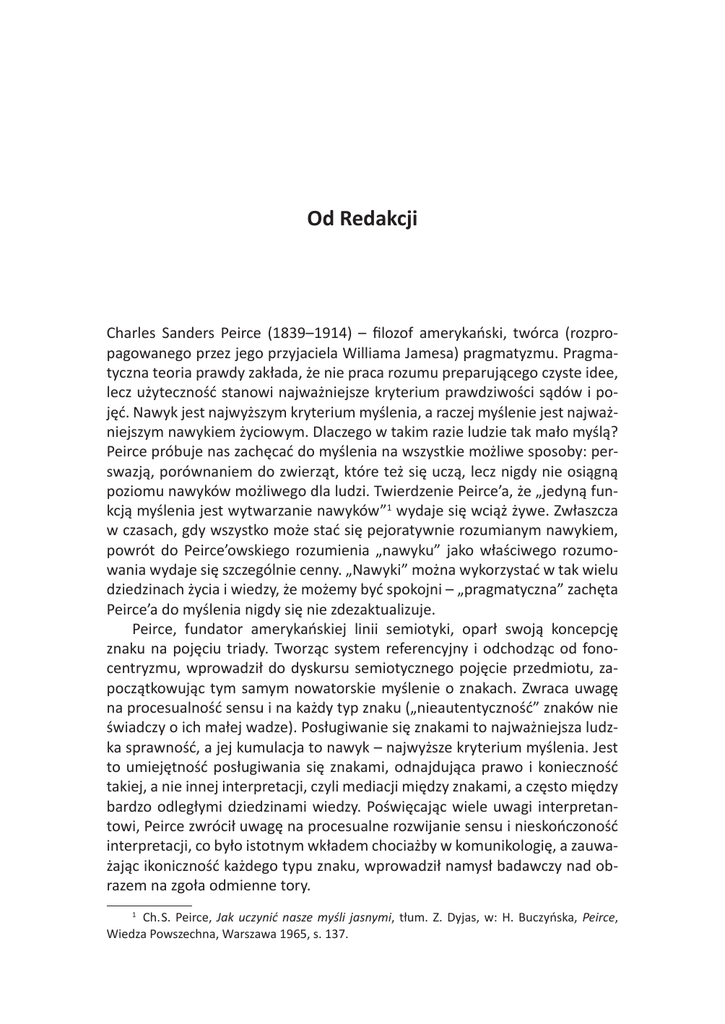 Od Redakcji Charles Sanders Peirce (1839–1914) – filozof amerykański, twórca (rozpropagowanego przez jego przyjaciela Williama Jamesa) pragmatyzmu. Pragmatyczna teoria prawdy zakłada, że nie praca rozumu preparującego czyste idee, lecz użyteczność stanowi najważniejsze kryterium prawdziwości sądów i pojęć. Nawyk jest najwyższym kryterium myślenia, a raczej myślenie jest najważniejszym nawykiem życiowym. Dlaczego w takim razie ludzie tak mało myślą? Peirce próbuje nas zachęcać do myślenia na wszystkie możliwe sposoby: perswazją, porównaniem do zwierząt, które też się uczą, lecz nigdy nie osiągną poziomu nawyków możliwego dla ludzi. Twierdzenie Peirce’a, że „jedyną fun kcją myślenia jest wytwarzanie nawyków”1 wydaje się wciąż żywe. Zwłaszcza w czasach, gdy wszystko może stać się pejoratywnie rozumianym nawykiem, powrót do Peirce’owskiego rozumienia „nawyku” jako właściwego rozumowania wydaje się szczególnie cenny. „Nawyki” można wykorzystać w tak wielu dziedzinach życia i wiedzy, że możemy być spokojni – „pragmatyczna” zachęta Peirce’a do myślenia nigdy się nie zdezaktualizuje. Peirce, fundator amerykańskiej linii semiotyki, oparł swoją koncepcję znaku na pojęciu triady. Tworząc system referencyjny i odchodząc od fonocentryzmu, wprowadził do dyskursu semiotycznego pojęcie przedmiotu, zapoczątkowując tym samym nowatorskie myślenie o znakach. Zwraca uwagę na procesualność sensu i na każdy typ znaku („nieautentyczność” znaków nie świadczy o ich małej wadze). Posługiwanie się znakami to najważniejsza ludzka sprawność, a jej kumulacja to nawyk – najwyższe kryterium myślenia. Jest to umiejętność posługiwania się znakami, odnajdująca prawo i konieczność takiej, a nie innej interpretacji, czyli mediacji między znakami, a często między bardzo odległymi dziedzinami wiedzy. Poświęcając wiele uwagi interpretantowi, Peirce zwrócił uwagę na procesualne rozwijanie sensu i nieskończoność interpretacji, co było istotnym wkładem chociażby w komunikologię, a zauważając ikoniczność każdego typu znaku, wprowadził namysł badawczy nad obrazem na zgoła odmienne tory. 1 Ch.S. Peirce, Jak uczynić nasze myśli jasnymi, tłum. Z. Dyjas, w: H. Buczyńska, Peirce, Wiedza Powszechna, Warszawa 1965, s. 137. 8 Od Redakcji Będąc przekonane o wielowymiarowości, transdyscyplinarności i aktualności myśli Ch.S. Peirce’a, proponujemy lekturę niniejszego numeru „Studiów Kulturoznawczych”, w całości poświęconego zgłębianiu spuścizny tego wybitnego autora. W kwietniu 2014 r. przypadła setna rocznica śmierci amerykańskiego pragmatysty, która stała się dla nas impulsem do przypomnienia szerszemu kręgowi czytelników koncepcji Peirce’a. Wówczas to w Instytucie Kulturoznawstwa UAM zorganizowałyśmy panel dyskusyjny, którego pomysłodawczynią była jedna z nas (Katarzyna Machtyl), i zachęcone jego powodzeniem rozpoczęłyśmy prace nad tomem, który przekazujemy dziś w ręce Czytelników. Na numer składają się teksty zarówno kulturoznawców i filozofów, jak również psychologów i językoznawców, co tylko potwierdza możliwość stosowania koncepcji Peirce’a w różnych dyscyplinach naukowych. O wyjątkowości niniejszej publikacji stanowi także jej dwujęzyczność: zaproszenie do złożenia tekstów przyjęli wybitni badacze myśli Peirce’a, reprezentujący światowe ośrodki naukowe (Stany Zjednoczone, Brazylię, Niemcy, Danię i Polskę). W efekcie na tom składają się dwie części: polsko- i anglojęzyczna. W numerze można także wyróżnić kilka mniejszych części: pierwszą, poświęconą panelowi dyskusyjnemu, rozpoczyna krótkie omówienie motywów jego zorganizowania oraz opis przebiegu; następnie artykuły trzech zabierających wówczas głos prelegentek, zbudowane na podstawie ich wypowiedzi; wreszcie autoryzowany zapis dyskusji, która ów panel zwieńczyła. Na drugą i trzecią część tomu składają się teksty polskojęzyczne autorstwa znakomitych badaczy myśli Peirce’a, reprezentujących rozmaite perspektywy badawcze. Warto nadmienić, że artykuł prof. Winfrieda Nötha, został specjalnie przygotowany przez autora dla polskiego czytelnika i przełożony na język polski przez Michała Sobocińskiego. Wśród artykułów w tej części tomu znajduje się także przedruk tekstu wybitnej znawczyni i popularyzatorki myśli Peirce’a, prof. Hanny Buczyńskiej-Garewicz. Jest to dla nas ogromny zaszczyt i radość, iż możemy przypomnieć ten niezwykle ważny artykuł, zwłaszcza że nie jest on dostępny w wersji elektronicznej, a nakład tomu, w jakim pierwotnie się ukazał, został wyczerpany. Jako że planowałyśmy przedstawić także spojrzenie najmłodszych adeptów nauki, oddałyśmy głos studentom. Część polskojęzyczną kończy autoryzowany zapis dyskusji, jaką w marcu 2015 r. Agnieszka Doda-Wyszyńska przeprowadziła ze studentami kulturoznawstwa UAM wokół Zaniedbanego Argumentu Peirce’a. Wreszcie zbiór tekstów anglojęzycznych, co pozwala zapoznać się z recepcją Peirce’a poza granicami Polski, a także po części czyni numer dostępnym czytelnikowi niepolskojęzycznemu. Tom kończy część, na którą składają się dwie recenzje: nowe spojrzenie na Peirce’owski Zaniedbany Argument i inne pisma z lat 1907–1913 oraz uwagi na temat książki kanadyjskiego semiotyka Paula Bouissaca Semiotics at the Circus. Od Redakcji 9 W tomie opublikowane zostały artykuły zgłębiające zarówno wybrany obszar Peirce’owskiej myśli, jak i takie, które w perspektywie porównawczej zestawiają koncepcje pragmatysty z innymi podejściami teoretycznymi, oraz takie, które ukazują aktualność myśli Peirce’a i możliwość jej stosowania do wyjaśniania rozmaitych współczesnych zjawisk i praktyk kulturowych. Jesteśmy przekonane, że niniejszy numer „Studiów Kulturoznawczych”
