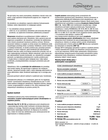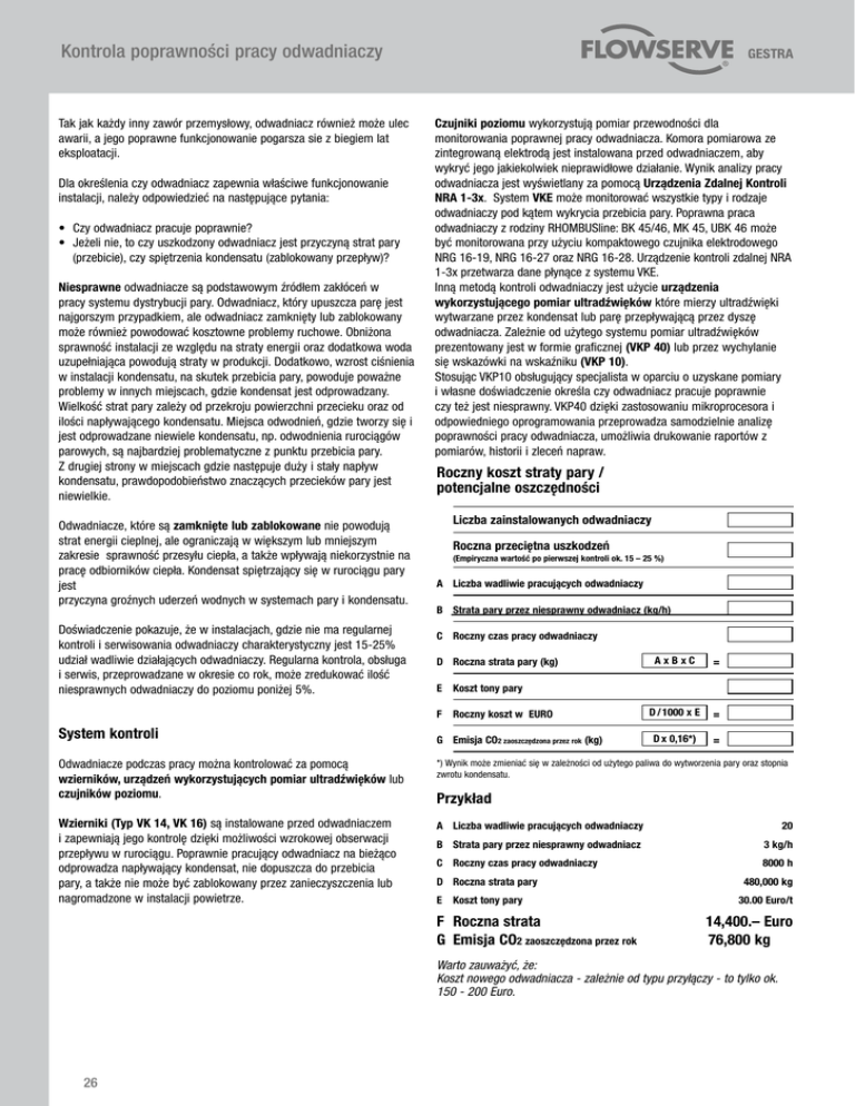 Kontrola poprawności pracy odwadniaczy Tak jak każdy inny zawór przemysłowy, odwadniacz również może ulec awarii, a jego poprawne funkcjonowanie pogarsza sie z biegiem lat eksploatacji. Dla określenia czy odwadniacz zapewnia właściwe funkcjonowanie instalacji, należy odpowiedzieć na następujące pytania: • Czy odwadniacz pracuje poprawnie? • Jeżeli nie, to czy uszkodzony odwadniacz jest przyczyną strat pary (przebicie), czy spiętrzenia kondensatu (zablokowany przepływ)? Niesprawne odwadniacze są podstawowym źródłem zakłóceń w pracy systemu dystrybucji pary. Odwadniacz, który upuszcza parę jest najgorszym przypadkiem, ale odwadniacz zamknięty lub zablokowany może również powodować kosztowne problemy ruchowe. Obniżona sprawność instalacji ze względu na straty energii oraz dodatkowa woda uzupełniająca powodują straty w produkcji. Dodatkowo, wzrost ciśnienia w instalacji kondensatu, na skutek przebicia pary, powoduje poważne problemy w innych miejscach, gdzie kondensat jest odprowadzany. Wielkość strat pary zależy od przekroju powierzchni przecieku oraz od ilości napływającego kondensatu. Miejsca odwodnień, gdzie tworzy się i jest odprowadzane niewiele kondensatu, np. odwodnienia rurociągów parowych, są najbardziej problematyczne z punktu przebicia pary. Z drugiej strony w miejscach gdzie następuje duży i stały napływ kondensatu, prawdopodobieństwo znaczących przecieków pary jest niewielkie. Odwadniacze, które są zamknięte lub zablokowane nie powodują strat energii cieplnej, ale ograniczają w większym lub mniejszym zakresie sprawność przesyłu ciepła, a także wpływają niekorzystnie na pracę odbiorników ciepła. Kondensat spiętrzający się w rurociągu pary jest przyczyna groźnych uderzeń wodnych w systemach pary i kondensatu. Doświadczenie pokazuje, że w instalacjach, gdzie nie ma regularnej kontroli i serwisowania odwadniaczy charakterystyczny jest 15-25% udział wadliwie działających odwadniaczy. Regularna kontrola, obsługa i serwis, przeprowadzane w okresie co rok, może zredukować ilość niesprawnych odwadniaczy do poziomu poniżej 5%. Czujniki poziomu wykorzystują pomiar przewodności dla monitorowania poprawnej pracy odwadniacza. Komora pomiarowa ze zintegrowaną elektrodą jest instalowana przed odwadniaczem, aby wykryć jego jakiekolwiek nieprawidłowe działanie. Wynik analizy pracy odwadniacza jest wyświetlany za pomocą Urządzenia Zdalnej Kontroli NRA 1-3x. System VKE może monitorować wszystkie typy i rodzaje odwadniaczy pod kątem wykrycia przebicia pary. Poprawna praca odwadniaczy z rodziny RHOMBUSline: BK 45/46, MK 45, UBK 46 może być monitorowana przy użyciu kompaktowego czujnika elektrodowego NRG 16-19, NRG 16-27 oraz NRG 16-28. Urządzenie kontroli zdalnej NRA 1-3x przetwarza dane płynące z systemu VKE. Inną metodą kontroli odwadniaczy jest użycie urządzenia wykorzystującego pomiar ultradźwięków które mierzy ultradźwięki wytwarzane przez kondensat lub parę przepływającą przez dyszę odwadniacza. Zależnie od użytego systemu pomiar ultradźwięków prezentowany jest w formie graficznej (VKP 40) lub przez wychylanie się wskazówki na wskaźniku (VKP 10). Stosując VKP10 obsługujący specjalista w oparciu o uzyskane pomiary i własne doświadczenie określa czy odwadniacz pracuje poprawnie czy też jest niesprawny. VKP40 dzięki zastosowaniu mikroprocesora i odpowiedniego oprogramowania przeprowadza samodzielnie analizę poprawności pracy odwadniacza, umożliwia drukowanie raportów z pomiarów, historii i zleceń napraw. Roczny koszt straty pary / potencjalne oszczędności Liczba zainstalowanych odwadniaczy Roczna przeciętna uszkodzeń (Empiryczna wartość po pierwszej kontroli ok. 15 – 25 %) A Liczba wadliwie pracujących odwadniaczy B Strata pary przez niesprawny odwadniacz (kg/h) C Roczny czas pracy odwadniaczy D Roczna strata pary (kg) = D / 1000 x E = D x 0,16*) = E Koszt tony pary F Roczny koszt w EURO System kontroli A x B x C G Emisja CO2 zaoszczędzona przez rok (kg) Odwadniacze podczas pracy można kontrolować za pomocą wzierników, urządzeń wykorzystujących pomiar ultradźwięków lub czujników poziomu. *)Wynik może zmieniać się w zależności od użytego paliwa do wytworzenia pary oraz stopnia zwrotu kondensatu. Wzierniki (Typ VK 14, VK 16) są instalowane przed odwadniaczem i zapewniają jego kontrolę dzięki możliwości wzrokowej obserwacji przepływu w rurociągu. Poprawnie pracujący odwadniacz na bieżąco odprowadza napływający kondensat, nie dopuszcza do przebicia pary, a także nie może być zablokowany przez zanieczyszczenia lub nagromadzone w instalacji powietrze. A Liczba wadliwie pracujących odwadniaczy Przykład 20 B Strata pary przez niesprawny odwadniacz 3 kg/h C Roczny czas pracy odwadniaczy 8000 h D Roczna strata pary 480,000 kg E Koszt tony pary 30.00 Euro/t F Roczna strata G Emisja CO2 zaoszczędzona przez rok 14,400.– Euro 76,800 kg Warto zauważyć, że: Koszt nowego odwadniacza - zależnie od typu przyłączy - to tylko ok. 150 - 200 Euro. 26 Urządzenia do kontroli poprawności pracy odwadniaczy Typ Wzierniki VK 14, VK 16 VKE 16-1, VKE 16A Vapophone VKP 10 TRAPtest VKP 40/VKP 40Ex NRG 16-19 NRG 16-27 NRG 16-28 L VK 14 Wziernik ze szkłem borosilikatowym dla kontroli wymienników i odwadniaczy (instalacja przed odwadniaczem). Wizualna kontrola przepływu w instalacji kondensatu. Komora pomiarowa elektrody poziomu do monitorowania odwadniaczy (instalacja przed odwadniaczem) w celu wykrycia przebicia pary lub spiętrzania kondensatu (VKE 26). Do montażu na poziomych rurociągach lub w odwadniaczu (VKE 26). Czujnik ultradźwiękowy wykrywa przebicia pary w systemach parowych; do monitorowania odwadniaczy i zaworów odcinających. Komputerowy system kontroli, archiwizacji i analizy pracy odwadniaczy wszystkich typów i producentów, do wykrywania przebicia pary i spiętrzania kondensatu. Elektrody poziomu do mo