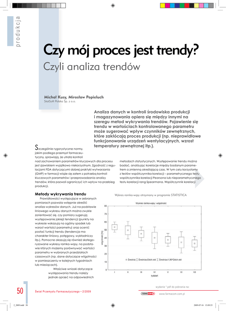 produkcja Czy mój proces jest trendy? Czyli analiza trendów Michał Kusy, Mirosław Popieluch StatSoft Polska Sp. z o.o. S Analiza danych w kontroli środowiska produkcji i magazynowania opiera się między innymi na szeregu metod wykrywania trendów. Pojawienie się trendu w wartościach kontrolowanego parametru może sugerować wpływ czynników zewnętrznych, które zakłócają proces produkcji (np. nieprawidłowe funkcjonowanie urządzeń wentylacyjnych, wzrost temperatury zewnętrznej itp.). zczególnie rygorystyczne normy, jakim podlega przemysł farmaceutyczny, sprawiają, że utrata kontroli nad zachowaniem parametrów kluczowych dla procesu jest zjawiskiem wyjątkowo niekorzystnym. Zgodność z regulacjami FDA dotyczącymi dobrej praktyki wytwarzania (GMP) w farmacji wiąże się zatem z potrzebą kontroli kluczowych parametrów i przeprowadzania analizy trendów, która pozwoli ograniczyć ich wpływ na przebieg produkcji. Metody wykrywania trendu Prawidłowości występujące w zebranych pomiarach pozwala wstępnie określić analiza wykresów danych. Już na podstawie liniowego wykresu danych można zwykle zorientować się, czy pomiary sugerują występowanie jakiejś tendencji (punkty na wykresie wskazują na ogólny spadek lub wzrost wartości parametru) oraz ocenić postać funkcji trendu (tendencja ma charakter liniowy, potęgowy, wykładniczy itp.). Pomocne okazują się również skategoryzowane wykresy ramka-wąsy, na podstawie których możemy porównywać wartości parametru w wybranych przedziałach czasowych (np. dane dotyczące wilgotności w pomieszczeniu w kolejnych tygodniach lub miesiącach). Właściwe wnioski dotyczące występowania trendu należy jednak oprzeć na odpowiednich 50 2_2009.indd 50 metodach statystycznych. Występowanie trendu można badać, analizując korelacje między badanym parametrem a zmienną określającą czas. W tym celu korzystamy z testów współczynnika korelacji – parametrycznego testu współczynnika korelacji Pearsona lub niepa rametrycznego testu korelacji rang Spearmana. Współczynnik korelacji Wykres ramka-wąsy otrzymany w programie STATISTICA wydanie *.pdf do pobrania na: Świat Pr zemys ł u Far mac eut ycznego • 2 /20 0 9 www.farmacom.com.pl 2009-07-16 13:09:53 Inne, stosunkowo łatwe rozwiązanie wykorzystuje analizę regresji prostej, gdzie zmienną zależną jest badany parametr, a zmienną niezależną – czas. Wykrycie trendu sprowadza się w tym przypadku do sprawdzenia, czy współczynnik nachylenia prostej regresji jest istotnie różny od zera. Na podstawie wyliczonych współczynników regresji wyznaczane jest prawdopodobieństwo testowe, które porównujemy z przyjętym poziomem istotności α (np. produkcja przyjmuje wartości z przedziału <-1;1>. Ujemne lub dodatnie wartości współczynnika korelacji wskazują na występowanie trendu odpowiednio: malejącego lub rosnącego. Współczynnik pozwala również określić siłę występującego trendu – im wartości są bliższe -1 lub 1, tym związek badanego parametru ze zmienną określającą czas jest silniejszy. α = 0,05). W przedstawionym poniżej przykładzie wartość prawdopodobieństwa testowego p < 0,05 pozwala odrzucić hipotezę o braku trendu w wartościach pomiarów wilgotności. Test Neumanna wykorzystywany w analizie trendu oparty jest z kolei na porównaniu różnic między sąsiednimi obserwacjami i odległości obserwacji od średniej. W przypadku trendu liniowego odległości od średniej dla początkowych i końcowych pomiarów są przeważnie większe od odległości między sąsiednimi obserwacjami. Wartość statystyki testowej w rozważanym przykładzie jest mniejsza od wartości krytycznej co pozwala na odrzucenie hipotezy o braku trendu na poziomie istotności równym 0,05. Arkusz wyników i wykres otrzymany w programie STATISTICA Zaletą testu Neumanna, w stosunku do testu opartego na regresji prostej są mniejsze wymagania dotyczące liczności próby. Statystyka Neumanna pozwala wykryć trendy już na podstawie kilku punktów pomiarowych. W takiej sytuacji wnioskowanie o trendzie w oparciu o dopasowanie prostej regresji jest praktycznie niemożliwe. Dodatkowo wartości parametrów regresji, podobnie jak współczynnik korelacji, wykazują się małą odpornością na działanie obserwacji odstających. Obserwacje odstające Wykres stworzony w programie STATISTICA Przed rozpoczęciem analizy trendu należy stwierdzić, czy zgromadzone dane nie zawierają obserwacji, które zasadniczo różnią się od innych wartości i w istotny sposób zaburzają informację o rodzaju i sile występującego trendu. Obserwacje odstające mogą być wynik iem np. błędnego pomiaru lub pomyłki przy wprowadzaniu pomiaru do bazy danych. Uwzględnienie obserwacji odstających w analizie wpłynie w szczególności na nachylenie prostej regresji i będzie prowadziło do błędnych wniosków o całym procesie. Wartości, które znacznie odbiegają od pozostałych pomiarów, pozwala wykryć analiza liniowego wykresu danych. Pojawia się jednak problem, od jakiej wartości obserwacje można uznać za odstające, aby decyzja o wykluczeniu ich z analizy nie została uznana za bezpodstawną. W przypadku analizy trendu należałoby zmierzyć, w jakim stopniu kolejne pomiary wpływają na nachylenie linii trendu. wydanie *.pdf do pobrania na: www.farmacom.com.pl 2_2009.indd 51 Świat Pr zemys ł u Far mac eut ycznego • 2 /20 0 9 51 2009-07-16 13:09:54 produkcja Tego typu miarą pozwalającą wykrywać obserwacje odstające jest tzw. odległość Cooka. Jest to miara wpływu danego przypadku na równanie regresji. Wskazuje ona różnice pomiędzy obliczonymi wartościami współczynników regresji a takimi samymi wartościami obliczonymi przy założeniu, że dany pomiar zostałby wyłączony z równania regresji. Jeśli odległości nie są tego samego rzędu, to można przypuszczać, że dany przypadek miał istotny wpływ na obciążenie r
