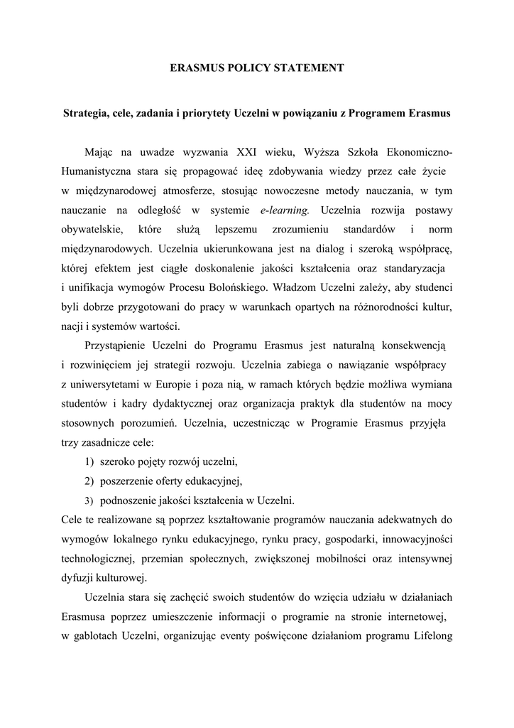 ERASMUS POLICY STATEMENT Strategia, cele, zadania i priorytety Uczelni w powiązaniu z Programem Erasmus Mając na uwadze wyzwania XXI wieku, Wyższa Szkoła EkonomicznoHumanistyczna stara się propagować ideę zdobywania wiedzy przez całe życie w międzynarodowej atmosferze, stosując nowoczesne metody nauczania, w tym nauczanie na odległość w systemie e-learning. Uczelnia rozwija postawy obywatelskie, które służą lepszemu zrozumieniu standardów i norm międzynarodowych. Uczelnia ukierunkowana jest na dialog i szeroką współpracę, której efektem jest ciągłe doskonalenie jakości kształcenia oraz standaryzacja i unifikacja wymogów Procesu Bolońskiego. Władzom Uczelni zależy, aby studenci byli dobrze przygotowani do pracy w warunkach opartych na różnorodności kultur, nacji i systemów wartości. Przystąpienie Uczelni do Programu Erasmus jest naturalną konsekwencją i rozwinięciem jej strategii rozwoju. Uczelnia zabiega o nawiązanie współpracy z uniwersytetami w Europie i poza nią, w ramach których będzie możliwa wymiana studentów i kadry dydaktycznej oraz organizacja praktyk dla studentów na mocy stosownych porozumień. Uczelnia, uczestnicząc w Programie Erasmus przyjęła trzy zasadnicze cele: 1) szeroko pojęty rozwój uczelni, 2) poszerzenie oferty edukacyjnej, 3) podnoszenie jakości kształcenia w Uczelni. Cele te realizowane są poprzez kształtowanie programów nauczania adekwatnych do wymogów lokalnego rynku edukacyjnego, rynku pracy, gospodarki, innowacyjności technologicznej, przemian społecznych, zwiększonej mobilności oraz intensywnej dyfuzji kulturowej. Uczelnia stara się zachęcić swoich studentów do wzięcia udziału w działaniach Erasmusa poprzez umieszczenie informacji o programie na stronie internetowej, w gablotach Uczelni, organizując eventy poświęcone działaniom programu Lifelong Learning Program oraz podczas tzw. dni otwartych organizowanych dla kandydatów na studia. Misją Uczelni jest „obudzić w studentach niepohamowaną ciekawość świata”, która m.in. realizowana jest przez mobilność studentów i pracowników Uczelni, kształtowanie twórczych osobowości oraz umiejętności zdobywania wiedzy. Głównym celem Uczelni jest promowanie szeroko rozumianej współpracy z europejskimi uniwersytetami opartej na zdobywaniu wiedzy, podnoszeniu jakości kształcenia, tworzeniu go bardziej atrakcyjnym dla studentów oraz stworzeniu kadrze naukowej nowych możliwości rozwoju dydaktycznego oraz naukowego. W celu ułatwienia studentom zaliczenia okresu studiów za granicą Uczelnia wprowadziła system transferu i akumulacji punktów ECTS, który konsekwentnie i z powodzeniem stosowany jest w praktyce akademickiej. Ponadto, w Uczelni kładzie się nacisk na rozwijanie zachowań szeroko pojętej tolerancji, dba się o zachowanie wolności, równości i wynikających z tego praw dla jednostki ludzkiej. Studenci uczestnicząc w konferencjach, wykładach i zajęciach akademickich z obcokrajowcami oraz spotykając się z wybitnymi postaciami świata nauki, biznesu i polityki nabywają postaw opartych na wzajemnym szacunku dla odmienności i różnorodności. W wieloletniej praktyce Uczelnia nie spotkała się z przejawami ksenofobii, rasizmu czy nienawiści na tle narodowościowym. Prowadzone przez kadrę dydaktyczną zajęcia w językach obcych w Uczelni macierzystej oraz w uczelniach partnerskich traktowane są jako ważny element w karierze akademickiej pracowników. Corocznie zwiększa się ilość podpisanych umów bilateralnych, rozszerza się wachlarz działań o charakterze międzynarodowym, co powoduje, że Uczelnia integruje się z myślą i ideą Wspólnoty Europejskiej. Równość w polityce Erasmusa Jednym z podstawowych celów polityki Erasmusa jest wyrównywanie szans kobiet i mężczyzn oraz osób niepełnosprawnych poprzez znoszenie barier technicznych w zakresie funkcjonowania Uczelni oraz barier mentalnych w kwestii postrzegania odmienności płci oraz różnorodności kultur i ras. Uczelniany kampus posiada urządzenia, sprzęt i konstrukcję sal dostosowane do swobodnego poruszania się osób niepełnosprawnych. Studenci integrują się w uczelnianym pubie Oscar Wilde, uczestnicząc w eventach kulturalnych i artystycznych. Upublicznienie polityki Erasmusa Pierwszorzędną kwestią dla Uczelni jest upublicznienie Polityki Erasmusa oraz Karty Erasmusa poprzez umieszczenie ich na stronie internetowej Uczelni i w głównych gablotach informacyjnych. Planuje się również promocję działań Erasmusa poprzez organizację Dni Erasmusa, kolportaż ulotek oraz materiałów informacyjnych wśród studentów. Idea mobilności propagowana jest również wśród kandydatów na studia, w czasie tzw. dni otwartych Uczelni. Zapewnienie wysokiej jakości praktyk/staży studenckich Integralną częścią procesu kształcenia w Uczelni są praktyki studenckie. Dla zapewnienia właściwego poziomu praktyk powstał regulamin praktyk studenckich określający szczegółowe zasady ich odbywania. Jednocześnie Uczelnia zadbała o właściwe relacje z biznesowymi partnerami i instytucjami, będącymi potencjalnymi organizatorami praktyk. Studenci wyjeżdżają na praktyki, które są zgodne z kierunkiem studiów oraz ich zainteresowaniami. Preferencje zawodowe dotyczące stażów zagranicznych określane są podczas spotkania ze studentem. Doświadczenie zdobyte za granicą ma na celu zwiększenie szans zawodowych na międzynarodowym rynku pracy. Uczelnia podejmie starania o zorganizowanie wyjazdów studentów na praktykę w ramach programu Erasmus, a także będzie współpracować z partnerskimi uczelniami zagranicznymi w celu umożliwienia im kontaktów z polskimi przedsiębiorstwami, z którymi współpracujemy. Przy organizacji praktyk podczas negocjacji zostanie określony zakres odpowiedzialności uczelni i firmy przyjmującej, kryteria kwalifikacyjne, wynagrodzenie, program praktyki, warunki zakwaterowania, wyznacze