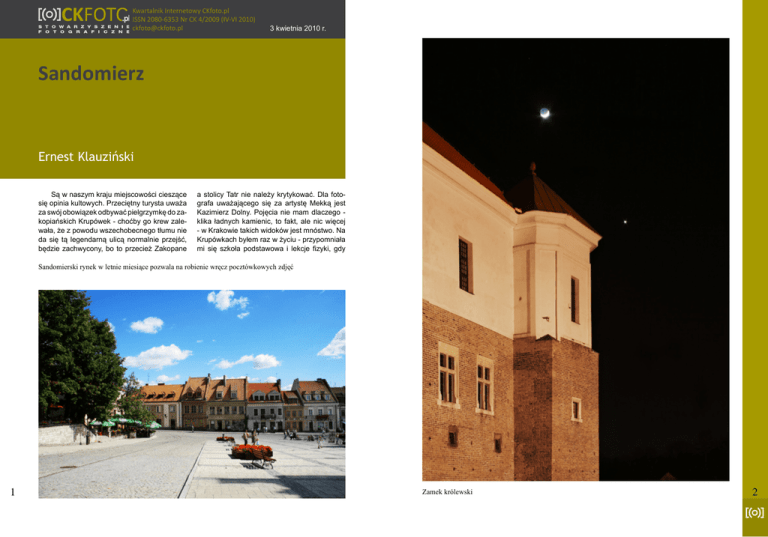 Kwartalnik Internetowy CKfoto.pl ISSN 2080-6353 Nr CK 4/2009 (IV-VI 2010) [email protected] 3 kwietnia 2010 r. Sandomierz Ernest Klauziński Są w naszym kraju miejscowości cieszące się opinia kultowych. Przeciętny turysta uważa za swój obowiązek odbywać pielgrzymkę do zakopiańskich Krupówek - choćby go krew zalewała, że z powodu wszechobecnego tłumu nie da się tą legendarną ulicą normalnie przejść, będzie zachwycony, bo to przecież Zakopane a stolicy Tatr nie należy krytykować. Dla fotografa uważającego się za artystę Mekką jest Kazimierz Dolny. Pojęcia nie mam dlaczego klika ładnych kamienic, to fakt, ale nic więcej - w Krakowie takich widoków jest mnóstwo. Na Krupówkach byłem raz w życiu - przypomniała mi się szkoła podstawowa i lekcje fizyki, gdy Sandomierski rynek w letnie miesiące pozwala na robienie wręcz pocztówkowych zdjęć 1 Zamek królewski 2 Uroczystość zmiany wart nauczycielka tłumaczyła na czym polega ruch międzycząsteczkowy. Kazimierz odwiedziłem dwa razy - roił się od producentów pseudoartystycznych czarno-białych zdjęć zalewających oglądającego brzydotą i brudem. Widziałem między innymi jegomościa w jasnych kraciastych portkach i stylizowanym na ludowy kapeluszu robiącego nocą, bez statywu zdjęcia aparatem dwuobiektywowym. Osobnika wkładającego głowę do ulicznego kosza by zrobić makro niedopałka papierosa nawet nie chcę pamiętać. Jeśli chcecie fotografować zabytki nie przepychając się przez tłum i nie obawiając się, że facet robiący zdjęcia Księżyca z konwerterem makro na obiektywie ugryzie Was w czoło omijajcie Kazimierz Dolny z daleka. Jedźcie do Sandomierza. 3 Jedna z bocznych uliczek sandomierskiej starówki. Wyremontowane i czyste fasady budynków są niewątpliwym atutem miasta. Mało jest w miast Polsce tak starych i bogatych w zabytki. Jego początki sięgają praw- dopodobnie X wieku, choć nie jest wykluczone, że osadnictwo na tym terenie istniało jeszcze wcześniej. Sandomierz odegrał bardzo ważną rolę w historii naszego kraju, przetoczyło się przez niego wiele burz dziejowych. Niemal każda epoka historyczna pozostawiła po sobie jakieś ślady widoczne do dzisiaj. Najsłynniejsza część miasta to oczywiście starówka - miejsce, gdzie można spędzić z aparatem kilka dni - cały jej teren jest bardzo atrakcyjny z punktu widzenia fotografa. Brama Opatowska Jest to jedna z najlepiej zachowanych tego typu budowli w Polsce. Powstała w XIV-XVI wieku i była jedną z czterech bram wjazdowych do miasta. Do dziś pozostała tylko ta jedna. Na zdjęciach praktycznie zawsze wychodzi dobrze - niezależnie od pory dnia czy roku. Warto pokusić się o jej nocne zdjęcia - oświetlona jest dosyć równomiernie, przepalenia nie powinny 4 być więc problemem. Za dnia można skorzystać z okazji i wspiąć się na taras widokowy na szczycie bramy - widok trochę utrudniają elementy wieńczące budynek, ale mimo to da się sfotografować panoramę Sandomierza. Jeśli chcemy robić zdjęcia sąsiednich obiektów przyda się teleobiektyw. Brama stanowi element pozostałości murów miejskich niegdyś okalających Sandomierz, podobnie jak inna słynna atrakcja, czyli „ucho igielne” - wąskie przejście w murach, będące obowiązkowym przystankiem niemal każdej wycieczki zwiedzającej miasto. Rynek i okoliczne uliczki Nie da się go porównać z krakowskim rynkiem - jest o wiele mniejszy jednak nie brak mu uroku. Poza tym nie przewalają się przezeń tłumy turystów a dla osoby pragnącej przede wszystkim dobrych zdjęć to ogromna zaleta. Drugą jest bezpieczeństwo - fotografowałem o różnych porach dnia i nocy - nigdy nie czułem się zagrożony. Powody są dwa - starówka jest bardzo często patrolowana przez policję a ludzie ją zamieszkujący to nie element patologiczny (jak to niestety bardzo często bywa 5 Jeden z najbardziej znanych zabytków Sandomierza to Brama Opatowska. Dwa zdjęcia wykonane z tarasu widokowego na szczycie Bramy Opatowskiej 6 Katedra oraz rynek z ratuszem to kolejne popularne atrakcje miasta 7 w innych miastach). Rynek jest zadbany, tematów do zdjęć nie zabraknie, no chyba, że ktoś jest miłośnikiem cierpiętniczych zdjęć odrapanych podwórek - tu może być problem, bo jak na złość cała okolica jest czysta i dokładnie sprzątana a same kamienice w przeważającej większości wyremontowane i dobrze utrzymane. Większość budynków powstała w XV-XVII wieku - różnią się układem przestrzennym i detalami architektonicznymi. Jedną z atrakcji rynku jest zabytkowa studnia, w jej pobliżu znajduje się wbita w bruk kotwica z łańcuchem wymierzonym w niebo. Wadą są niestety ogródki piwne okolicznych kawiarenek poustawiane w kilku miejscach - parasole osłaniające stoliki mocno przeszkadzają w fotografowaniu zabytków, a uroku zdjęciom nie dodają. Niestety tego typu „ozdoby” stały się cechą charakterystyczną prawie każdego atrakcyjnego turystycznie miejsca w naszym kraju. Problem znika w chłodnych porach roku - jesienią para- sole są usuwane, wracają dopiero w okolicach maja. Ratusz Stanowi centralny element rynku - jest chyba najbardziej znanym sandomierskim zabytkiem. Warto zwrócić uwagę na bogactwo detali zdobiących budynek oraz na zegar słoneczny na południowej ścianie. W okresie przed świętami Bożego Narodzenia budynek jest niestety w dziwaczny sposób przyozdabiany lampkami choinkowymi - ktoś miał dobry pomysł, ale niestety chyba zabrakło natchnienia (albo żarówek) - co roku dekoracja wygląda jak niedokończona. To jest oczywiście drobiazg na ogół sandomierski ratusz jest wdzięcznym obiektem do fotografowania. Katedra Jak na mój gust numer jeden wśród zabytków Sandomierza. Katedra powstała w XIV Przykładowe panoramy jakie można zrobić w Sandomierzu. Górne zdjęcie zrobione zostało u podnóża katedry, dwa kolejne z terenu położonego między obwodnicą miasta a drog
