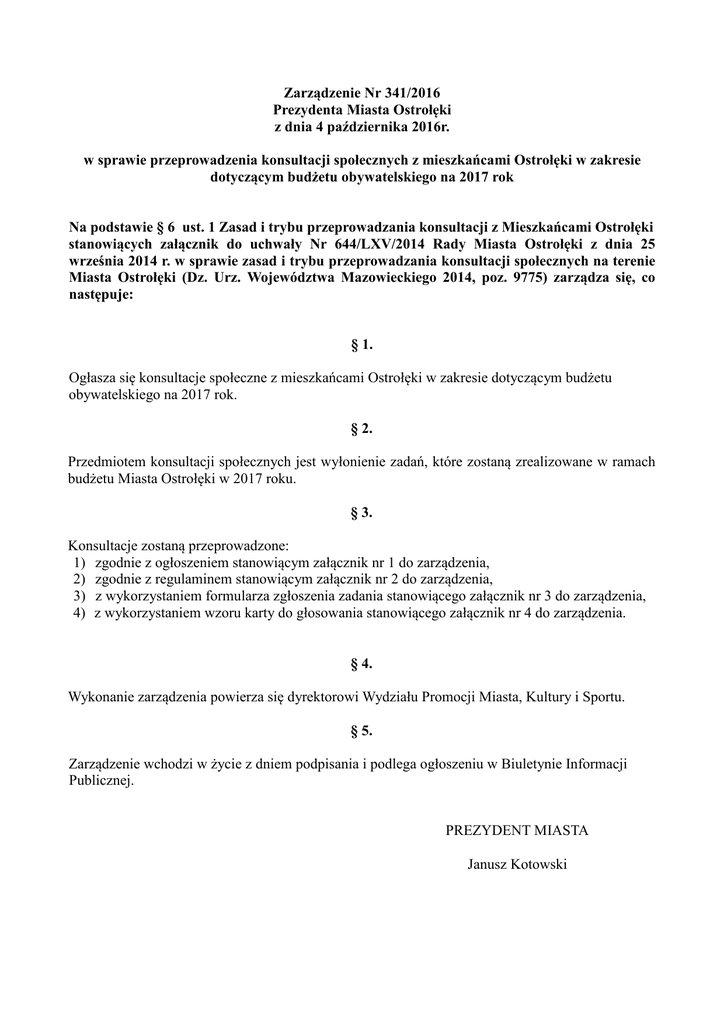 Zarządzenie Nr 341/2016 Prezydenta Miasta Ostrołęki z dnia 4 października 2016r. w sprawie przeprowadzenia konsultacji społecznych z mieszkańcami Ostrołęki w zakresie dotyczącym budżetu obywatelskiego na 2017 rok Na podstawie § 6 ust. 1 Zasad i trybu przeprowadzania konsultacji z Mieszkańcami Ostrołęki stanowiących załącznik do uchwały Nr 644/LXV/2014 Rady Miasta Ostrołęki z dnia 25 września 2014 r. w sprawie zasad i trybu przeprowadzania konsultacji społecznych na terenie Miasta Ostrołęki (Dz. Urz. Województwa Mazowieckiego 2014, poz. 9775) zarządza się, co następuje: § 1. Ogłasza się konsultacje społeczne z mieszkańcami Ostrołęki w zakresie dotyczącym budżetu obywatelskiego na 2017 rok. § 2. Przedmiotem konsultacji społecznych jest wyłonienie zadań, które zostaną zrealizowane w ramach budżetu Miasta Ostrołęki w 2017 roku. § 3. Konsultacje zostaną przeprowadzone: 1) zgodnie z ogłoszeniem stanowiącym załącznik nr 1 do zarządzenia, 2) zgodnie z regulaminem stanowiącym załącznik nr 2 do zarządzenia, 3) z wykorzystaniem formularza zgłoszenia zadania stanowiącego załącznik nr 3 do zarządzenia, 4) z wykorzystaniem wzoru karty do głosowania stanowiącego załącznik nr 4 do zarządzenia. § 4. Wykonanie zarządzenia powierza się dyrektorowi Wydziału Promocji Miasta, Kultury i Sportu. § 5. Zarządzenie wchodzi w życie z dniem podpisania i podlega ogłoszeniu w Biuletynie Informacji Publicznej. PREZYDENT MIASTA Janusz Kotowski Załącznik Nr 1 do Zarządzenia Nr 341/2016 Prezydenta Miasta Ostrołęki z dnia 4 października 2016r. w sprawie przeprowadzenia konsultacji społecznych z mieszkańcami Ostrołęki w zakresie dotyczącym budżetu obywatelskiego na 2017 rok Ogłoszenie Prezydent Miasta Ostrołęki w sprawie przeprowadzenia konsultacji społecznych z mieszkańcami Ostrołęki w zakresie dotyczącym budżetu obywatelskiego na 2017 rok 1. Przedmiot konsultacji: Przedmiotem konsultacji społecznych jest wyłonienie zadań, które zostaną zrealizowane w ramach budżetu Miasta Ostrołęki w 2016 roku. 2. Termin rozpoczęcia i zakończenia konsultacji: Konsultacje przeprowadzone zostaną w dniach 05.10.2016 r. - 28.10.2016 r. 05.10.2016 r. – 14.10.2016 r. - zgłaszanie zadań do realizacji z budżetu Miasta Ostrołęki w 2017 r. 17.10.2016 r. – 20.10.2016 r. – weryfikacja zgłoszonych zadań 21.10.2016 r. - ogłoszenie listy zadań 24.10.2016 r. – 28.10.2016 r. – głosowanie 3. Wysokość środków: Na zadania w ramach budżetu obywatelskiego planowana jest kwota 200.000 zł 4. Uczestnicy: W konsultacjach społecznych mogą uczestniczyć mieszkańcy ujęci w stałym rejestrze wyborców Miasta Ostrołęki. 5. Sposób wyrażenia opinii: Szczegółowy sposób wyrażenia opinii zawarty jest w Regulaminie konsultacji społecznych z mieszkańcami Ostrołęki w zakresie dotyczącym budżetu obywatelskiego na 2017 rok. 6. Termin i miejsce podania do publicznej wiadomości wyników konsultacji społecznych: Wynik konsultacji społecznych zostanie podany do publicznej wiadomości 7 listopada 2016 r. w Biuletynie Informacji Publicznej oraz na stronie Miasta Ostrołęki www.ostroleka.pl. Załącznik Nr 2 do Zarządzenia Nr 341/2016 Prezydenta Miasta Ostrołęki z dnia 4 października 2016r. w sprawie przeprowadzenia konsultacji społecznych z mieszkańcami Ostrołęki w zakresie dotyczącym budżetu obywatelskiego na 2017 rok Regulamin konsultacji społecznych z mieszkańcami Ostrołęki w zakresie dotyczącym budżetu obywatelskiego na 2017 rok § 1. 1. Przedmiotem konsultacji jest budżet obywatelski czyli środki pieniężne budżetu Miasta Ostrołęki planowane na realizację zadań wybranych przez mieszkańców w trybie określonym niniejszym regulaminem. 2. Zadania wyłonione w trybie przewidzianym w regulaminie zostaną zrealizowane w ramach Budżetu Miasta Ostrołęki na rok 2017. § 2. ZGŁASZANIE ZADAŃ W RAMACH BUDŻETU OBYWATELSKIEGO 1. Zgłaszanym zadaniem może być każda inicjatywa obywatelska. Inicjatywą obywatelską jest zadanie polegające na budowie lub innych robotach budowlanych obejmujących ogólnodostępną infrastrukturę miejską. (np. ławki, monitoring, urządzenia na placach zabaw dla dzieci itp.) 2. Zgłaszane zadania muszą być zgodne z prawem oraz mieścić się w granicach zadań i kompetencji Miasta. 3. Zgłoszone zadania muszą dotyczyć terenów należących do Miasta Ostrołęki. 4. Zadanie może zgłosić oraz poprzeć osoba ujęta w stałym rejestrze wyborców Miasta Ostrołęki. 5. Jeden mieszkaniec może zgłosić tylko jedno zadanie, poparte przez co najmniej 10 osób. 6. Zadania należy zgłaszać na formularzu stanowiącym załącznik nr 3 do zarządzenia w sprawie przeprowadzenia konsultacji społecznych z mieszkańcami Ostrołęki w zakresie dotyczącym budżetu obywatelskiego na 2017 rok. Formularz dostępny jest na stronie internetowej www.ostroleka.pl oraz w punktach Urzędu Miasta: Plac Gen. J. Bema 1, Plac Gen. J. Bema 7A, ul. Gen. Tadeusza Kościuszki 45. 7. Formularz należy składać w punktach Urzędu Miasta: Plac Gen. J. Bema 1, ul. Gen. Tadeusza Kościuszki 45. w godzinach pracy urzędu. 8. Formularz zgłoszenia zadania uznaje się za ważny, jeśli zostaną wypełnione w nim wszystkie pola obowiązkowe. 9. Formularze zgłoszenia zadania złożone po upływie terminu nie będą rozpatrywane. 10. Wykaz zgłoszonych zadań będzie udostępniony w Biuletynie Informacji Publicznej i na stronie internetowej Miasta Ostrołęki. § 3. WERYFIKACJA ZGŁOSZONYCH ZADAŃ 1. Weryfikację zgłoszonych zadań przeprowadza Komisja składająca się z pracowników Urzędu Miasta Ostrołęki i jednostek miejskich wyznaczonych przez Prezydenta Miasta Ostrołęki. 2. Komisja dokonuje analizy zadań pod względem: 1) obiektywnej możliwości realizacji zadania w danym roku budżetowym, 2) szacunkowego kosztu, 3) spójności z planami inwestycyjnymi Miasta Ostrołęki. Strona 1 z 2 3. Komisja