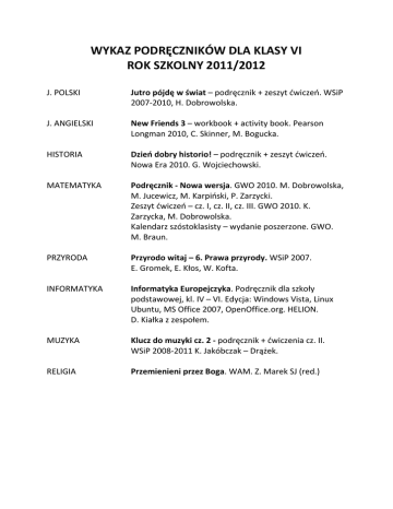 WYKAZ PODRĘCZNIKÓW DLA KLASY VI ROK SZKOLNY 2011/2012 J. POLSKI Jutro pójdę w świat – podręcznik + zeszyt dwiczeo. WSiP 2007-2010, H. Dobrowolska. J. ANGIELSKI New Friends 3 – workbook + activity book. Pearson Longman 2010, C. Skinner, M. Bogucka. HISTORIA Dzieo dobry historio! – podręcznik + zeszyt dwiczeo. Nowa Era 2010. G. Wojciechowski. MATEMATYKA Podręcznik - Nowa wersja. GWO 2010. M. Dobrowolska, M. Jucewicz, M. Karpioski, P. Zarzycki. Zeszyt dwiczeo – cz. I, cz. II, cz. III. GWO 2010. K. Zarzycka, M. Dobrowolska. Kalendarz szóstoklasisty – wydanie poszerzone. GWO. M. Braun. PRZYRODA Przyrodo witaj – 6. Prawa przyrody. WSiP 2007. E. Gromek, E. Kłos, W. Kofta. INFORMATYKA Informatyka Europejczyka. Podręcznik dla szkoły podstawowej, kl. IV – VI. Edycja: Windows Vista, Linux Ubuntu, MS Office 2007, OpenOffice.org. HELION. D. Kiałka z zespołem. MUZYKA Klucz do muzyki cz. 2 - podręcznik + dwiczenia cz. II. WSiP 2008-2011 K. Jakóbczak – Drążek. RELIGIA Przemienieni przez Boga. WAM. Z. Marek SJ (red.) WYKAZ PODRĘCZNIKÓW DLA KLASY V ROK SZKOLNY 2011/2012 J. POLSKI Jutro pójdę w świat – podręcznik + zeszyt dwiczeo. WSiP 2007-2009, H. Dobrowolska. J. ANGIELSKI New Friends 2 – workbook + activity book. Pearson Longman 2010, C. Skinner, M. Bogucka. HISTORIA Dzieo dobry historio! – podręcznik + zeszyt dwiczeo. Nowa Era 2009-2010. G. Wojciechowski. MATEMATYKA Podręcznik - Nowa wersja. GWO. M. Dobrowolska, M. Jucewicz, M. Karpioski, P. Karpioski. Zeszyt dwiczeo – cz. I, cz. II, cz. III. GWO. Z. Bolatek, M. Dobrowolska, S. Wojtan. PRZYRODA Przyrodo witaj – 5. Polska i jej mieszkaocy. WSiP 2006. E. Gromek, E. Kłos, W. Kofta. INFORMATYKA Informatyka Europejczyka. Podręcznik dla szkoły podstawowej, kl. IV – VI. Edycja: Windows Vista, Linux Ubuntu, MS Office 2007, OpenOffice.org. HELION. D. Kiałka z zespołem. PLASTYKA Plastyka IV – VI - Podręcznik + zeszyt dwiczeo nr 2. WSiP 2008-2011. S. Stopczyk. TECHNIKA Technika – częśd techniczna. OPERON. RELIGIA Obdarowani przez Boga. WAM. Z. Marek SJ (red.) WYKAZ PODRĘCZNIKÓW DLA KLASY IV ROK SZKOLNY 2011/2012 J. POLSKI Jutro pójdę w świat – podręcznik + zeszyt dwiczeo. WSiP 2007-2009, H. Dobrowolska. J. ANGIELSKI New Friends 1 – workbook + activity book. Pearson Longman 2010, C. Skinner, L. Kilbey. HISTORIA Dzieo dobry historio! – podręcznik + zeszyt dwiczeo. Nowa Era 2009. B. Szeweluk-Wyrwa, W. Surdyk-Fertsch. MATEMATYKA Podręcznik. GWO. M. Dobrowolska, M. Jucewicz, P. Zarzycki. Zeszyt dwiczeo – cz. I, cz. II, cz. III. GWO. P. Zarzycki, S. Wojtan. PRZYRODA Przyrodo witaj – 4. W domu i okolicy. WSiP 2006. E. Gromek, E. Kłos, W. Kofta. INFORMATYKA Informatyka Europejczyka. Podręcznik dla szkoły podstawowej, kl. IV – VI. Edycja: Windows Vista, Linux Ubuntu, MS Office 2007, OpenOffice.org. HELION. D. Kiałka z zespołem. PLASTYKA Plastyka IV – VI - Podręcznik + zeszyt dwiczeo nr 1. WSiP 2008-2011. S. Stopczyk. TECHNIKA Technika – częśd komunikacyjna. OPERON. MUZYKA Klucz do muzyki cz. 1 - podręcznik + dwiczenia cz. I. WSiP 2008-2011. K. Jakóbczak – Drążek, U. Smoczyoska. RELIGIA Zaproszeni przez Boga. WAM. Z. Marek SJ (red.) WYKAZ PODRĘCZNIKÓW DLA KLASY III ROK SZKOLNY 2011/2012 Odkrywam siebie i świat. Ja i moja szkoła MAC EDUKACJA. Grażyna Lach, Jolanta Faliszewska J. ANGIELSKI New Bingo 3A i 3B. PWN 2010 A. Wieczorek RELIGIA Jezusowa wspólnota serc. WAM. W. Kubik SJ (red.), T. Czarnecka (red.) WYKAZ PODRĘCZNIKÓW DLA KLASY II ROK SZKOLNY 2011/2012 Wesoła szkoła i przyjaciele Podręcznik, karty pracy, matematyczne karty pracy, zeszyty „Ćwiczę poprawne pisanie”, zeszyty „Ćwiczę poprawne liczenie”. WSIP 2011 H. Dobrowolska, A. Konieczna J. ANGIELSKI New Bingo Plus 2A i 2B Plus + zeszyt dwiczeo. PWN 2010 A. Wieczorek RELIGIA Bliscy sercu Jezusa – nowe wydanie. WAM. W. Kubik SJ (red.), T. Czarnecka (red.), G. Łuszczak SJ (red.), A. Duka. WYKAZ PODRĘCZNIKÓW DLA KLASY I ROK SZKOLNY 2011/2012 Odkrywam siebie. Ja i moja szkoła. Mac Edukacja Grażyna Lach, Jolanta Faliszewska J. ANGIELSKI New Bingo 1A i 1B Plus +zeszyt dwiczeo z elementami pisania. PWN 2010 A. Wieczorek RELIGIA W domu i rodzinie Jezusa + zeszyt dwiczeo. WAM. W. Kubik SJ (red.), T. Czarnecka (red.)
