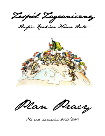 Zespół Zagraniczny Hufiec Kraków Nowa Huta Plan Pracy Na rok harcerski 2013/2014 1. Charakterystyka środowiska Hufiec Kraków Nowa Huta wchodzi w skład ZHP Chorągwi Krakowskiej, początki jego działalności datuje się na 1957r. Zespół Zagraniczny jest najmłodszym zespołem w Hufcu, powstał w 2012r. Jedakże mimo tak krótkiego okresu działalności zagranica prężnie rozwija się w naszym środowisku. W roku poprzednim braliśmy udział w : Seminarium polsko-niemieckim Kursie Namiestników Zagranicznych PAXTU InterCamp’ie w Holandii Narodowym Jamboree w Gruzji Projekcie Seven Summits Narodowym Jamboree w Azerbejdżanie MOOT w Kanadzie. Zagranica stała się niesamowitym motywatorem dla instruktorów, drużynowych czy przybocznych. Coraz chętniej biorą udział w wyjazdach zagranicznych, spotkaniach ze skautami, organizują zbiórki o tematyce WOSM’u i WAGGGS’u. Pod koniec ubiegłego roku harcerskiego skład Zespołu uległ zmianie. Szefem została pwd. Patrycja Postrach HO, członkami : sam. Izabela Suder, ćw. Grzegorz Łabuz oraz pwd. Iga Gadubała HO (od listopada 2013). 2. Skład Zespołu Szef Zespołu - pwd. Patrycja Postrach HO E-mail : [email protected] Telefon : 506 482 707 Członek Pwd. Iga Gadubała HO E-mail : [email protected] Telefon : 504 676 293 Członek Sam. Izabela Suder E-mail : [email protected] Telefon : 515 153 535 Członek Ćw. Grzegorz Łabuz E-mail : [email protected] Telefon : 508 770 810 3. Cele i założenia I. Wzrost świadomości członków hufca o przynależności do organizacji światowych. Prowadzenie zajęć związanych z zagranicą na kursie przybocznych Zwrócenie uwagi drużynowych na system zdobywania stopni i sprawności w kontekście świadomości przynależności do skautingu Dążenie do wprowadzenia elementów związanych z zagranicą do planów pracy drużyn i gromad Stworzenie i opracowanie książeczki z materiałami zagranicznymi dla drużynowych i przybocznych II. Wsparcie programowe poprzez organizację przedsięwzięć o charakterze zagranicznym. Organizacja Nocy Filmowej Organizacja wyjazdu zagranicznego III. Nawiązanie kontaktów ze skautami z całego świata. Udział w takich imprezach jak: Seminarium Polsko-Niemieckie Rejs Betlejemskiego Światełka Pokoju JOTI, JOTA i JOTT DMB InterCamp IV. Zebranie pełnego patrolu na Jamboree 2015 w Japonii. Organizacja akcji zarobkowych, wyjazdów i spotkań integracyjnych Współpraca ze sponsorami Organizacja lekcji j. angielskiego 4. Harmonogram Termin Przedsięwzięcie Opis Adresaci Osoba odpowiedzialna 6-8.09.2013 Podsumowanie wakacyjnych działań skautowych Zajęcia na Inauguracji Hufca dotyczące podsumowania wakacyjnych działań skautowych – National Jamboree w Gruzji, Jamboree w Azerbejdżanie, projekt Seven Summits, MOOT w Kanadzie Instruktorzy, drużynowi i przyboczni Patrycja Postrach, Grzegorz Łabuz, Izabela Suder 29.09.2013 Ambasadorzy Jamboree 2023 Spotkanie dotyczące projektu Ambasadorzy 2023 oraz Jamboree 2015 Instruktorzy, drużynowi i przyboczni Grzegorz Łabuz, Izabela Suder 04.10.2013 Spotkanie Zespołu Zagranicznego Promocja działań Zespołu na nadchodzący rok harcerski Instruktorzy, drużynowi i przyboczni, członkowie drużyn wędrowniczych Patrycja Postrach 19/20.10.2013 JOTI, JOTA Promocja wydarzeń Wszyscy członkowie Hufca Listopad 2013 Kurs przybocznych ”Na Słońce” Promocja skautingu, organizacji skautowych, InterCampu 2014 oraz Jamboree 2015 Uczestnicy kursu Patrycja Postrach, Grzegorz Łabuz, Izabela Suder Patrycja Postrach, Iga Gadubała Listopad/ Grudzień Noc filmowa Integracyjna noc filmowa hufcu; filmy związane ze skautingiem na świecie Instruktorzy, drużynowi i przyboczni, członkowie drużyn wędrowniczych Patrycja Postrach, Grzegorz Łabuz, Izabela Suder 15.12.2013 Przekazanie Betlejemskiego Światełka Pokoju Promocja raz udział w wydarzeniu Wszyscy członkowie Hufca Iga Gadubała 17-20.12.2013 Rejs Betlejemskiego Światełka Pokoju Promocja wydarzeń Instruktorzy, drużynowi i przyboczni, członkowie drużyn wędrowniczych Iga Gadubała Dzień Myśli Braterskiej Promocja działań mających na celu nawiązanie kontaktu ze skautami oraz wspólne świętowanie DMB Wszyscy członkowie Hufca Iga Gadubała Wyjazd zagraniczny Wyjazd zagraniczny dla wędrowników mający na celu promocję skautingu oraz integrację potencjalnych zainteresowanych zagranicą Wędrownicy Patrycja Postrach, Grzegorz Łabuz, Izabela Suder, Iga Gadubała 22.02.2014 Wiosna 2014 21-27.04.2014 Seminarium Polsko-Niemieckie Nawiązanie kontaktu ze skautami z Niemiec 10.05.2014 JOTT Promocja wydarzeń 6-9.06.2014 InterCamp Wsparcie patroli jadących na imprezę - zakup dla każdego jednakowych koszulek pokazujących skąd jesteśmy Instruktorzy, drużynowi i przyboczni, członkowie drużyn wędrowniczych Wszyscy członkowie Hufca Instruktorzy, drużynowi i przyboczni, członkowie drużyn wędrowniczych Patrycja Postrach Grzegorz Łabuz Patrycja Postrach Wrzesień 2013 – Czerwiec 2014 Jamboree 2015 (zebranie z rodzicami, wyjazd integracyjny, akcje zarobkowe, zajęcia j. angielskiego) Aktualizacja tablicy w Hufcu Wrzesień 2013 – Czerwiec 2014 Aktualizacja funpage’u na portalu Facebook Bieżące informacje skautowe Wszyscy członkowie Hufca Patrycja Postrach, Grzegorz Łabuz, Izabela Suder Iga Gadubała Wrzesień 2013 – Czerwiec 2014 Materiały dla drużynowych i przybocznych Materiały, dzięki którym w łatwy i przystępny sposób można na zbiórkach czy wyjazdach poznawać skauting Instruktorzy, drużynowi i przyboczni Patrycja Postrach Wrzesień 2013 – Czerwiec 2014 Koszulki ZZ Koszulki promujące Zespół Zagraniczny dostępne tylko dla wybranych osób Członkowie Zespołu, osoby zasłużone Patrycja Postrach Wrzesień 2013 – Czerwiec 2014 Wsparcie patrolu jadącego na Jamboree Reprezentacja Hufca na Jamboree 2015 Patrycja Postrach, Grzegorz Łabuz, Izabela Suder Bieżące informacje skautowe Wszyscy członkowie Hufca Izabela Suder