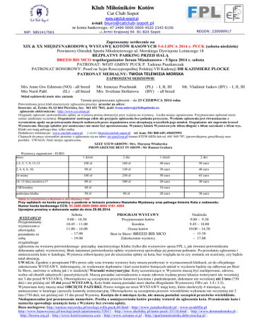 Klub Miłośników Kotów Cat Club Sopot www.catclub-sopot.pl e-mail: [email protected] nr konta bankowego: 47 2490 0005 0000 4520 2343 8156 ul. Armii Krajowej 94 81-824 Sopot NIP: 5851417501 REGON: 220089917 Zapraszamy serdecznie na XIX & XX MIĘDZYNARODOWĄ WYSTAWĘ KOTÓW RASOWYCH 5-6 LIPCA 2014 r. PUCK (sobota-niedziela) Powiatowy Ośrodek Sportu Młodzieżowego ul. Morskiego Dywizjonu Lotniczego 18 BEZPŁATNY PARKING PRZED HALĄ BREED BIS MCO współorganizator forum Miaukunowo - 5 lipca 2014 r. sobota PATRONAT: WÓJT GMINY PUCK P. Tadeusz Puszkarczuk PATRONAT HONOROWY: Poseł na Sejm Rzeczypospolitej Polskiej VII Kadencji DR KAZIMIERZ PLOCKE PATRONAT MEDIALNY: TWOJA TELEWIZJA MORSKA ZAPROSZENI SĘDZIOWIE Mrs Anne Gro Edstrom (NO) - all breed Mrs Nurit Pahl (IL) - all breed Mr. Ireneusz Pruchniak Mrs Svetlana Stoliarova (PL) - I, II, III (BY) - all breed Mr. Vladimir Isakov (BY) - I, II, III Skład sędziowski może ulec zmianie Termin przyjmowania zgłoszeń – do 23 CZERWCA 2014 roku Potwierdzone przez klub macierzysty zgłoszenia prosimy przesłać na adres: listownie: ul. Żytnia 10, 62-064 Plewiska, fax: 061 651 7041, mail: [email protected] zgłoszenie elektroniczne: http://www.ccs.miau.pl Oryginały zgłoszeń i potwierdzenie opłaty za wystawę proszę dostarczyć przy wejściu na wystawę. Liczba miejsc ograniczona. Przyjmowanie zgłoszeń może zostać zamknięte wcześniej. Organizator zastrzega sobie nie przyjęcie zgłoszenia bez podania przyczyny. Wysłanie zgłoszenia jest równoznaczne z wyrażeniem zgody na przetwarzanie danych osobowych przez organizatora oraz akceptacją wszystkich jego ustaleń. Organizator nie zapewnia krzeseł Wystawcom. Decyzja sędziów jest ostateczna i nie może być oprotestowana. Wymiary klatek Wystawowych: 60cm długość x 60cm szerokość x 65cm wys. Klatki nie mają pełnego dna, tylko siatkę. Dodatkowe informacje: www.catclub-sopot.pl e-mail: [email protected] tel. kom. 501 088 649; 696035991 Chętnych do pracy stewardów prosimy o zgłaszanie się na adres [email protected] (temat-STEWARD) lub tel. 601 949 707, (przewidujemy gratyfikację oraz posiłek). UWAGA: Ilość miejsc ograniczona. SZEF STEWARDÓW: Mrs. Marzena Włodarska PROWADZENIE BEST IN SHOW: Mr Roman Grabara Wystawcy zagraniczni - EURO klasy: 1 dzień 2 dni 1 dzień 2 dni 1,3, 5, 7, 9, 11,12 100 zł 160 zł 40 euro 50 euro 2, 4, 6, 8, 10, 90 zł 130 zł 30 euro 40 euro 16 mioty 180 zł 250 zł 50 euro 65 euro 14, 15 (bez miotów),17 80 zł 100 zł 20 euro 30 euro 13B korekty 40 zł podwójna klatka 50 zł 10 euro 80 zł 20 euro 30 euro Opłaty za uczestnictwo w Wystawie w dniu Wystawy +10zł Przy wpłatach na konto prosimy o podanie w temacie przelewu Nazwiska Wystawcy oraz pełnego Imienia Kota z rodowodu. Numer konta bankowego CCS: 53 2490 0005 0000 4600 3161 4294 Uprzejme prosimy o dokonanie wpłat do dnia 29.06.2014. Sobota Niedziela PROGRAM WYSTAWY WYSTAWCO 9.00 ~ 10.30 Przyjmowanie kotów 9.00 ~ 9.30 Przypominamy 10.45 ~ 11.00 Korekta 9.45 ~ 10.00 wystawcom o 11.00 ~ 16.00 Ocena kotów 10.00 ~ 14.30 obowiązku ~ 17.00 ~ 15.30 Best in Show/ BREED BIS MCO posiadania ze sobą ~ 19.00 Zakończenie wystawy ~ 17.00 oryginalnego zgłoszenia na wystawę potwierdzonego pieczątką macierzystego Klubu (tylko dla wystawców spoza FPL ), jak również potwierdzenia dokonania opłaty wystawowej. Brak natomiast potwierdzenia opłaty wystawowej spowoduje jej ponowne pobranie. Po przesłaniu zgłoszenia i umieszczeniu kota w katalogu, Wystawca zobowiązany jest do uiszczenia opłaty za kota, bez względu na to czy zostanie on oceniony, czy będzie miał absencję. UWAGA: Zgodnie z przepisami FIFe przez cały czas trwania wystawy koty muszę przebywać w wyznaczonych klatkach, aż do oficjalnego zakończenia WYSTAWY. Informujemy, że wydawanie dyplomów i kart ocen kotów biorących udział w wystawie będzie się odbywać po Best In Show, zarówno w sobotę jak i w niedzielę! Warunki weterynaryjne: Koty uczestniczące w Wystawie muszą być zachipowane, zdrowe, wolne od chorób zakaźnych i pasożytniczych. Muszą posiadać zaświadczenie o stanie zdrowia wydane przez lekarza weterynarii nie wcześniej niż 3 dni przed WYSTAWĄ. Obowiązkowe są szczepienia przeciw katarowi kociemu i panleukopenii, dokonane nie wcześniej niż 2 lata (730 dni) i nie później niż 15 dni przed WYSTAWĄ. Koty białe muszą posiadać atest słuchu (Regulamin Wystawowy FIFe art. 3.4 i 3.5). Wystawiane koty muszę mieć OBCIĘTE PAZURKI. Prawo wstępu na teren WYSTAWY maję koty, które ukończyły 4 miesiące, są umieszczone w katalogu i przeszły kontrolę weterynaryjną. Obowiązkowe są szczepienia przeciw wściekliźnie wykonane nie wcześniej niż 2 lata (730 dni), nie później niż 15 dni przed Wystawą. Kocięta do 6 miesiąca życia, nie muszą posiadać szczepień przeciwko wściekliźnie. Niedopuszczalne jest przenoszenie numerków. Prośbę o umiejscowieniu kotów prosimy wstawić do zgłoszenia kota. Przeniesienie kota i numerka spowoduje usunięcie kota z Wystawy bez zwrotu opłaty. Baza noclegowa: http://meteor-turystyka.pl/noclegi,wille,puck,60.html ; http://www.zameksobieski.pl ; www.ossdelfin.pl http://www.fajnewczasy.pl/noclegi/puck/apartamenty/52611 ; http://www.eholiday.pl/tanio-puck-35118.html ; http://www.domnadzatoka.pl ; http://brown.org.pl ; http://www.hotelwieniawa.com ; http://www.octopus.si.pl ; http://apartamentzatoka.dobrynocleg.pl ;