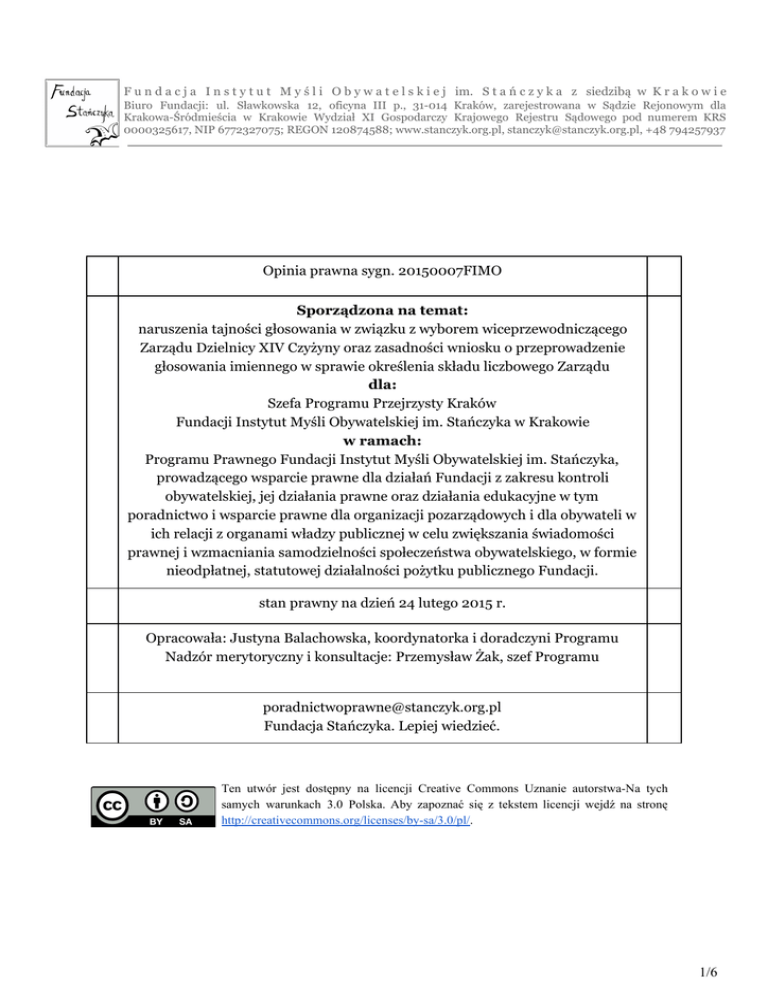F u n d a c j a I n s t y t u t M y ś l i O b y w a t e l s k i e j im. S t a ń c z y k a z siedzibą w K r a k o w i e Biuro Fundacji: ul. Sławkowska 12, oficyna III p., 31-014 Kraków, zarejestrowana w Sądzie Rejonowym dla Krakowa-Śródmieścia w Krakowie Wydział XI Gospodarczy Krajowego Rejestru Sądowego pod numerem KRS 0000325617, NIP 6772327075; REGON 120874588; www.stanczyk.org.pl, [email protected], +48 794257937 Opinia prawna sygn. 20150007FIMO Sporządzona na temat: naruszenia tajności głosowania w związku z wyborem wiceprzewodniczącego Zarządu Dzielnicy XIV Czyżyny oraz zasadności wniosku o przeprowadzenie głosowania imiennego w sprawie określenia składu liczbowego Zarządu dla: Szefa Programu Przejrzysty Kraków Fundacji Instytut Myśli Obywatelskiej im. Stańczyka w Krakowie w ramach: Programu Prawnego Fundacji Instytut Myśli Obywatelskiej im. Stańczyka, prowadzącego wsparcie prawne dla działań Fundacji z zakresu kontroli obywatelskiej, jej działania prawne oraz działania edukacyjne w tym poradnictwo i wsparcie prawne dla organizacji pozarządowych i dla obywateli w ich relacji z organami władzy publicznej w celu zwiększania świadomości prawnej i wzmacniania samodzielności społeczeństwa obywatelskiego, w formie nieodpłatnej, statutowej działalności pożytku publicznego Fundacji. stan prawny na dzień 24 lutego 2015 r. Opracowała: Justyna Balachowska, koordynatorka i doradczyni Programu Nadzór merytoryczny i konsultacje: Przemysław Żak, szef Programu [email protected] Fundacja Stańczyka. Lepiej wiedzieć. Ten utwór jest dostępny na licencji Creative Commons Uznanie autorstwaNa tych samych warunkach 3.0 Polska. Aby zapoznać się z tekstem licencji wejdź na stronę http://creativecommons.org/licenses/bysa/3.0/pl/ . 1/6 Opiniowany problem Przedmiotem niniejszej opinii jest odpowiedź na przedstawione przez Annę Cioch w imieniu Szefa Programu Przejrzysty Kraków dwa pytania: I. II. czy radni Rady Dzielnicy XIV Czyżyny naruszyli tajność głosowania w sprawie wyboru Zastępcy Przewodniczącego Rady, poprzez zachowanie polegające na zaznaczaniu odpowiedzi na karcie do głosowania przy pomocy kolorowych długopisów, co miało na celu ujawnienie sposobu ich głosowania, jednocześnie umożliwiając identyfikację treści stanowiska wyrażonego przez pozostałych głosujących? czy ustalenie liczbowego składu Zarządu Dzielnicy może zostać zakwalifkowane jako sprawa merytoryczna w rozumieniu §33 ust. 3 Statutu Dzielnicy XIV Czyżyny i stanowić przedmiot wniosku o przeprowadzenie w tej sprawie głosowania imiennego? Streszczenie stanowiska opinii I. II. Radni Dzielnicy naruszyli tajność głosowania w związku z wyborem Zastępcy Przewodniczącego Rady Dzielnicy umożliwiając identyfikację treści stanowisk poszczególnych głosujących (zob. pkt. 18 uzasadnienia). Naruszenie tajności głosowania stanowi istotne naruszenie prawa i może być podstawą do stwierdzenia nieważności uchwały w całości lub części i nie może być przedmiotem oceny prawnokarnej w tym przypadku (zob. pkt. 912 uzasadnienia). Poprawnie złożony wniosek o przeprowadzenie głosowania imiennego w sprawie ustalenia składu liczbowego Zarządu Dzielnicy powinien zostać uwzględniony (zob. pkt. 1316 uzasadnienia). Stan faktyczny 1. Dnia 10 lutego 2015 roku podczas sesji Rady Dzielnicy XIV Czyżyny, zwołanej w trybie nadzwyczajnym, poddano pod obrady projekt uchwały w sprawie powołania trzyosobowego Zarządu Dzielnicy. Marek Ziemiański, Przewodniczący Rady, zgłosił poprawkę zmieniającą liczbę członków Zarządu z trzech do pięciu osób, podnosząc, że zwiększony skład Zarządu przyczyni się do lepszego wykonywania jego funkcji i zadań. 2. Złożono wniosek, aby głosowanie w przedmiocie ustalenia składu liczbowego Zarządu miało charakter imienny. Część radnych, sprzeciwiła się takiej formie głosowania, powołując się na Statut Dzielnicy XIV i wskazując, że głosowanie imienne może mieć miejsce tylko w sprawach merytorycznych. Radni odrzucili poprawkę w głosowaniu jawnym, głosami 11 radnych. 3. Następnie Rada Dzielnicy przystąpiła do głosowania tajnego w sprawie wyboru Zastępcy Przewodniczącego. Marek Ziemiański zarekomendował na to stanowisko Jerzego Woźniakiewicza, którego kandydatura została odrzucona także 11 głosami. 2/6 4. W czasie głosowania, radni popierający utworzenie pięcioosobowego Zarządu, używali kolorowych długopisów w celu ujawnienia swojego stanowiska w przedmiocie wyboru Zastępcy Przewodniczącego. Uzasadnienie I . Naruszenie tajności głosowania w związku z wyborem Zastępcy Przewodniczącego Rady Dzielnicy 1. Zgodnie z § 51 ust. 9 uchwały Rady Miasta Krakowa nr XCIX/1508/14 z dnia 12 marca 2014 r. w sprawie organizacji i zakresu działania Dzielnicy XIV Czyżyny w Krakowie (zawanej dalej Statutem), Rada wybiera Zastępcę Przewodniczącego oraz pozostałych członków Zarządu na wniosek Przewodniczącego, zwykłą większością głosów, w obecności co najmniej połowy składu Rady, w głosowaniu tajnym. Inicjatywa uchwałodawcza w powyższym zakresie jest wyłączną kompetencją Przewodniczącego, co wyklucza możliwość wnoszenia poprawek w trakcie procedowania uchwał. Cytowany przepis prawny ustanawia zasady wyboru Zastępcy Przewodniczącego Rady Dzielnicy, wskazując na wymagane quorum, większość głosów oraz sposób głosowania, będący wyjątkiem od ogólnej zasady jawności podejmowania uchwał, wyrażonej w §33 ust. 1 Statutu.1 2. W polskim systemie prawnym nie istnieje definicja legalna głosowania tajnego. Naczelny Sąd Administracyjny w wyroku z 9 marca 1999 r. podkreśla, że w ustawie o samorządzie terytorialnym i powiązanych z nią aktach prawnych nie ma definicji tajnego głosowania i dlatego należy przyjmować jego potoczne znaczenie ze słownikami języka polskiego jako głosowanie przeprowadzone w sposób nie pozwalający ustalić, jak kto gł