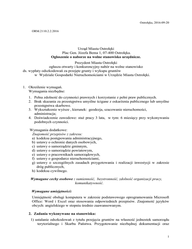 Ostrołęka, 2016-09-20 ORM.2110.2.2.2016 Urząd Miasta Ostrołęki Plac Gen. Józefa Bema 1, 07-400 Ostrołęka. Ogłoszenie o naborze na wolne stanowisko urzędnicze. Prezydent Miasta Ostrołęki ogłasza otwarty i konkurencyjny nabór na wolne stanowisko ds. wypłaty odszkodowań za przejęte grunty i wykupu gruntów w Wydziale Gospodarki Nieruchomościami w Urzędzie Miasta Ostrołęki. 1. Określenie wymagań. Wymagania niezbędne: 1. Pełna zdolność do czynności prawnych i korzystanie z pełni praw publicznych. 2. Brak skazania za przestępstwa umyślne ścigane z oskarŜenia publicznego lub umyślne przestępstwa skarbowe. 3. Wykształcenie wyŜsze , kierunek: geodezja, szacowanie nieruchomości, administracja; 4. Doświadczenie zawodowe: staŜ pracy 3 lata, w tym: 6 miesięcy przy wykonywaniu podobnych czynności. Wymagania dodatkowe: Znajomość przepisów z zakresu: a) kodeksu postępowania administracyjnego, b) ustawy o ochronie danych osobowych, c) ustawy o samorządzie gminnym, d) ustawy o samorządzie powiatowym, e) ustawy o pracownikach samorządowych, f) ustawy o gospodarce nieruchomościami, g) ustawy o szczególnych zasadach przygotowania i realizacji inwestycji w zakresie dróg publicznych, h) kodeksu cywilnego. Wymagane cechy osobowe : sumienność, bezstronność, zdolność organizacji pracy, komunikatywność. Wymagane umiejętności: Umiejętność obsługi komputera w zakresie podstawowego oprogramowania Microsoft Office: Word i Excel oraz stosowania odpowiednich przepisów. Znajomość języków obcych: angielskiego w stopniu średnio zaawansowanym. 2. Zadania wykonywane na stanowisku: 1) ustalanie odszkodowań z tytułu przejęcia gruntów na własność jednostek samorządu terytorialnego i Skarbu Państwa. Przygotowanie niezbędnej dokumentacji oraz 1 sporządzanie decyzji administracyjnych; 2) nabywanie gruntów na cele publiczne jednostek samorządu terytorialnego i Skarbu Państwa. Przeprowadzanie negocjacji oraz opracowywanie projektów zarządzeń Prezydenta Miasta w sprawach wykupu nieruchomości na rzecz Miasta Ostrołęki lub Skarbu Państwa. Przygotowanie stosownej dokumentacji do celów notarialnych; 3)przeprowadzanie rozpraw administracyjnych w sprawie wypłaty odszkodowań za grunty, które z mocy prawa w myśl specustawy stały się własnością Skarbu Państwa lub odpowiednich jednostek samorządu terytorialnego, 4) wnioskowanie o wpisy do ksiąg wieczystych oraz o wykreślanie z ksiąg wieczystych obciąŜeń i hipotek; 5) ustanawianie słuŜebności gruntowej i drogowej; 6) regulacja stanu prawnego nieruchomości. 7) zlecanie i odbiór robót z zakresu prac geodezyjno- szacunkowych, dotyczących gruntów stanowiących własność miasta; 8) realizacja uchwał Rady Miasta i zarządzeń Prezydenta Miasta Ostrołęki; 9) archiwizacja dokumentów; 10) współpraca z Wydziałami Geodezji i Kartografii, Inwestycji Miejskich i Finansów, BudŜetu, Podatków i Opłat; 11) sprawozdawczość z ww. zakresu; 12)opracowywanie propozycji dla budŜetu miasta z prowadzonego zakresu spraw. 3. Informacja o warunkach pracy: 1) praca będzie wykonywana w budynku Urzędu Miasta Ostrołęki, Plac Gen J. Bema 1 w Ostrołęce (budynek nie wyposaŜony w windę) 2) bezpieczne warunki pracy, 3) charakter stanowiska pracy: duŜa samodzielność, częsty kontakt z interesantami, stanowisko związane z pracą przy komputerze. 4. Informacja o wskaźniku zatrudnienia osób niepełnosprawnych: W miesiącu sierpniu 2016r. wskaźnik zatrudnienia osób niepełnosprawnych był wyŜszy niŜ 6%. 5. Wskazanie wymaganych dokumentów w ofercie pracy: 1. CV, list motywacyjny . 2. Kopie dokumentów potwierdzających wymagane wykształcenie. 3. Kwestionariusz osobowy dla osoby ubiegającej się o zatrudnienie. 4. Kopie świadectw pracy lub innych dokumentów potwierdzających ogólny staŜ pracy oraz półroczne doświadczenie zawodowe przy wykonywaniu podobnych czynności. W przypadku pozostawania w stosunku pracy - zaświadczenie (inne dokumenty) potwierdzające wymagany staŜ pracy oraz półroczne doświadczenie zawodowe przy wykonywaniu podobnych czynności. 5. Oświadczenie o posiadaniu pełnej zdolności do czynności prawnych, korzystaniu z pełni praw publicznych oraz braku prawomocnego skazania za przestępstwa umyślne ścigane z oskarŜenia publicznego lub umyślne przestępstwo skarbowe. 6. WyraŜenie zgody na przetwarzanie danych osobowych dla celów rekrutacji. 7. Wykaz załączonych dokumentów. Dokumenty naleŜy złoŜyć w zamkniętej kopercie, na której naleŜy umieścić dane osoby składającej ofertę jak imię, nazwisko i adres zamieszkania wraz z podaniem nazwy stanowiska pracy, na które prowadzony jest nabór. 2 6. Inne informacje: Zakwalifikowani kandydaci zostaną poinformowani telefonicznie o terminie rozmowy kwalifikacyjnej. Zastrzegamy sobie prawo w celu sprawdzenia kompetencji pracownika, moŜliwość zawarcia umowy na czas określony. Zatrudniona osoba, o której mowa w art. 16 ust. 3 ustawy o pracownikach samorządowych, podejmująca pracę na stanowisku urzędniczym po raz pierwszy, moŜe być skierowana do odbycia słuŜby przygotowawczej, która kończy się egzaminem. 7. Określenie terminu i miejsca składania dokumentów. Osoby zainteresowane zatrudnieniem, są proszone o składanie kompletu wymaganych dokumentów wskazanych w pkt. 5 ogłoszenia do dnia 30 września 2016r. w Punkcie Obsługi Interesantów Urzędu Miasta w Ostrołęce, znajdującego się w Ostrołęce, przy Pl. Gen. Bema 1 lub przesłanie ich na adres urzędu drogą pocztową. Prezydent Miasta Janusz Kotowski Procedura naboru odbędzie się zgodnie z ustawą z dnia 21 listopada 2008r. o pracownikach samorządowych. 3