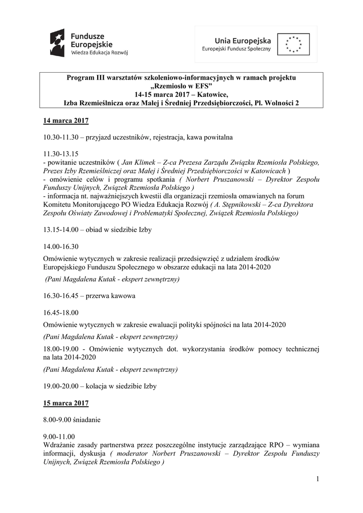 Program III warsztatów szkoleniowo-informacyjnych w ramach projektu „Rzemiosło w EFS” 14-15 marca 2017 – Katowice, Izba Rzemieślnicza oraz Małej i Średniej Przedsiębiorczości, Pl. Wolności 2 14 marca 2017 10.30-11.30 – przyjazd uczestników, rejestracja, kawa powitalna 11.30-13.15 - powitanie uczestników ( Jan Klimek – Z-ca Prezesa Zarządu Związku Rzemiosła Polskiego, Prezes Izby Rzemieślniczej oraz Małej i Średniej Przedsiębiorczości w Katowicach ) - omówienie celów i programu spotkania ( Norbert Pruszanowski – Dyrektor Zespołu Funduszy Unijnych, Związek Rzemiosła Polskiego ) - informacja nt. najważniejszych kwestii dla organizacji rzemiosła omawianych na forum Komitetu Monitorującego PO Wiedza Edukacja Rozwój ( A. Stępnikowski – Z-ca Dyrektora Zespołu Oświaty Zawodowej i Problematyki Społecznej, Związek Rzemiosła Polskiego) 13.15-14.00 – obiad w siedzibie Izby 14.00-16.30 Omówienie wytycznych w zakresie realizacji przedsięwzięć z udziałem środków Europejskiego Funduszu Społecznego w obszarze edukacji na lata 2014-2020 (Pani Magdalena Kutak - ekspert zewnętrzny) 16.30-16.45 – przerwa kawowa 16.45-18.00 Omówienie wytycznych w zakresie ewaluacji polityki spójności na lata 2014-2020 (Pani Magdalena Kutak - ekspert zewnętrzny) 18.00-19.00 - Omówienie wytycznych dot. wykorzystania środków pomocy technicznej na lata 2014-2020 (Pani Magdalena Kutak - ekspert zewnętrzny) 19.00-20.00 – kolacja w siedzibie Izby 15 marca 2017 8.00-9.00 śniadanie 9.00-11.00 Wdrażanie zasady partnerstwa przez poszczególne instytucje zarządzające RPO – wymiana informacji, dyskusja ( moderator Norbert Pruszanowski – Dyrektor Zespołu Funduszy Unijnych, Związek Rzemiosła Polskiego ) 1 ) 11.00-12.00 Omówienie i zatwierdzenie ostatecznej wersji rekomendacji dla instytucji zarządzających RPO ( Norbert Pruszanowski – Dyrektor Zespołu Funduszy Unijnych, Związek Rzemiosła Polskiego ) 12.00-12.15 – przerwa kawowa 12.15-14.15 Omówienie założeń systemu zarządzania relacjami pomiędzy ZRP, izbami rzemieślniczymi reprezentowanymi w komitetach monitorujących a izbami nie reprezentowanymi w tych gremiach w obszarze wdrażania Europejskiego Funduszu Społecznego, dyskusja ( Norbert Pruszanowski – Dyrektor Zespołu Funduszy Unijnych, Związek Rzemiosła Polskiego ) 14.15 - podsumowanie spotkania 14.30-15.15 - obiad 2