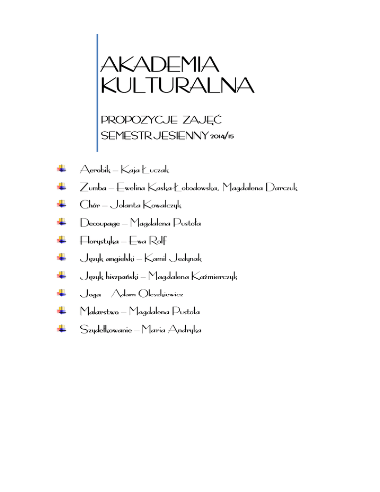 AKADEMIA KULTURALNA PROPOZYCJE ZAJĘĆ SEMESTR JESIENNY 2014/15 Aerobik – Kaja Łuczak Zumba – Ewelina Kaska-Łobodowska, Magdalena Darczuk Chór – Jolanta Kowalczyk Decoupage – Magdalena Pustoła Florystyka – Ewa Rolf Język angielski – Kamil Jedynak Język hiszpański – Magdalena Kaźmierczyk Joga – Adam Oleszkiewicz Malarstwo – Magdalena Pustoła Szydełkowanie – Maria Andryka AEROBIK: Zajęcia mające na celu poprawienie kondycji ruchowej i nabranie młodzieńczego wigoru. Popracowanie nad wspaniałą sylwetką oraz poprawienie ogólnego samopoczucia. „W zdrowym ciele zdrowy duch". Nasze ciało jest naszym domem, więc postarajmy się, aby zawsze chętnie dla nas pracowało. Zapraszam do wspólnej zabawy. Kaja Łuczak ZUMBA: - to zainspirowana latynoskimi rytmami fuzja tańca i aerobiku. Zumba jest bardzo innowacyjnym systemem fitness, który poprzez świetną zabawę kształtuje naszą sylwetkę, dba o naszą kondycję, a przede wszystkim napawa nas optymizmem i wprawia w świetne samopoczucie, które zostaje na długo, długo po zajęciach. Proste kroki taneczne, świetne kombinacje ruchów i motywująca muzyka stwarzają atmosferę świetnej imprezy i totalnie porywają nas do zabawy. Prosta kombinacja kroków oraz unikalna formuła Zumby sprawia, że bawisz się już od pierwszych zajęć. Lekcja cardio z elementami treningu wytrzymałościowego i kształtującego sylwetkę powoduje spalanie ogromnej ilości kalorii, ujędrnia i rzeźbi Twoje ciało. Ewelina Kaska-Łobodowska DECOUPAGE: Zajęcia skierowane do osób, które lubią robić „coś z niczego”. Nie wymagane są zdolności plastyczne. Warsztaty są wyjątkowo przyjemnym sposobem spędzania wolnego czasu, można własnoręcznie wykonać prezent dla bliskiej osoby, ozdobić własne otoczenie. Magdalena Pustoła CHÓR: Śpiew jest bardzo ważną forma kontaktu z muzyką. Stanowi oprócz wartości artystyczno – estetycznych wspaniałą formę terapii. Pomaga na zmęczenie, niweluje stresy, a nade wszystko ułatwia kontakty międzyludzkie. Śpiewając i spotykając się z razem zapominamy o kłopotach, zmartwieniach i chorobach. Po prostu znów żyjemy! Zapraszam więc… Jolanta Kowalczyk MALARSTWO: Zajęcia skierowane do osób, które odnajdują się w malarstwie i rysunku, lubią ten rodzaj aktywności. Uczestnicy malują na płótnach malarskich, mają możliwość szlifowania techniki olejnej, akwareli oraz rysunkowych. Grupa pracuje z martwą natura oraz postacią, jak również bierze udział w plenerach malarskich, jeśli pogoda na to pozwala Magdalena Pustoła JOGA: "Joga jest ponadczasową, praktyczną nauką, rozwijającą się przez tysiąclecia i zajmującą się fizycznym, moralnym, psychicznym oraz duchowym zdrowiem człowieka jako całości (...)" B.K.S. Iyengar „Światło Jogi" Joga to całościowe i rozległe zagadnienie psychologiczne, usprawniające ciało, wyciszające umysł. To znakomity sposób na relaks i poprawę kondycji i elastyczności naszych mięśni. Jednak jej przeznaczeniem jest nie tylko za pomocą ćwiczeń fizycznych i umysłowych poprawiać ogólny stan zdrowia, ale również wpływać na stan naszej świadomości. Zajęcia prowadzi Adam Oleszkiewicz FLORYSTYKA : Plan na semestr zimowy: kompozycje jesienne z wykorzystaniem darów natury, kompozycja na 1. listopada, kompozycja na bazie suszu, wianek adwentowy, wianek pod świecę, kompozycje świąteczne, kompozycje karnawałowe, kompozycje wiszące – susz. Ewa Rolf SZYDEŁKOWANIE : Szydełkowanie – zajęcia dla ciała i ducha. Proponujemy naukę szydełkowania dla początkujących, spotkania będą podzielone na następujące bloki tematyczne: oczka łańcuszka, półsłupki, słupki, pikoti, dodawanie i odejmowanie oczek, małe i duże (elementy) modele, czytanie schematów, makrama – bransoletki. Maria Andryka JĘZYK HISZPAŃSKI: Powtórzenie materiału i kontynuacja nauki. Konkretny program zajęć zostanie ustalony po pierwszym spotkaniu z uczestnikami. Zajęcia od tego semestru poprowadzi Magdalena Kaźmierczyk JĘZYK ANGIELSKI: Kontynuacja zajęć z poprzednich semestrów. Z powodu jeszcze nieustalonego planu pracy zawodowej instruktor - Kamil Jedynak nie mógł potwierdzić daty zajęć w ramach Akademii. W ciągu najbliższego tygodnia powinno udać się nam ustalić terminy zajęć. Informacja pojawi się na stronie Centrum.