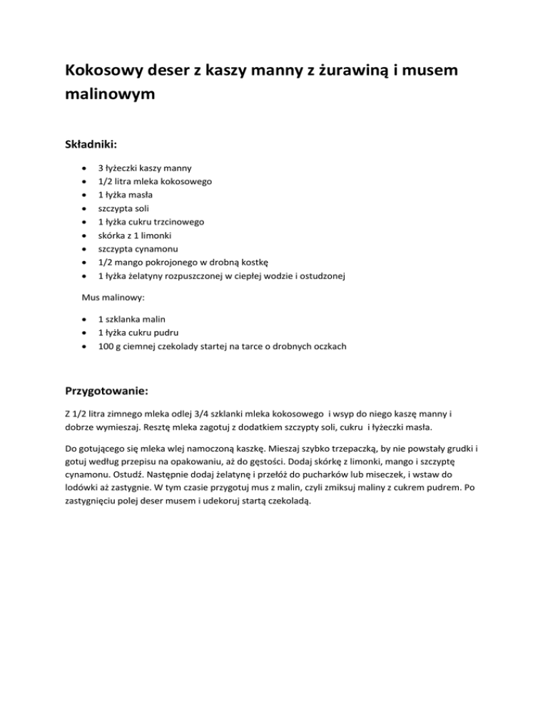 Kokosowy deser z kaszy manny z żurawiną i musem malinowym Składniki: 3 łyżeczki kaszy manny 1/2 litra mleka kokosowego 1 łyżka masła szczypta soli 1 łyżka cukru trzcinowego skórka z 1 limonki szczypta cynamonu 1/2 mango pokrojonego w drobną kostkę 1 łyżka żelatyny rozpuszczonej w ciepłej wodzie i ostudzonej Mus malinowy: 1 szklanka malin 1 łyżka cukru pudru 100 g ciemnej czekolady startej na tarce o drobnych oczkach Przygotowanie: Z 1/2 litra zimnego mleka odlej 3/4 szklanki mleka kokosowego i wsyp do niego kaszę manny i dobrze wymieszaj. Resztę mleka zagotuj z dodatkiem szczypty soli, cukru i łyżeczki masła. Do gotującego się mleka wlej namoczoną kaszkę. Mieszaj szybko trzepaczką, by nie powstały grudki i gotuj według przepisu na opakowaniu, aż do gęstości. Dodaj skórkę z limonki, mango i szczyptę cynamonu. Ostudź. Następnie dodaj żelatynę i przełóż do pucharków lub miseczek, i wstaw do lodówki aż zastygnie. W tym czasie przygotuj mus z malin, czyli zmiksuj maliny z cukrem pudrem. Po zastygnięciu polej deser musem i udekoruj startą czekoladą.